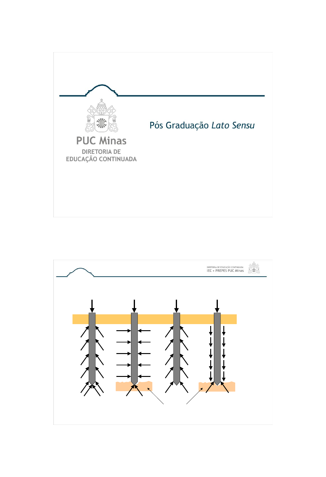03/10/2016 1 Engª. de Estruturas – OF1 – CorEu. Disciplina: FUNDAÇÕES – Módulo 6. Professor: M.Sc. Sérgio Paulino Mourthé de Araujo. Módulo 6 - Determinação da Capacidade de Carga em Estacas Módulo 6 - Determinação da Capacidade de Carga em Estacas P a) b) c) d) P P P Terreno resistente Terreno em curso de consolidação Engº. Sérgio Paulino Mourthé de Araujo - M.Sc em Geotecnia 03/10/2016 2 Índice 1) Introdução 2) Métodos teóricos 3) Métodos semi-empíricos 4) Interação solo-estaca: Exemplos 5) Carga admissível x Carga de catálogo 6) Métodos dinâmicos (negas e repiques) 7) Cargas estruturais das estacas 8) Tópicos complementares Engº. Sérgio Paulino Mourthé de Araujo - M.Sc em Geotecnia 1) Introdução • Capacidade de carga de um elemento de fundação por estaca, em termos geotécnicos: Considere uma estaca qualquer, de comprimento L, instalada no solo: • Com a aplicação gradativa de uma carga P de compressão, progressivamente aumentada (P1 e P2), serão mobilizadas tensões resistentes por adesão ou atrito lateral, entre o solo e o fuste da estaca, e também tensões resistentes normais à base ou ponta da estaca. • Esses termos são relacionadas ao tipo de solo: adesão em argila e atrito em areia, porém, predomina o uso da expressão atrito lateral, qualquer que seja o tipo de solo. • Como hipótese simplificadora, considere que primeiro haja mobilização exclusivamente do atrito lateral até o máximo possível, para depois iniciar a mobilização da resistência de ponta. • Com a evolução do carregamento, aumentarão os recalques da estaca. • No início do carregamento, com P < P1, ocorre uma mobilização parcial (ou incompleta) do atrito lateral ao longo do fuste da estaca. Imaginando a estaca subdividida em segmentos verticais, em cada um deles atua o atrito lateral local, de valor variável ao longo da estaca, em função das características geotécnicas das diferentes camadas e sua profundidade. • Ao avançar o carregamento, em alguns segmentos da estaca começa a haver a máxima mobilização do atrito lateral local, até que, para valor de carga P = P1, o atrito lateral é mobilizado ao máximo em todos os segmentos da estaca. Engº. Sérgio Paulino Mourthé de Araujo - M.Sc em Geotecnia 03/10/2016 3 • A partir daí, o atrito estaca-solo seria vencido e a estaca deslizaria continuamente para baixo. Isso realmente ocorreria caso não tivesse início a mobilização da resistência de ponta. • Nessa condição de ruptura da ligação estaca-solo, temos a atuação do atrito lateral local de ruptura ou atrito unitário (rL, em unidades de tensão), para um segmento qualquer de estaca, com comprimento ΔL (posteriormente vamos associar ΔL à espessura de cada uma das várias camadas de solo que envolvem o fuste da estaca). Nos demais segmentos da estaca, cada um tem seu próprio valor de rL. • Aumentado mais a carga aplicada na estaca, em todos os segmentos da estaca permanece a mobilização máxima do atrito lateral local começando a haver a mobilização gradativa da resistência de ponta. • Finalmente, quando P = P2, o valor da resistência de ponta atinge a sua mobilização possível (rP, em unidades de tensão). Para esse valor de carga, a estaca estaria na eminência de deslocar- se incessantemente para baixo, esgotada que foi a capacidade do sistema de mobilizar a resistência, tanto do atrito lateral local (em cada segmento da estaca) como da resistência de ponta. • Essa condição de recalque incessante, mantida a carga P2, caracteriza a ruptura do elemento de fundação por estaca. • Esse modo de ruptura, que é bem didático para explicar o conceito físico, é denominado ruptura nítida. 1) Introdução Engº. Sérgio Paulino Mourthé de Araujo - M.Sc em Geotecnia • O valor P2 passa a ser representado pela letra R e recebe a denominação de capacidade de carga do elemento de fundação em estaca. • Trata-se do valor da força correspondente à máxima resistência que o sistema pode oferecer ou do valor representativo da condição de ruptura do sistema, em termos geotécnicos. • Na literatura geotécnica ocorre a predominância pela expressão capacidade de carga, mas outras são usadas, como: capacidade de suporte, carga de ruptura, carga última e até capacidade de carga última ou capacidade de carga na ruptura, que seriam pleonasmos. • São utilizados símbolos como PR, PR, Pu, Qu, Pult, Qult etc. R maiúscula quando indica unidades de força; r minúscula quando representa unidades de tensão (rL e rp). • A palavra ruptura tem um significado especial, sem relação com despedaçar ou quebrar a fundação. O que ocorre é o recalque incessante da estaca, o qual só é interrompido se diminuirmos a carga aplicada. • Essa acepção do termo ruptura é restrita à conceituação de capacidade de carga em termos geotécnicos, pela qual o material da estaca é considerado suficientemente resistente para que não haja ruptura da própria estaca. • Entretanto, em determinados casos é possível que a capacidade de carga seja superior à resistência a compressão da estaca. Se isso ocorrer, deve prevalecer como valor limite a resistência da própria estaca, pois, como principio de projeto, deve-se considerar sempre o menor dos dois valores. 1) Introdução Engº. Sérgio Paulino Mourthé de Araujo - M.Sc em Geotecnia 03/10/2016 4 • No entendimento do problema físico da capacidade de carga, pode-se constatar o desenvolvimento de tensões resistentes ao longo do fuste da estaca e junto à sua ponta, o que nos permite separar a resistência em duas parcelas, em unidades de força: a resistência por atrito lateral ou apenas resistência lateral (RL), e a resistência de ponta (Rp). • Iniciando o equacionamento matemático para deduzir a expressão da capacidade de carga, vamos fazer o equilíbrio de forças: • Para obter a parcela da ponta (Rp), basta multiplicar a resist