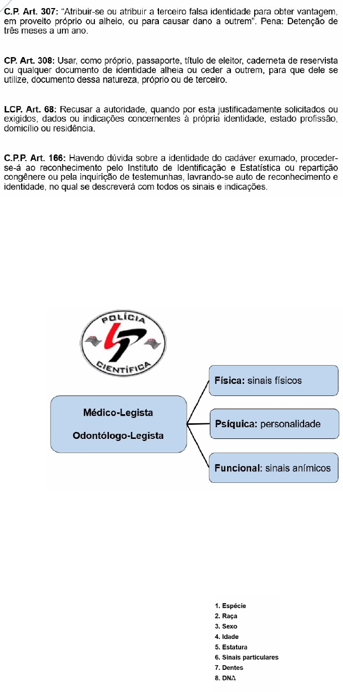 Antropologia Forense Antropologia forense Se preocupa com a identificação humana. IDENTIDADE: · Características individuais + exclusivas · Identidade não é igual a semelhança, que também não é igual a igualdade · Semelhança qualidade · Igualdade quantidade · Identidade = essência · Características/identidade objetivas = características físicas · Características/identidades subjetiva = consciência própria, o que cada se enxerga. IDENTIFICACAO: · Técnica-método- sistema · Para compara características exclusivas · Reconhecimento não é igual a identificação · Reconhecimento não é uma ciência, pode ocorrer erros. Pessoas podem achar que reconhecem alguém, mas podem estar errados. · Identificação é uma ciência que buscar diminuir o numero de erros. · A identificação é vivo, no morto ou no esqueleto · Vivo desaparecido, doente mental, menor de idae, negação da identidade · Morto acidente de massa, cadáver não identificado, putrefação, resto cadavérico · Esqueletos esqueletização, esqueletos osso. · Pode ser feito por médico-legal e policial ou judiciaria. IDENTIFICACAO FISICA: 1. Espécie a. Normalmente utilizado para ossos/esqueletos b. Identificar se é humano ou animal c. Ossos: i. Clavícula humana possui em formato de S, somente o humano possui clavícula nesse formato ii. Canais de Havers são examinados 1. Humano: elíptico, mais largo e número menores 2. Animal: arredondado, mais estreito, número maiores d. Sangue: i. Cristais de Teichmann e Takayama são examinados 1. Hemácias: a. Mamíferos = circular e sem núcleo b. Vertebrados = elíptico e nucleada 2. Para confirmar que é humana com certeza que o sangue é humano é feito o teste de Aglutinacao de Albumina. (se houver aglutinação de albumina podemos confirmar que é sangue humano) 2. Raça: a. Caucasiano i. Pele branca ou trigueira ii. Cabelos ondulados ou lisos, louros ou castanhos iii. Íris azul ou castanha iv. Face ovoide v. Ortognata ou ligeiramente prognata b. Mongólico i. Pele amrela ii. Cabelo lise iii. Íris castanha iv. Face achatada de diante para tras v. Fronte larga e baixa vi. Espaço interobital larga vii. Fenda parpebral ..... c. Australoide i. Pele trigueira esura ii. Cabelos prepts ondulados iii. Íris castanhas iv. Nariz curto v. Zigomas proeminentes vi. Narinas afastadas vii. Prognatismo maxilar d. Indiano i. Pele trigueira ou avermelhada ii. Íris castanhas iii. Cabelos lises e preots iv. Fronte vertical v. Zigomas saliente vi. Nariz saliente, longo e estreito e. Negroide i. Pele negra ii. Cabelos crespos e em tufos iii. Íris castanha ou preta iv. Fornte alta e saienta v. Zimogas salientes vi. Prógnato vii. Nariz pequeno, larga e achatada f. Análise dos elementos raciais de esqueletos: 3. Sexo: a. Sexo morfológico: fenótipo b. Sexo cromossômico: XY – XX c. Sexo gonadal: testículo e ovários d. Sexo comatínico: cromatina celular, existe somente no sexo feminino e. Sexo genitália interna: ducto de wolff masculino – ductos de muller feminino f. Sexo da genitália externa: pênis e escroto – vilvo, vagina e mamas g. Sexo jurídico: registro civil h. Sexo de identificação ou psíquico ou comportamental: identificação própria i. Sexo médico-legal: pericia medica genitália dúbia- ma formação. j. Identificação pelo esqueleto: k. Identificação pelo crânio: l. Identificação pela pelve: 4. Idade: a. Embrião-feto: através da morfologia, estatura, peso RX b. Vivo-cadáver integro: aparência, glóbulo ocular, suturas do crânio, ângulo mandibular, dentes, RX ossos mão e punho – centros epifisários. 5. Estatura: a. Vivo-cadaver integro = medicação direta b. Cadaver não integro – ossos = tabelas osteométricas i. Ossos longos são os mais importante, ajudandam a idetnifacar as estaturas com maior precisao 1. O fêmur é o melhor osso longo de todos para identificar a estatura do individuo 6. Sinais individuais: a. Tatuagens, cicatrizes, sinais profissionais, malformações, antecedejtes médicos 7. Dentes: a. Odontólogo-legal b. Arcada dentaria 8. DNA: a. Sangue, osso, unha, dente, cabelo, saliva, sêmen, etc b. Precisão de 99,9% i. Pode haver erro de amostra por isso não é uma precisão de 100% IDENTIFICACAO POLICIAL OU JUDICIARIA: · Peritos criminais · Não precisa de conhecimento médico · Antropometria + antropologia · Identificar- caracterizar criminoso · Estigmatizar o criminoso · Identificar o criminoso como um. · Método de identificação: · Unicidade- individualidade: específicos, características que não possui igual a outros · Perenidade – uma características que pode passar o tempo, a vida da pessoa, e aquela características não irá mudar. · Imutabilidade - aquela característica individual da pessoa oara identificação sera imutável, não ira mudar. · Praticabilidade · Classificabilidade: metodologia + armazenamento · Sistema de Bertillon não é mais utilizado hoje em dia. · Assinalamento sucinto: sinais que pode identificar as pessoa idade, cor, físico, cabelo, olhos · Fotografia simples e sinaletica: · Fotografia simples: documentos · Sinaletica: frente + perfil · Retrato falado: é o desenho fisionômico, uma testemunha pode eplicaras características de um individuo e assim realizando o desenho · Dactiloscopia · Tem uma eficiência semelhante ao DNA, o DNA acaba sendo um pouco mais eficiente · Polpa digital: crista + sulcos da polpa digital linhas pretas + brancas · Baseada em dois elementos: · Delta: elemento principal. Sistema de três linhas que formam um triangulo · Núcleo: as linhas formam um vórtice · Quatro tipos fundamentais: baseado no número de deltas · Assim ele criou a fórmula dactiloscópica: · Nas impressões digitais temos, furinhos, recortes, etc. específica de cada pessoa