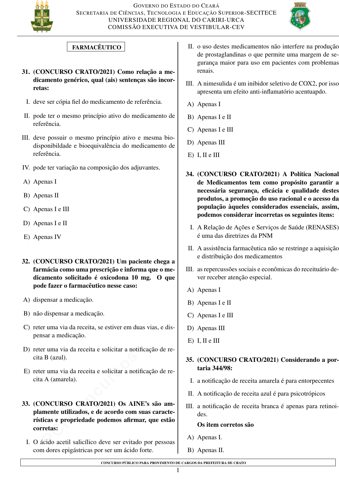 pcimarkpci MjgwNDowMTRjOjY1ODA6NGFhNTplZGM3OmIxOTc6MmZmNDpiOWJm:U2F0LCAxNiBPY3QgMjAyMSAyMzozMTozNSAtMDMwMA== GOVERNO DO ESTADO DO CEARÁ SECRETARIA DE CIÊNCIAS, TECNOLOGIA E EDUCAÇÃO SUPERIOR-SECITECE UNIVERSIDADE REGIONAL DO CARIRI-URCA COMISSÃO EXECUTIVA DE VESTIBULAR-CEV FARMACÊUTICO 31. (CONCURSO CRATO/2021) Como relação a me- dicamento genérico, qual (ais) sentenças são incor- retas: I. deve ser cópia fiel do medicamento de referência. II. pode ter o mesmo princípio ativo do medicamento de referência. III. deve possuir o mesmo princípio ativo e mesma bio- disponibildade e bioequivalência do medicamento de referência. IV. pode ter variação na composição dos adjuvantes. A) Apenas I B) Apenas II C) Apenas I e III D) Apenas I e II E) Apenas IV 32. (CONCURSO CRATO/2021) Um paciente chega a farmácia como uma prescrição e informa que o me- dicamento solicitado é oxicodona 10 mg. O que pode fazer o farmacêutico nesse caso: A) dispensar a medicação. B) não dispensar a medicação. C) reter uma via da receita, se estiver em duas vias, e dis- pensar a medicação. D) reter uma via da receita e solicitar a notificação de re- cita B (azul). E) reter uma via da receita e solicitar a notificação de re- cita A (amarela). 33. (CONCURSO CRATO/2021) Os AINE’s são am- plamente utilizados, e de acordo com suas caracte- rísticas e propriedade podemos afirmar, que estão corretas: I. O ácido acetil salicílico deve ser evitado por pessoas com dores epigástricas por ser um ácido forte. II. o uso destes medicamentos não interfere na produção de prostaglandinas o que permite uma margem de se- gurança maior para uso em pacientes com problemas renais. III. A nimesulida é um inibidor seletivo de COX2, por isso apresenta um efeito anti-inflamatório acentuapdo. A) Apenas I B) Apenas I e II C) Apenas I e III D) Apenas III E) I, II e III 34. (CONCURSO CRATO/2021) A Política Nacional de Medicamentos tem como propósito garantir a necessária segurança, eficácia e qualidade destes produtos, a promoção do uso racional e o acesso da população àqueles considerados essenciais, assim, podemos considerar incorretas os seguintes itens: I. A Relação de Ações e Serviços de Saúde (RENASES) é uma das diretrizes da PNM II. A assistência farmacêutica não se restringe a aquisição e distribuição dos medicamentos III. as repercussões sociais e econômicas do receituário de- ver receber atenção especial. A) Apenas I B) Apenas I e II C) Apenas I e III D) Apenas III E) I, II e III 35. (CONCURSO CRATO/2021) Considerando a por- taria 344/98: I. a notificação de receita amarela é para entorpecentes II. A notificação de receita azul é para psicotrópicos III. a notificação de receita branca é apenas para retinoi- des. Os item corretos são A) Apenas I. B) Apenas II. CONCURSO PÚBLICO PARA PROVIMENTO DE CARGOS DA PREFEITURA DE CRATO 1 pcimarkpci MjgwNDowMTRjOjY1ODA6NGFhNTplZGM3OmIxOTc6MmZmNDpiOWJm:U2F0LCAxNiBPY3QgMjAyMSAyMzozMTozNSAtMDMwMA== GOVERNO DO ESTADO DO CEARÁ SECRETARIA DE CIÊNCIAS, TECNOLOGIA E EDUCAÇÃO SUPERIOR-SECITECE UNIVERSIDADE REGIONAL DO CARIRI-URCA COMISSÃO EXECUTIVA DE VESTIBULAR-CEV C) Apenas III. D) Apenas I e II. E) I, II e III. 36. (CONCURSO CRATO/2021) Você é o farmacêu- tico responsável pela farmácia e chega um paci- ente com uma prescrição de um medicamento x de 100mg por comprimido revestido, e este é um me- dicamento de referencia, porém não está disponível na farmácia o que pode ser feito: I. sugerir o uso do medicamento x na apresentação de 200mg por comprimido revestido sugerindo a divisão do mesmo na metade para obtenção da mesma dose II. oferecer o medicamento x como mesma dose 100mg, na forma de supositório III. ofertar o medicamento genérico do medicamento x. Qual (ais) procedimentos são corretos? A) Apenas I. B) Apenas I e II. C) Apenas I e III. D) Apenas III. E) I, II e III. 37. (CONCURSO CRATO/2021) As reações adversas a medicamentos são classificadas atualmente em quantos tipos: A) 5 B) 6 C) 7 D) 8 E) 9 38. (CONCURSO CRATO/2021) Qual é o processo far- macocinético que suprimido quanto fazemos uso de um medicamento sob forma farmacêutica injetevel: A) Absorção B) Distribuição C) Biotransformação D) Depuração E) Eliminação 39. (CONCURSO CRATO/2021) No Brasil existe a previsão legal para fracionamento de medicamento. De acordo com a legislação vigente é correto afir- mar que: I. Os medicamentos isentos de prescrição podem ser fra- cionados de acordo com a necessidade. II. É permitido o fracionamento de qualquer medica- mento desde que seja para uso no serviço público. III. É permitido o fracionamento concomitante de mais de um medicamento. IV. O medicamento pode ser fracionado desde que a partir de uma embalagem originalmente fracionável A) Apenas I B) Apenas II C) Apenas III D) Apenas IV E) Todas estão corretas 40. (CONCURSO CRATO/2021) De acordo com a le- gislação vigente com relação a dispensação de me- dicamentos da B1 da portaria 344 é correto afirmar que, exceto: A) A notificação de receita B (azul) tem validade de 30 dias B) É válida em todo o território nacional, podendo ser aceita em UF diferente da sua de emissão C) Deve ser acompanhada de um receituário comum. D) Só pode conter apenas um medicamento E) A quantidade pode atender 60 dias de tramento 41. (CONCURSO CRATO/2021) O brometo de piri- dostigmina tem a capacidade de inibir a ação da acetilcolinesterase, promovendo um maior concen- tração e duração da acetilcolina na fenda sináptica. Porém, o seu efeito depende justamente da concen- tração de acetilcolina, assim podemos afirmar que o seu mecanismos de ação é: CONCURSO PÚBLICO PARA PROVIMENTO DE CARGOS DA PREFEITURA DE CRATO 2 pcimarkpci MjgwNDowMTRjOjY1ODA6NGFhNTplZGM3OmIxOTc6MmZmNDpiOWJm:U2F0LCAxNiBPY3QgMjAyMSAyMzozMTozNSAtMDMwMA== GOVERNO DO ESTADO DO CEARÁ SECRETARIA DE CIÊNCIAS, TECNOLOGIA E EDUCAÇÃO SUPERIOR-SECITECE U
