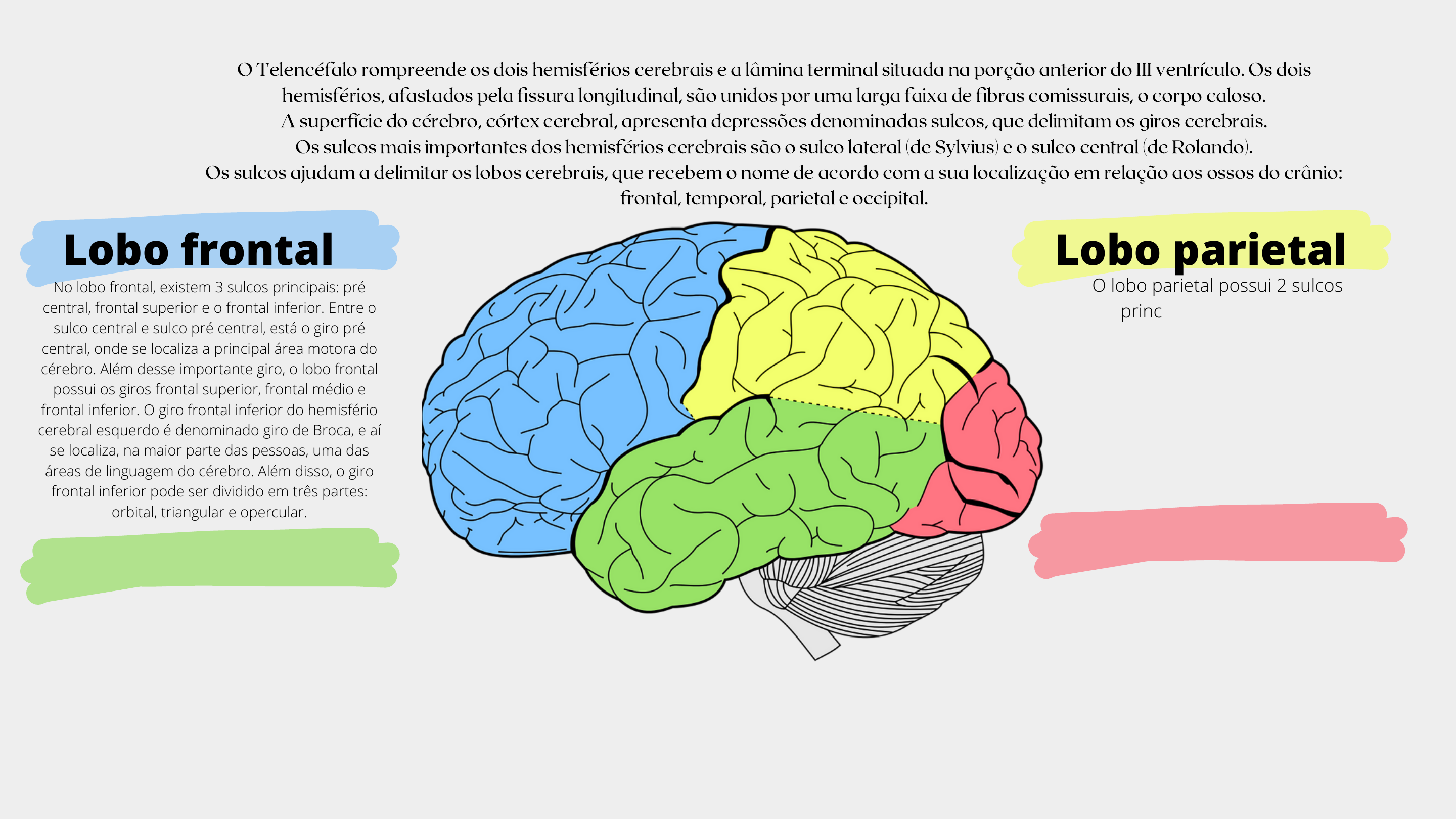 Telencéfalo O Telencéfalo rompreende os dois hemisférios cerebrais e a lâmina terminal situada na porção anterior do III ventrículo. Os dois hemisférios, afastados pela fissura longitudinal, são unidos por uma larga faixa de fibras comissurais, o corpo caloso. A superfície do cérebro, córtex cerebral, apresenta depressões denominadas sulcos, que delimitam os giros cerebrais. Os sulcos mais importantes dos hemisférios cerebrais são o sulco lateral (de Sylvius) e o sulco central (de Rolando). Os sulcos ajudam a delimitar os lobos cerebrais, que recebem o nome de acordo com a sua localização em relação aos ossos do crânio: frontal, temporal, parietal e occipital. Lobo frontal No lobo frontal, existem 3 sulcos principais: pré central, frontal superior e o frontal inferior. Entre o sulco central e sulco pré central, está o giro pré central, onde se localiza a principal área motora do cérebro. Além desse importante giro, o lobo frontal possui os giros frontal superior, frontal médio e frontal inferior. O giro frontal inferior do hemisfério cerebral esquerdo é denominado giro de Broca, e aí se localiza, na maior parte das pessoas, uma das áreas de linguagem do cérebro. Além disso, o giro frontal inferior pode ser dividido em três partes: orbital, triangular e opercular. Lobo parietal O lobo parietal possui 2 sulcos principais: pós central e intraparietal. Além disso, possui 3 giros: pós-central, supramarginal e angular. O giro pós central fica entre os sulcos central e pós- central, onde se localiza uma das mais importantes áreas sensitivas do córtex, a área somestésica. Lobo occipital O lobo occipital se localiza na face dorsolateral do cérebro, ocupando uma área pequena. Apresenta giros e sulcos irregulares. Este lobo cerebral é o de menor crescimento durante o desenvolvimento, por isso fica recoberto pelos lobos vizinhos (frontal, temporal e parietal). Apresenta alguns sulcos e giros, dentre eles: sulco circular da ínsula, sulco central da ínsula, giros curtos e giro longo da ínsula. Lobo temporal No lobo temporal, existem dois sulcos principais: temporal superior e temporal inferior. Neste lobo, evidencia-se a área da audição localizada no giro temporal transverso anterior, que é a porção posterior do giro temporal superior, visível afastando-se os lábios do sulco lateral. Os giros existentes no lobo temporal são giro temporal superior, giro temporal médio, giro temporal inferior e giros temporais transversos.