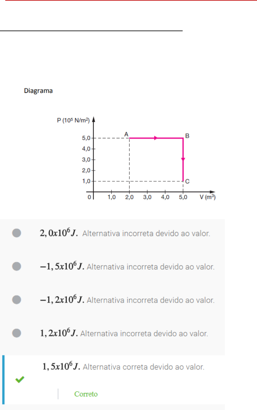 Atividade 3 - TERMODINÂMICA E REAÇÕES QUÍMICAS QUESTAO 1 DE 5 ATIVIDADE DE MULTIPLA ESCOLHA O diagrama em anexo representa a transformação que um gás ideal sofre, indo do estado A até o estado C, passando pelo estado B. Calcule o trabalho realizado por este gás. QUESTAO 2 DE 5 ATIVIDADE DE MULTIPLA ESCOLHA Uma massa de um gás ideal realiza uma dilatação isotérmica. Nesse sistema pode-se afirmar que: 1. A pressão aumenta e a energia interna diminui. 2. A pressão e o volume se mantêm constante. 3. O volume diminui e a energia interna permanece constante. 4. O volume e a energia interna aumentam. 5. A energia interna permanece constante e o volume aumenta Correto QUESTAO 3 DE 5 ATIVIDADE DE MULTIPLA ESCOLHA Um corpo recebe 40 joules de calor de outro corpo e rejeita 10 joules para o ambiente. Simultaneamente, o corpo realiza um trabalho de 200 joules. Baseando-se na primeira lei da Termodinâmica, estabeleça o que acontece com a temperatura do corpo em estudo 1. Diminui Correto 2. Aumenta 1/5 3. Não altera 4. Reduz 1/5 5. Aumenta QUESTAO 4 DE 5 ATIVIDADE DE MULTIPLA ESCOLHA Uma taxa de calor de 2 kW é conduzida através de um material isolante com área de seção reta de 15 m2 e espessura de 1,5 cm. Se a temperatura da superfície interna (mais quente) é de 215oC e a condutividade térmica do material é de 0,12 W/mK, qual a temperatura da superfície externa? 1. 471 °C 2. 20 °C 3. 68 °C 4. 98 °C 5. 198 °C Correto Bons Estudos J.R QUESTAO 5 DE 5 ATIVIDADE DE MULTIPLA ESCOLHA Um forno de uma pizzaria é constituída de dois materiais, sendo um tijolo condutor medindo 0,30 m (k = 1,4 kcal/h.m.oC) e um 0,15 m de tijolo isolante (k = 0,20 kcal/h.m.oC). A temperatura da superfície interna do refratário é 1275 oC e a temperatura da superfície externa do isolante é 120 oC. Desprezando a resistência térmica das juntas de argamassa, calcule o calor perdido por unidade de tempo e por m2 de parede. 1. 5473 Kcal 2. 3589 Kcal 3. 1999 Kcal 4. 2387 Kcal 5. 1198 Kcal Correto