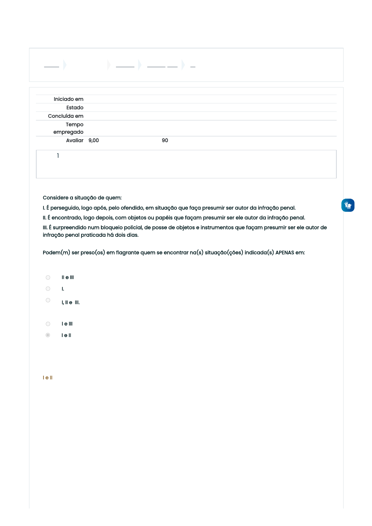 17/10/21, 11:48 V1: Revisão da tentativa https://ead.universo.edu.br/mod/quiz/review.php?attempt=1143887&cmid=318584 1/7 Painel Meus cursos N5161D1 AVALIAÇÕES V1 Iniciado em quarta, 29 set 2021, 09:23 Estado Finalizada Concluída em quarta, 29 set 2021, 10:00 Tempo empregado 37 minutos 20 segundos Avaliar 9,00 de um máximo de 10,00(90%) Questão 1 Correto Atingiu 1,00 de 1,00 Considere a situação de quem: I. É perseguido, logo após, pelo ofendido, em situação que faça presumir ser autor da infração penal. II. É encontrado, logo depois, com objetos ou papéis que façam presumir ser ele autor da infração penal. III. É surpreendido num bloqueio policial, de posse de objetos e instrumentos que façam presumir ser ele autor de infração penal praticada há dois dias. Podem(m) ser preso(os) em flagrante quem se encontrar na(s) situação(ções) indicada(s) APENAS em: a. II e III b. I. c. I, II e III. d. I e III e. I e II Sua resposta está correta. A resposta correta é: I e II https://ead.universo.edu.br/my/ https://ead.universo.edu.br/course/view.php?id=7792 https://ead.universo.edu.br/course/view.php?id=7792#section-2 https://ead.universo.edu.br/mod/quiz/view.php?id=318584 17/10/21, 11:48 V1: Revisão da tentativa https://ead.universo.edu.br/mod/quiz/review.php?attempt=1143887&cmid=318584 2/7 Questão 2 Correto Atingiu 1,00 de 1,00 Questão 3 Correto Atingiu 1,00 de 1,00 Assinale a assertiva incorreta: a. A lei que dispõe sobre o Juizado Especial Criminal possibilita a oposição, mesmo oral, de embargos declaratórios b. A denúncia oferecida sem rol de testemunhas não poderá ser recebida, uma vez que, neste caso, a ação penal estará, inevitavelmente, fadada à improcedência c. É dispensado o relatório na sentença prolatada em sede de Juizados Especiais Federais d. Durante o prazo de suspensão do processo previsto na Lei no 9.099/1995 (Lei dos Juizados Especiais), não fluirá o prazo prescricional e. O procedimento previsto na Lei 9.099/95 é o sumaríssimo. Sua resposta está correta. A resposta correta é: A denúncia oferecida sem rol de testemunhas não poderá ser recebida, uma vez que, neste caso, a ação penal estará, inevitavelmente, fadada à improcedência A respeito de prisão em flagrante, assinale a opção correta. a. A ausência de testemunhas da infração impede a lavratura do auto de prisão em flagrante b. A prisão de qualquer pessoa e o local onde se encontre devem ser comunicados à família do preso em até 24 horas após a realização da prisão c. O flagrante esperado é ilegal d. O auto de prisão em flagrante deve ser encaminhado ao juiz competente em até vinte e quatro horas após a realização da prisão e. Não pode ser preso em flagrante aquele que é perseguido logo após cometer a infração, mesmo que se presuma ser ele o autor da infração Sua resposta está correta. A resposta correta é: O auto de prisão em flagrante deve ser encaminhado ao juiz competente em até vinte e quatro horas após a realização da prisão 17/10/21, 11:48 V1: Revisão da tentativa https://ead.universo.edu.br/mod/quiz/review.php?attempt=1143887&cmid=318584 3/7 Questão 4 Correto Atingiu 1,00 de 1,00 Questão 5 Incorreto Atingiu 0,00 de 1,00 O direito à prisão especial: a. Ocorre durante apenas a instrução preliminar b. Ocorre apenas até o trânsito em julgado da sentença condenatória c. Ocorre durante toda a instrução e execução. d. Ocorre durante apenas a execução da sentença. e. Ocorre apenas até a sentença condenatória recorrível Sua resposta está correta. A resposta correta é: Ocorre apenas até o trânsito em julgado da sentença condenatória Assinale a alternativa INCORRETA a. A prisão temporária poderá ser decretada em face de requerimento do Ministério Público. b. A prisão temporária poderá ser decretada apenas na fase investigatória. c. A prisão temporária não poderá ser decretada de ofício pelo juiz. d. A prisão temporária poderá ser decretada em face de representação da autoridade policial, de requerimento do Ministério Público ou de ofício pelo juiz e. A prisão temporária poderá ser decretada em face de representação da autoridade policial. Sua resposta está incorreta. A resposta correta é: A prisão temporária poderá ser decretada em face de representação da autoridade policial, de requerimento do Ministério Público ou de ofício pelo juiz 17/10/21, 11:48 V1: Revisão da tentativa https://ead.universo.edu.br/mod/quiz/review.php?attempt=1143887&cmid=318584 4/7 Questão 6 Correto Atingiu 1,00 de 1,00 Questão 7 Completo Atingiu 2,00 de 2,00 O flagrante prorrogado, retardado ou diferido ocorre quando: a. Não se prende o autor imediatamente, pois se espera que ele cometa o crime mais grave para, então, prendê-lo. b. O flagrante é forjado. c. O flagrante é impróprio. d. O agente é levado ardilosamente a cometer o fato para ser preso. e. O agente não é induzido a praticar o crime Sua resposta está correta. A resposta correta é: Não se prende o autor imediatamente, pois se espera que ele cometa o crime mais grave para, então, prendê- lo. Caio, Mévio, Tício e José, após se conhecerem em um evento esportivo de sua cidade, resolveram praticar um estelionato em detrimento de um senhor idoso de 74 anos. Logrando êxito em sua empreitada criminosa, os quatro dividiram os lucros e continuaram a vida normal. Ao longo da investigação policial, apurou-se a autoria do delito por meio dos depoimentos de diversas testemunhas que presenciaram a fraude. Em decorrência de tal informação, o promotor de justiça denunciou Caio, Mévio, Tício e José, alegando se tratar de uma associação criminosa de estelionatários, tendo requerido a decretação da prisão temporária dos denunciados. Recebida a denúncia, a prisão temporária foi deferida pelo juízo competente. Qual o meio de se impugnar tal decisão e quais fundamentos deverão ser alegados? Responda empregando os 