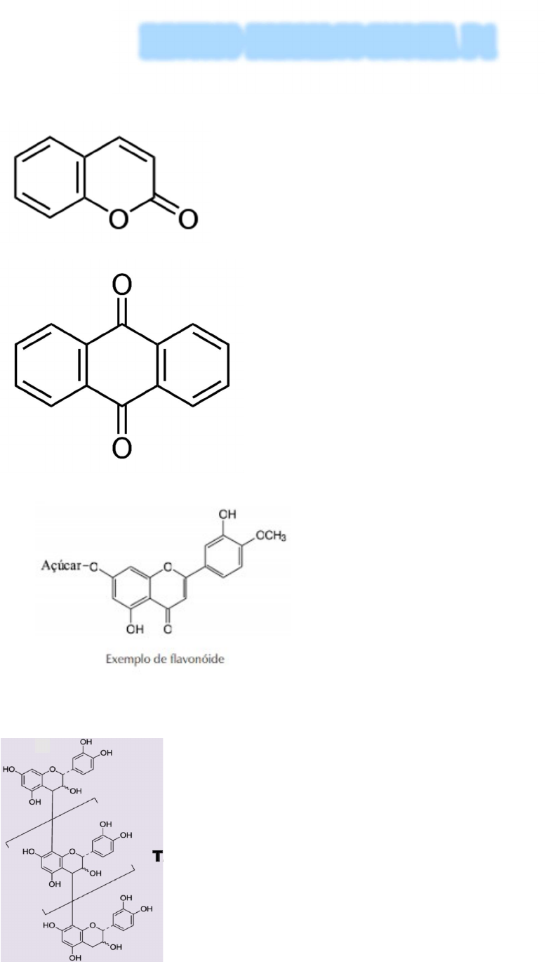 RESUMO FARMACOGNOSIA P1 COMPOSTOS FENÓLICOS CUMARINA ANTRAQUINONA FLAVONOÍDE TANINOS CONDENSADOS TANINO HIDROLISADO VIA DOS FENÓIS Origem dos flavonoides: a fenilalanina amônio liase retira uma amônia de fenilamina formando ácido cinâmico. Este é oxidado a ácido-cumárico, onde sofre processo de hidroxilação a ácido-2,4-hidróxido-cinâmico, e conjuga com Acetil CoA resultando em 4-hidroxi-cinamoil-CoA. O Ácido gálico se conjuga com monômeros de glucose dando origem ao pentagaloilglucose de ácido gálico. Considerado o precursor dos taninos hidrolisáveis. FOTOSSÍ NTESE GLICOLÍSE GLICOLÍSE FOSFO ENOLIPIRUVATO ERITROSE 4 FOSFATO ÁCIDO CHIQUIMICO CICLO DAS PENTOSES O processo de conjugação da catequina e epicatequina formam os trimeros de catequina ou taninos condensados. Composto fenólico Plantas Teste Resultado FLAVONOIDES Ginkgo (Folhas) Passiflora (Folhas) Shinoda Mg/H+ pH: 1-2 Vermelho pH 6-8 Roxo ph 9 Azul pH11 Verde pH 14 Amarelo CUMARINAS Cumaru (Semente) Guaco (Folhas)- expectorante e broncodilatador Sene (Frutas) Reação de KOH+ UV360nm + Azul ANTRAQUINONAS Cáscara Sagrada (Cascas) Babosa (Folhas) Reação de Borntrager (NH4 OH) Forma: Fenolato de Amônia + Vermelho Cereja TANINOS CONDENSADOS Espinheira- santa (Folhas) FeCl3 + Verde TANINOS HIDROLISÁVEIS Hamamélis (Folhas) FeCl3 + Azul CUMARINAS REAÇÃO DE IDENTIFICAÇÃO DAS CUMARINAS O guaco não deve ser empregado simultaneamente com anticoagulantes, pois as cumarinas podem potencializar seus efeitos e antagonizar o da vitamina k. ANTRAQUINONA Compostos oxigenados formados a partir da oxidação de fenóis Via- Acetil CoA Identificação: reação de Bornträger = coloração das quinonas em meio alcalino 1,8 dihidroxi-antraquinonas =vermelha; 1,2 dihidroxi-antraquinonas = azul-violeta; IMPORTANTE: reação positiva apenas para antraquinonas livres. ação farmacológica principal: LAXATIVA (a intensidade é dependente da dose) Atualmente se conhecem 3 mecanismos de ação: estimulação direta da contração da musculatura lisa do intestino, aumentando a motilidade intestinal (possivelmente relacionado com a liberação ou com o aumento da síntese de histamina ou outros mediadores); inibição da reabsorção de água, sódio e cloro através da inativação da bomba de Na+/K+ - ATPase, (aumentando a secreção de potássio); inibição dos canais de Cl-, comprovada para inúmeros 1,8-hidróxi- antranóides (antraquinonas e antronas) SENE introduzido na medicina pelos árabes no século IX ou X; principais componentes ativos: glicosídeos diméricos(diantronas): senosídeos A e B; Farm. Bras. IV: frutos dessecados devem conter no mínimo, 4% de derivados hidroxiantracênicos, calculados em senosídeo A; folíolos dessecados devem conter, no mínimo, 2,5% de glicosídeos, calculados em senosídeo B. CÁSCARA-SAGRADA originária das regiões montanhosas dos EUA e Canadá; devem ser aquecidos a 100oC por 1 a 2 hs ou estocados por no mínimo 1 ano antes do uso; contém aprox. 6% de derivados hidroxiantracênicos, dos quais 60% de cascarosídeos; 80 a 90% são C-glicosídeos e 10 a 20% são O-glicosídeos; os cascarosídeos A, B, C e D são O-glicosídeos e C- glicosídeos (8-O-,10- C-diglicosídeos). FLAVONOÍDES São uma classe de compostos fenólicos que diferem entre si pela sua estrutura química e características particulares. FUNÇÃO NAS PLANTAS: 1. Proteção contra raios UV 2. Proteção contra microorganismos 3. Atraem animais para polinização 4. Antioxidantes 5. Agentes alelopáticos 6. Inibição enzimática PROPRIEDADES FARMACOLÓGICAS Atividade antiviral: atividade virucida, inibição da replicação e transcriptase reversa (quercetina, diosmina, hesperidina, baicaleína) Atividade antioxidantes: são antioxidantes efetivos devido à suas propriedades sequestrantes de radicais livres e por quelar íons metálicos, impedindo-os de atuarem como catalisadores na produção de radicais livres (quercetina, isorramnetina, ramnozina). Atividade antiinflamatória: inibem a COX-2 e a liberação de substâncias endógenas que promovem a inflamação (apigenina, canferol, antocianidinas). Atividade sobre a permeabilidade capilar: diminuem a fragilidade capilar e aumentam sua resistência em distúrbios circulatórios (hesperidina, quercetina, rutina) São denominadas O-heterosídeos quando a molécula de açúcar é ligada ao grupo hidroxila na posição C3 ou C7. Os açúcares mais comuns são D-glicose e L-ramnose. Nos flavonóides C-heterosídeos a ligação é feita entre o carbono C-1 do açúcar e um ou dois carbonos (6 e/ou 8) do anel A do flavonóide. Reação da cinidina, de Shinoda ou hidrogenação -Adicionar na sol. alcoólica um pequeno fragmento de Mg. Os derivados flavônicos de cor amarela reduzem-se adquirindo cor avermelhada, ou no caso dos antociânicos cor azulada. O teste é negativo para chalconas e isoflavonas. GINKO árvore de origem oriental, considerada fóssil vivo, cultivada em muitos países. Entre outros compostos, possui flavonóides (cerca de 20 glicosídeos flavônicos) e terpenos (mono, di e sesqui), destacando-se os diterpenos denominados ginkgolídeos A, B, C e J (e M nas raízes). MARACUJA- Passiflora largamente utilizado como sedativo, apesar de que ainda não está muito claro os responsáveis por essa atividade. possui ácidos fenólicos, cumarinas, fitosteróis, maltol, glicosídeos cianogenéticos, alcalóides indólicos (harmano, harmol e harmina) e numerosos flavonóides (C-glicosídeos flavônicos) como a vitexina. TANINOS interações hidrofóbicas e pontes de hidrogênio entre os agrupamentos fenólicos dos taninos e as proteínas e outros polímeros. Formação de complexos que precipitam Taninos hidrolisáveis: • ésteres de glucose (ou compostos semelhantes) e de ácidos fenólicos: ác. gálico (taninos gálicos) ou ác. hexahidroxidifênico e seus derivados (taninos elágicos). • podem ser hidrolisados por ácidos ou enzimas. Taninos cond