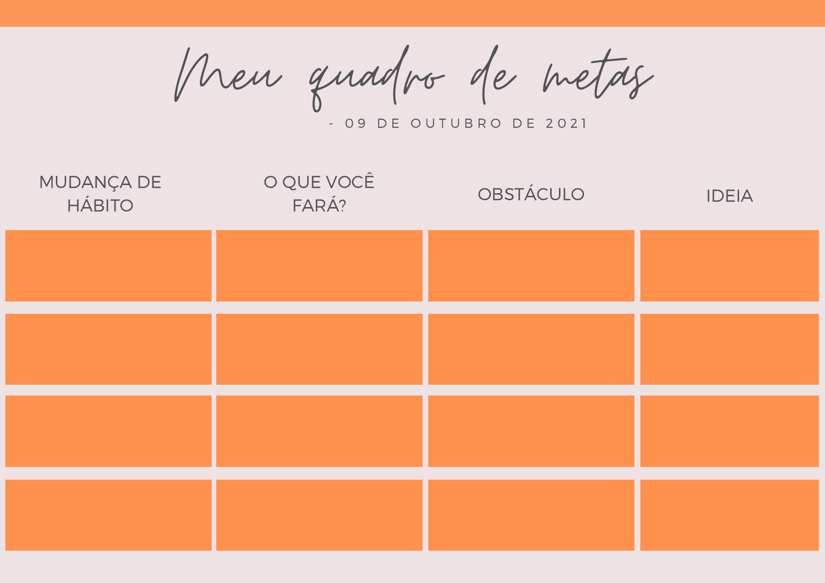MUDANÇA DE HÁBITO Meu quadro de metas - 0 9 D E O U T U B R O D E 2 0 2 1 O QUE VOCÊ FARÁ? OBSTÁCULO IDEIA Monitoramento nutrivional DIAGNÓSTICO NUTRICIONAL: OBJETIVOS DA DIETA : QUADRO ACOMPANHAMENTO AVALIAÇÃO NUTRICIONAL DATA PESO IMC CB CC DCT ALTURA diário alimnetar check SEG TER QUA QUI SEX SÁB DOM EXERCÍCIO FÍSICO INGESTÃO HIDRÍCA HUMOR REALIZOU TODAS AS REFEIÇÕES
