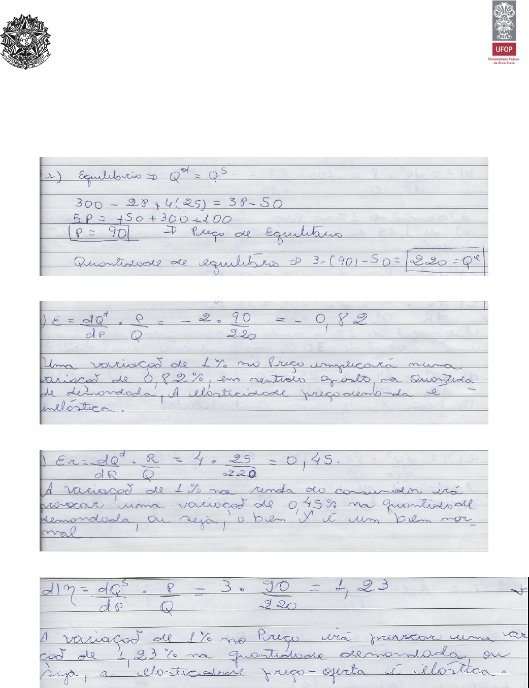 MINISTÉRIO DA EDUCAÇÃO UNIVERSIDADE FEDERAL DE OURO PRETO – UFOP DEPARTAMENTO DE CIÊNCIAS ECONÔMICAS– DEECO 1ª Lista de Exercício ECO 130 – Microeconomia I Profª Cristiane Santos 1 1. Suponhamos que a curva da demanda por um produto seja dada por Q = 300 – 2P + 4R, em que R é a renda média medida em milhares de dólares. A curva da oferta é Q = 3P – 50. a) Se R = 25, calcule o preço e a quantidade de equilíbrio de mercado para o produto. b) Calcular a elasticidade-preço da demanda e dê a interpretação econômica do coeficiente obtido. c) Calcular a elasticidade-renda da demanda e dê a interpretação econômica do coeficiente obtido. d) Calcular a elasticidade-preço da oferta e dê a interpretação econômica do coeficiente obtido. 2) Considere as seguintes funções de demanda e oferta de mercado de certo produto X: MINISTÉRIO DA EDUCAÇÃO UNIVERSIDADE FEDERAL DE OURO PRETO – UFOP DEPARTAMENTO DE CIÊNCIAS ECONÔMICAS– DEECO 1ª Lista de Exercício ECO 130 – Microeconomia I Profª Cristiane Santos 2 Demanda: Qdx= 1200-100PX + 2 R + 5PY Oferta: QSX= -600 + 150PX. Em que PX é o preço de X, PY é o preço do bem Y, R é a renda, e Qdx é a quantidade demandada de X e QSX é a quantidade ofertada de X. Sendo R = 100 e PY = 25, pede-se: a) O preço e quantidade de equilíbrio. b) Calcular a elasticidade-preço da demanda e dê a interpretação econômica do coeficiente obtido. c) Calcular a elasticidade-renda da demanda e dê a interpretação econômica do coeficiente obtido. d) Calcular a elasticidade-cruzada da demanda e classifique os bens X e Y. e) Calcular a elasticidade-preço da oferta e dê a interpretação econômica do coeficiente obtido. MINISTÉRIO DA EDUCAÇÃO UNIVERSIDADE FEDERAL DE OURO PRETO – UFOP DEPARTAMENTO DE CIÊNCIAS ECONÔMICAS– DEECO 1ª Lista de Exercício ECO 130 – Microeconomia I Profª Cristiane Santos 3 3. Suponha que determinada empresa tem a seguinte equação de demanda de seu produto: Q = 486 -3,6P. Pede-se: a) Calcule a elasticidade preço da demanda para Preço=70,00 e interprete o resultado encontrado. b) Calcule Preço para o qual a Elasticidade é Unitária (isto é, Ed = −1 ) MINISTÉRIO DA EDUCAÇÃO UNIVERSIDADE FEDERAL DE OURO PRETO – UFOP DEPARTAMENTO DE CIÊNCIAS ECONÔMICAS– DEECO 1ª Lista de Exercício ECO 130 – Microeconomia I Profª Cristiane Santos 4 4) Explique por que não pode haver intersecção entre duas curvas de indiferença. A resposta pode ser apresentada mais facilmente com a ajuda de um gráfico como o da Figura 3.1, que mostra duas curvas de indiferença com intersecção no ponto A. A partir da definição de uma curva de indiferença, sabemos que um consumidor obtém o mesmo nível de utilidade em qualquer ponto sobre uma determinada curva. Nesse caso, o consumidor é indiferente às cestas A e B, pois ambas estão localizadas sobre a curva de indiferença U1. Analogamente, o consumidor é indiferente às cestas A e C porque ambas estão localizadas sobre a curva de indiferença U2. A propriedade de transitividade das preferências implica que tal consumidor também deverá ser indiferente a C e B. No entanto, de acordo com o gráfico, C está situada acima de B, de modo que deve ser preferível C a B. Assim, está provado que não pode haver intersecção entre duas curvas de indiferença. MINISTÉRIO DA EDUCAÇÃO UNIVERSIDADE FEDERAL DE OURO PRETO – UFOP DEPARTAMENTO DE CIÊNCIAS ECONÔMICAS– DEECO 1ª Lista de Exercício ECO 130 – Microeconomia I Profª Cristiane Santos 5 Bem Y Bem X A C B U1 U2 Figura 3.1 5. Jon está sempre disposto a trocar uma lata de Coca-Cola por uma lata de Sprite, ou uma lata de Sprite por uma de Coca-Cola. a. O que você pode dizer sobre a taxa marginal de substituição de Jon? A taxa de marginal de substituição de Jon pode ser definida como o número de latas de Coca- Cola de que ele deseja abrir mão em troca de uma lata de Sprite. Uma vez que ele sempre deseja trocar uma pela outra, sua TMS é igual a 1. b. Trace um conjunto de curvas de indiferença para Jon. Uma vez que Jon sempre deseja trocar uma lata de Coca-Cola por uma de Sprite, suas curvas de indiferença são lineares com inclinação de –1. c. Trace duas linhas de orçamento com diferentes inclinações e explique a escolha maximizadora da satisfação. A que conclusão você pode chegar? As curvas de indiferença de Jon são lineares com inclinação de –1. A linha do orçamento de Jon também é linear e tem uma inclinação que reflete a razão entre os dois preços. Se a linha do orçamento de Jon for mais inclinada do que suas curvas de indiferença, então ele escolherá consumir apenas o bem do eixo vertical. Se a linha do orçamento de Jon for menos inclinada do que suas curvas de indiferença, então ele escolherá consumir apenas o bem do eixo horizontal. Jon só não escolherá uma solução de canto se sua linha do orçamento tiver a mesma inclinação de suas curvas de indiferença. Neste caso, qualquer combinação de Sprite e Coca-Cola que consuma toda a sua renda vai maximizar sua satisfação. 6. O que acontece com a taxa marginal de substituição à medida que você se desloca ao longo de uma curva de indiferença convexa? E de uma curva de indiferença reta? A TMS mede a quantidade de um bem de que você está disposto a abrir mão em troca de mais uma unidade do outro bem, mantendo a utilidade constante. A TMS diminui ao longo de uma curva de indiferença convexa, pois, à medida que você se move para baixo ao longo da curva MINISTÉRIO DA EDUCAÇÃO UNIVERSIDADE FEDERAL DE OURO PRETO – UFOP DEPARTAMENTO DE CIÊNCIAS ECONÔMICAS– DEECO 1ª Lista de Exercício ECO 130 – Microeconomia I Profª Cristiane Santos 6 de indiferença, deseja abrir mão de uma quantidade cada vez menor do bem em troca do outro. A TMS é também a inclinação da curva de indiferença, que aumenta (torna-se menos negativa) à medida que você se move para baixo a
