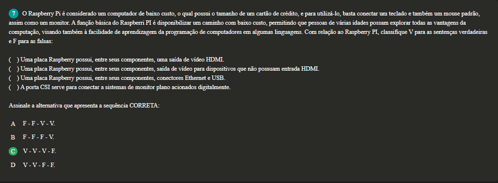 O Raspberry Pi é considerado um computador de baixo custo, o qual possui o tamanho de um cartão de crédito, e para utilizá-lo, basta conectar um teclado e também um mouse padrão, assim como um monitor. A função básica do Raspberry Pi é disponibilizar um caminho com baixo custo, permitindo que pessoas de várias idades possam explorar todas as vantagens da computação, visando também à facilidade de aprendizagem da programação de computadores em algumas linguagens. Com relação ao Raspberry PI, classifique V para as sentenças verdadeiras e F para as falsas: ( ) Uma placa Raspberry possui, entre seus componentes, uma saída de vídeo ( ) Uma placa Raspberry possui, entre seus componentes, saída de vídeo para dispositivos que não possuam entrada ( ) Uma placa Raspberry possui, entre seus componentes, conectores Ethernet e USB. ( )A porta CSI serve para conectar a sistemas de monitor plano acionados digitalmente. Assinale a alternativa que apresenta a sequência CORRETA: A F-F-V-V. B F-F-F-V. C V-V-V-F. D