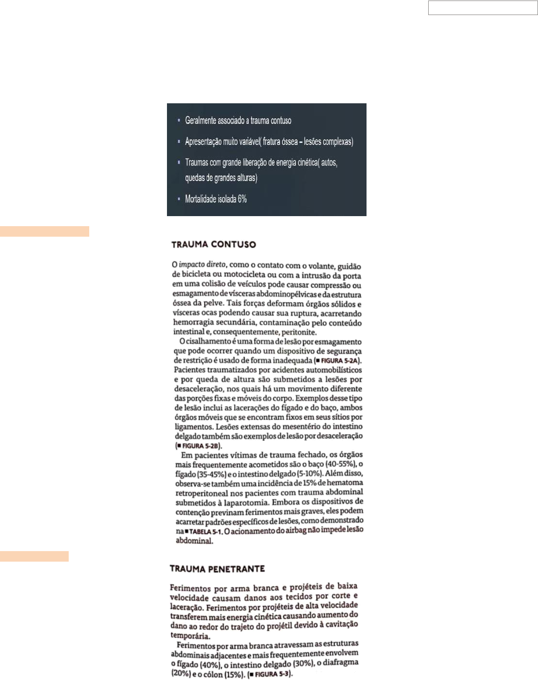 Fraturas de pelve geralmente resultam de traumas de alta energia e, em cerca de 90% dos casos, há lesões associadas1,2. É necessário um impacto frontal a pelo menos 50 km/h ou lateral a 40 km/h para comprometer a integridade do anel pélvico3,4. Em cerca de 72% dos casos, as fraturas ocorrem em veículos compactos, cada vez mais comuns nos congestionados centros urbanos 5,6. Considerando todas as fraturas em traumatizados, os ossos da pelve são acometidos em apenas 3% das vezes 7. Cerca de 10% das fraturas pélvicas podem ser classificadas como "complexas", caracterizando-se por instabilidade mecânica, hemodinâmica e presença de lesões em outros segmentos corporais . O que é trauma contuso? Trauma penetrante LARISSA RODRIGUES SANTOS TRAUMA PÉLVICO segunda-feira, 18 de outubro de 2021 08:15 Página 1 de ALTS Trauma por explosão Artéria mesentérica superior dá origem a retal superior, que gera um plexo vascular muito amplo, que pode gerar um sangramento muito amplo e levar a um sangramento muito amplo e levar o paciente ao choque. Página 2 de ALTS Ligamento sacro ilíaco posterior e sacro tuberal: São constituídos por tecido conjuntivo fibroso, responsável por manter o anel pélvico íntegro. Página 3 de ALTS Uretrorragia: toque vaginal ou retal (nesse caso, avaliar posição da próstata). Página 4 de ALTS Sempre feito pelo indivíduo mais experiente da equipe e não se deve repetir muitas vezes, porque pode agravar algum tipo de lesão.- Avaliar pulsos poplíteos, tibiais - compressão pode gerar isquemia de MMII.- Avaliar principalmente junção sacro ilíaca (azul), fossa acetabular (lilás), sínfise púbica (rosa).- Página 5 de ALTS Preservar vias aéreas e controle hemodinâmico = estável = mais tempo para exames!- Página 6 de ALTS Leva em consideração o mecanismo do trauma!- LC: Atropelamento APC: Esmagamento Página 7 de ALTS Página 8 de ALTS Se não tiver o estabilizador, amarrar um lençol circuferencialmente na altura dos trocanteres, para que esses focos de fratura não causem mais problemas! - Página 9 de ALTS Passada a fase inicial de atendimento, o paciente passa por um tratamento de estabilização, podendo ser uma conduta conservadora ou o uso de fixadores externos. - Se conclui que não tem nada abdominal como ultrassom, TC, e o lavado peritoneal para ver se vêm sangue, para excluir causas também abdominais, podendo concluir que o paciente apresenta apenas lesão pélvica, necessitando de uma atendimento para estancar a hemorragia da pelve. - Se consegue obstruir sangramentos arteriais de ramos pélvicos, utilizado em diversas situações, com sangramentos acessíveis, colocando através da punção arterial micropartículas que irão entupir o vaso e parar o sangramento. Não é um procedimento simples, requer um cirurgião vascular ou radiologista intervencionista, indicado em situações instáveis e indicado na avaliação tomográfica quando há extravasamento de contraste. - Página 10 de ALTS Localizar extravasamento de sangue e colocação de micro partículas para parar o sangramento.- Página 11 de ALTS O pênis é formado por um corpo esponjoso (em seu interior se encontra a uretra - região ventral) e dois corpos cavernosos (região dorsal). Em volta do corpo cavernoso existe a túnica albugínea do corpo cavernoso (mais grossa) e também existe túnica albugínea do corpo esponjoso. A artéria profunda do pênis leva sangue ao corpo cavernoso e quando ele se enche de sangue ele distende a túnica albugínea e com isso ocorre um pressão na veia, ou seja, o sangue chega mas não consegue sair e isso promove a ereção. Quando o estímulo acaba, as artérias diminuem a irrigação e com isso a veia não está pressionada e o pênis volta ao seu estado normal. O pênis é preso a estruturas do quadril e a membrana branca perineal. A parte do corpo cavernoso presa ao osso do quadril, é chamada de raiz do pênis (ramo do pênis) e no corpo esponjoso, é chamado de bulbo do pênis (dilatação do corpo esponjoso). Página 12 de ALTS - Determina a lesão do corpo cavernoso e consequente hematoma, está relacionada com encurvamento durante a ereção, com "estalo" durante a relação sexual, rápida detusmescência e equimose, feito exclusivamente pela inspeção. Como suspeitar? Página 13 de ALTS - Associação maior com lesão uretral, relacionado com crimes, automutilação e pacientes psiquiátricos. O tratamento é a tentativa de reimplantação com reparo microvascular. A anatomia... Página 14 de ALTS - Cistostomia: palpa a região subrapúbica e acha a bexiga e quanto mais cheia, mais fácil de fazer, punciona a bexiga e se coloca uma sonda de Folley dentro da bexiga, polpando a uretra, feita por punção. - Paciente vai ser encaminhado para um centro de referência e tratado de forma definitiva, o urologista faz o realinhamento endoscópico em até 2 semanas, diminuindo o risco de estenose, entre outras coisas. Página 15 de ALTS - Realização de reparo imediato, com colocação de sonda vesical de demora. - Queda a cavaleiro: individuo cai, com esmagamento da uretra bulbar contra o osso púbico, sendo a típica lesão da uretra anterior, com sangue no meato, as vezes associado a hematúria e equimose perineal. - Usa-se cistografia miccional e com o urologista, usa-se uretoplastia. Página 16 de ALTS - Consiste em injetar contraste através da uretra peniana, pode gerar extravasamento do contraste, importante para diagnóstico de lesão de uretra. - Pancada na região testicular, relacionada com trauma fechado. - Na lesão testicular pode haver acúmulo de sangue. - Dor súbita relacionada com náuseas e vômitos. Página 17 de ALTS - Cúpula vesical: intraperitoneal - Ósteros dos ureteres - Região do trígono Página 18 de ALTS - Lesão de bexiga isolada, colocar sonda vesical, no sentido de dar repouso para bexiga, acabando por fechar o ferimento, ficando com a sonda de 7 a 10 dias. - Lesões grandes, maiores do que 2 cm