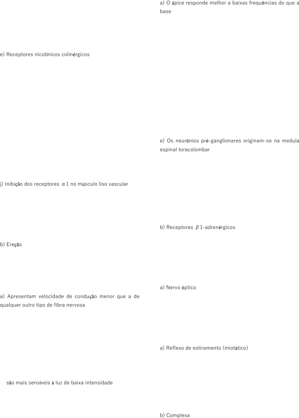 1. Que receptor autônomo é bloqueado pelo hexametônio nos gânglios, mas não na junção neuromuscular? a) Receptores α-adrenérgicos b) Receptores β1-adrenérgicos c) Receptores β2-adrenérgicos d) Receptores muscarínicos colinérgicos e) Receptores nicotínicos colinérgicos 2. Um homem de 66 anos de idade com hipertensão crônica é tratado com prazosina pelo seu médico. O tratamento consegue diminuir a pressão arterial para a faixa da normalidade. Qual é o mecanismo de ação desse fármaco? a) Inibição dos receptores β1 no nó sinoatrial (SA) b) Inibição dos receptores β2 no nó SA c) Estimulação dos receptores muscarínicos no nó SA d) Estimulação dos receptores nicotínicos no nó SA e) Inibição dos receptores β1 no músculo ventricular f) Estimulação dos receptores β1 no músculo ventricular g) Inibição dos receptores α1 no músculo ventricular h) Estimulação dos receptores α1 no nó AS i) Inibição dos receptores α1 no nó SA j) Inibição dos receptores α1 no músculo liso vascular k) Estimulação dos receptoresα1 no músculo liso vascular l) Estimulação dos receptores α2 no músculo liso vascular 3. Qual das seguintes respostas é mediada por receptores muscarínicos parassimpáticos? a) Dilatação do músculo liso bronquiolar b) Ereção c) Ejaculação d) Constrição dos esfíncteres gastrintestinais (GI) e) Aumento da contratilidade cardíaca 4. Qual das seguintes propriedades pertence às fibras C? a) Apresentam velocidade de condução menor que a de qualquer outro tipo de fibra nervosa b) Apresentam maior diâmetro em comparação a qualquer outro tipo de fibra nervosa c) São nervos aferentes oriundos de fusos musculares d) São nervos aferentes oriundos dos órgãos tendinosos de Golgi e) São fibras autonômicas pré-ganglionares 5. Quando comparados aos cones da retina, os bastonetes: a) são mais sensíveis à luz de baixa intensidade b) adaptam-se à escuridão antes dos cones c) estão mais altamente concentrados na fóvea d) estão envolvidos principalmente na visão colorida 6. Qual das seguintes afirmativas descreve melhor a membrana basilar do órgão espiral de Corti? a) O ápice responde melhor a baixas frequências do que a base b) A base é mais larga do que o ápice c) A base é mais complacente do que o ápice d) As altas frequências produzem deslocamento máximo da membrana basilar próximo ao helicotrema e) O ápice é relativamente rígido em comparação com a base 7. Qual dos seguintes itens é uma característica do sistema nervoso simpático, mas não do parassimpático? a) Gânglios localizados nos órgãos efetores b) Neurônios pré-ganglionares longos c) Os neurônios préganglionares liberam norepinefrina d) Os neurônios pré-ganglionares liberam acetilcolina (ACh) e) Os neurônios pré-ganglionares originam-se na medula espinal toracolombar f) Os neurônios pós-ganglionares fazem sinapse nos órgãos efetores g) Os neurônios pós-ganglionares liberam epinefrina h) Os neurônios pós-ganglionares liberam ACh 8. Qual receptor autônomo medeia o aumento da frequência cardíaca? a) Receptores α-adrenérgicos b) Receptores β1-adrenérgicos c) Receptores β2-adrenérgicos d) Receptores muscarínicos colinérgicos e) Receptores nicotínicos colinérgicos 9. A secção de que estrutura no lado esquerdo provoca cegueira total no olho esquerdo? a) Nervo óptico b) Quiasma óptico c) Trato óptico d) Trato geniculocalcarino 10. Qual é o reflexo responsável pela excitação monossináptica do músculo homônimo ipsolateral? a) Reflexo de estiramento (miotático) b) Reflexo tendinoso de Golgi (miotático inverso) c) Reflexo flexor de retirada d) Reflexo de oclusão subliminar 11. Que tipo de célula no córtex visual responde melhor a uma barra de luz em movimento? a) Simples b) Complexa c) Hipercomplexa d) Bipolar Taemy Taemy Taemy Taemy Taemy Taemy Taemy Taemy Taemy Taemy Taemy e) Ganglionar 12. Qual das seguintes substâncias está contraindicada para administração em uma criança de 10 anos de idade com história de asma? a) Salbutamol b) Epinefrina c) Isoproterenol d) Norepinefrina e) Propranolol 13. Que receptor adrenérgico exerce seus efeitos estimuladores pela formação de inositol 1,4,5-trifosfato (IP3) e aumento da [Ca2+] intracelular? a) Receptores α1 b) Receptores α2 c) Receptores β1 d) Receptores β2 e) Receptores muscarínicos f) Receptores nicotínicos 14. O tônus muscular excessivo provocado pela rigidez por descerebração pode ser revertido por: a) estimulação de fibras aferentes do grupo Ia b) secção das raízes dorsais c) transecção das conexões cerebelares para o núcleo vestibular lateral d) estimulação dos motoneurônios α e) estimulação dos motoneurônios γ 15. Qual das seguintes partes do corpo apresenta motoneurônios corticais com a maior representação no córtex motor primário (área 4)? a) Ombro b) Tornozelo c) Dedos das mãos d) Cotovelo e) Joelho 16. Que receptor autônomo medeia a secreção de epinefrina pela medula suprarrenal? a) Receptores α-adrenérgicos b) Receptores β1-adrenérgicos c) Receptores β2-adrenérgicos d) Receptores muscarínicos colinérgicos e) Receptores nicotínicos colinérgicos 17. A secção de que estrutura no lado direito provoca cegueira no campo temporal do olho esquerdo e no campo nasal do olho direito? a) Nervo óptico b) Quiasma óptico c) Trato óptico d) Trato geniculocalcarino 18. Uma bailarina gira para a esquerda. Durante a rotação, seus olhos deslocam-se rapidamente para a esquerda. Esse rápido movimento ocular é: a) nistagmo b) nistagmo pós-rotatório c) ataxia d) afasia 19. Qual das seguintes substâncias apresenta uma concentração muito menor no líquido cerebroespinal (liquor) do que no sangue capilar cerebral? a) Na+ b) K+ c) Osmolaridade d) Proteína e) Mg2+ 20. Qual dos seguintes fármacos autônomos atua na estimulação da adenilato ciclase? a) Atropina b) Clonidina c) Curare d) Norepinefri