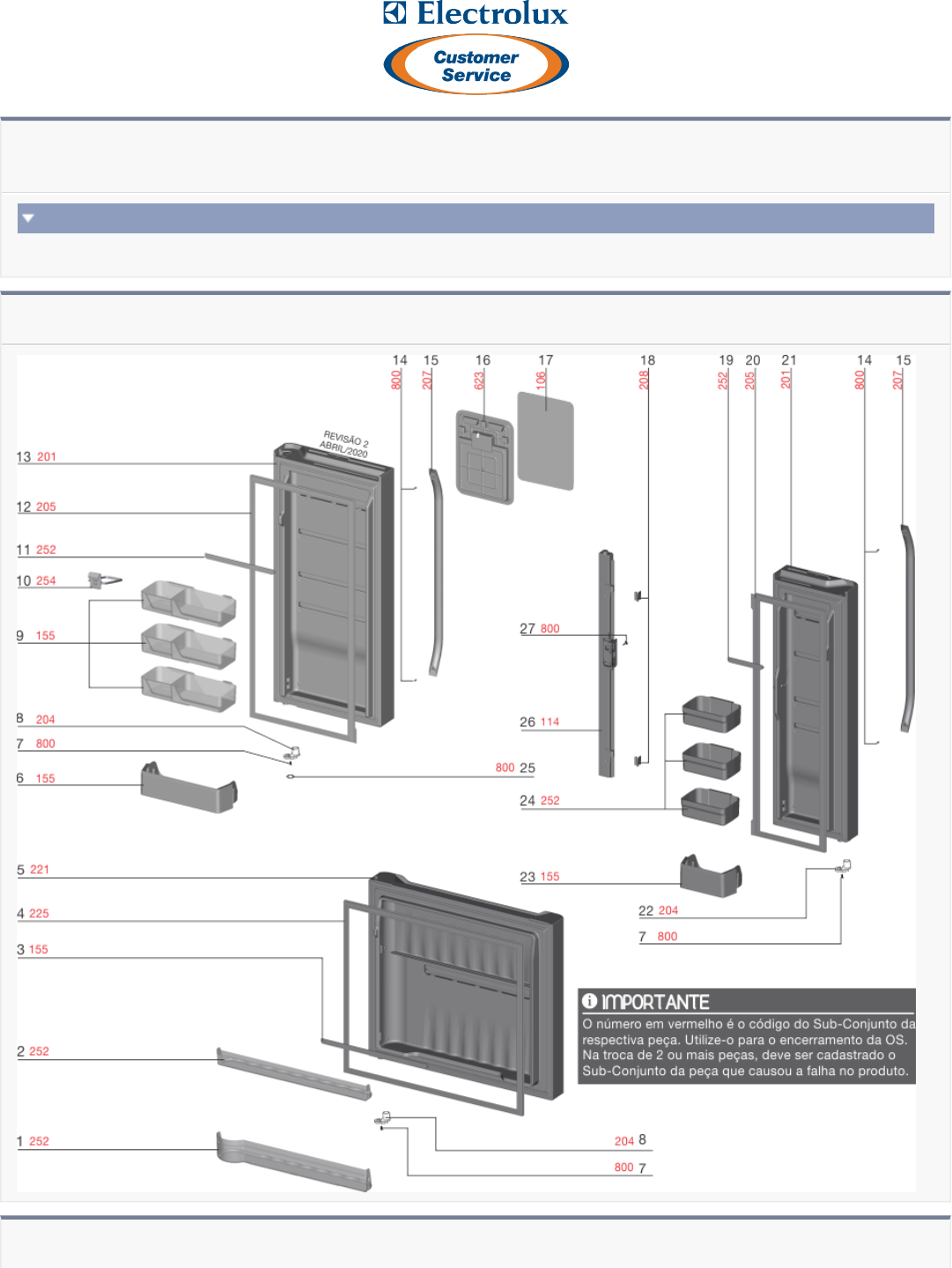 REFRIGERADOR FROST FREE DM84X Informações Técnicas 02603FBA189 900277710-02 CONJUNTO PORTAS Peças Código PNC/ML Posição Codigo da Peça Peça Quantidade 1 A96986201 PRATELEIRA DRINK PORTA FREEZER 1 2 67404876 PRATELEIRA RASA PORTA FREEZER 1 3 67403320 BARRA SUSTENTACAO PRATELEIRA 1 4 809036120 GAXETA PORTA FREEZER 1 5 A02329902 PORTA INOX FREEZER 1 6 A02493001 PRATELEIRA FUNDA DIREITA 1 7 61090339 PARAFUSO AB 5 X 19 3 8 67405200 AUTO CLOSER INOX 2 9 A02487502 PRATELEIRA DESLIZANTE 3 10 70003522 TRAVA GARRAFAS GIRATORIO 1 11 A96920102 BARRA SUSTENTACAO PORTA DIREIT 4 12 809036118 GAXETA PORTA DIREITA REFRIGER 1 13 A02215103 PORTA INOX DIREITA REFRIGERADO 1 13 A02215101 PORTA SUBS PT DM84X DIR + ESQ 1 14 A02554401 PARAFUSO DO PUXADOR 4 15 A01670401 PUXADOR PORTA REFRIGERADOR 2 16 A96969602 PLACA DE INTERFACE 1 17 A96987107 PAINEL PORTA REFRIG INOX 1 18 A01376202 DOBRADICA SUP/INF TRAV MOVEL 2 19 A96920103 BARRA SUSTENTACAO PORTA ESQUER 4 20 809036119 GAXETA PORTA ESQUERDA REFRIGER 1 21 A02224702 PORTA INOX ESQUERDA REFRIGERAD 1 21 A02224701 PORTA SUBS PT DM84X ESQ + DIR 1 23 A02492901 PRATELEIRA FUNDA ESQUERDA 1 24 67403322 PRATELEIRA 1/3 PORTA REFRIG 3 25 A05956701 ARRUELA NIVELAMENTO PORTA 3 26 A01321404 TRAVESSA MOVEL COMPLETA 1 27 61090304 PARAFUSO AB 4,2 X 1,41 X 12,7 2 22 A02275501 AUTO CLOSER ESQUERDO 1