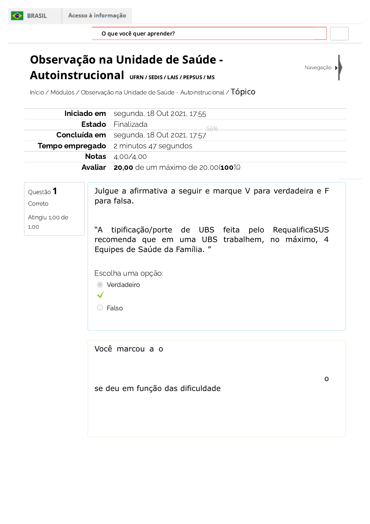 Questão 1 Correto Atingiu 1,00 de 1,00 Iniciado em segunda, 18 Out 2021, 17:55 Estado Finalizada Concluída em segunda, 18 Out 2021, 17:57 Tempo empregado 2 minutos 47 segundos Notas 4,00/4,00 Avaliar 20,00 de um máximo de 20,00(100%) Julgue a afirmativa a seguir e marque V para verdadeira e F para falsa. “A tipificação/porte de UBS feita pelo RequalificaSUS recomenda que em uma UBS trabalhem, no máximo, 4 Equipes de Saúde da Família. ” Escolha uma opção: Verdadeiro Falso Você marcou a opção correta, pois a afirmativa realmente está verdadeira. A tipificação/porte de UBS feita pelo RequalificaSUS recomenda que em uma UBS trabalhem, no máximo, 4 Equipes de Saúde da Família. Essa padronização se deu em função das dificuldades de rganização de agenda e dos fluxos operacionais que garantam as mudanças de práticas de saúde, necessárias ao modelo de atenção proposto pela Estratégia Saúde da Família. Observação na Unidade de Saúde - Autoinstrucional UFRN / SEDIS / LAIS / PEPSUS / MS Início / Módulos / Observação na Unidade de Saúde - Autoinstrucional / Tópico 56% O que você quer aprender? Navegação https://avasus.ufrn.br/?redirect=0 https://avasus.ufrn.br/local/avasplugin/cursos/cursos.php https://avasus.ufrn.br/course/view.php?id=268 https://avasus.ufrn.br/course/view.php?id=268 https://avasus.ufrn.br/?redirect=0 Questão 2 Correto Atingiu 1,00 de 1,00 Julgue a afirmativa a seguir e marque V para verdadeira e F para falsa. “De acordo com a nova PNAB, para a Unidade Básica de Saúde Fluvial recomenda-se os seguintes ambientes: Consultório médico; área para assistência farmacêutica, laboratório, sala de vacina; sala de procedimentos; e, se forem compostas por profissionais de saúde bucal, será necessário consultório odontológico com equipo odontológico completo; área de recepção, banheiro público; cabines com leitos em número suficiente para toda a equipe”. Escolha uma opção: Verdadeiro Falso Você marcou a opção correta, pois a afirmativa realmente está falsa. De acordo com a nova PNAB, para a Unidade Básica de Saúde Fluvial recomenda-se os seguintes ambientes: Consultório médico; consultório de enfermagem; área para assistência farmacêutica, laboratório, sala de vacina; sala de procedimentos; e, se forem compostas por profissionais de saúde bucal, será necessário consultório odontológico com equipo odontológico completo; área de recepção, banheiro público; banheiro exclusivo para os funcionários; expurgo; cabines com leitos em número suficiente para toda a equipe; cozinha e outro ambientes conforme necessidade. Observação na Unidade de Saúde - Autoinstrucional UFRN / SEDIS / LAIS / PEPSUS / MS Início / Módulos / Observação na Unidade de Saúde - Autoinstrucional / Tópico 56% O que você quer aprender? Navegação https://avasus.ufrn.br/?redirect=0 https://avasus.ufrn.br/local/avasplugin/cursos/cursos.php https://avasus.ufrn.br/course/view.php?id=268 https://avasus.ufrn.br/course/view.php?id=268 https://avasus.ufrn.br/?redirect=0 Questão 3 Correto Atingiu 1,00 de 1,00 Questão 4 Correto Atingiu 1,00 de 1,00 Julgue a afirmativa a seguir e marque V para verdadeira e F para falsa. “De acordo com o Ministério da Saúde, são definidos e recomendados os seguintes espaços e ambientes para o cuidado na Unidade de Saúde: sala de espera e recepção; consultório; sala de observação + banheiro; consultório odontológico; sala de procedimentos; sala de curativo; sala de vacinação; sala para coleta. ” Escolha uma opção: Verdadeiro Falso Você marcou a opção correta, pois a afirmativa realmente está verdadeira. Essas recomendações estão descritas no Manual instrutivo de sistema de ampliação e no Manual de estrutura física das UBS do Ministério da Saúde. Julgue a afirmativa a seguir e marque V para verdadeira e F para falsa. “A sinalização externa de uma Unidade Básica de Saúde deve ter uma programação visual de identificação padronizada com cores e estilos únicos para sua fachada.” Escolha uma opção: Verdadeiro Falso Você marcou a opção correta, pois a afirmativa realmente está verdadeira. Segundo o Guia de Orientações aos gestores do SUS, a sinalização externa de uma Unidade Básica de Saúde deve ter uma programação visual de identificação padronizada com cores e estilos únicos para sua fachada. Observação na Unidade de Saúde - Autoinstrucional UFRN / SEDIS / LAIS / PEPSUS / MS Início / Módulos / Observação na Unidade de Saúde - Autoinstrucional / Tópico 56% O que você quer aprender? Navegação https://avasus.ufrn.br/?redirect=0 https://avasus.ufrn.br/local/avasplugin/cursos/cursos.php https://avasus.ufrn.br/course/view.php?id=268 https://avasus.ufrn.br/course/view.php?id=268 https://avasus.ufrn.br/?redirect=0 Observação na Unidade de Saúde - Autoinstrucional UFRN / SEDIS / LAIS / PEPSUS / MS Início / Módulos / Observação na Unidade de Saúde - Autoinstrucional / Tópico 56% O que você quer aprender? Navegação https://www.facebook.com/sgtes https://twitter.com/sgtes_ms https://www.youtube.com/channel/UC_aBUbvuj8o82pQIcPTBUlg https://avasus.ufrn.br/?redirect=0 https://avasus.ufrn.br/local/avasplugin/cursos/cursos.php https://avasus.ufrn.br/course/view.php?id=268 https://avasus.ufrn.br/course/view.php?id=268 https://avasus.ufrn.br/?redirect=0