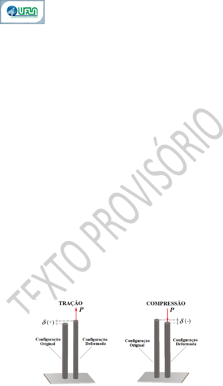 GNE273 – RESISTÊNCIA DOS MATERIAIS I 1 Professor Luiz Eduardo TEXTO EM REVISÃO. © LUIZ EDUARDO T. FERREIRA. DIREITOS AUTORAIS RESERVADOS. Lei n. 9.610/98 - 12/08/2021 1. SOLICITAÇÕES NORMAIS E TANGENCIAIS 1.1 CONSIDERAÇÕES INICIAIS No que segue, admite-se a premissa de que o material que constitui o componente em análise, deforme-se em regime linear relativamente ao carregamento externamente aplicado. Em outras palavras, as respostas de deformação estão linearmente associadas ao carregamento que solicita o componente e caracteriza-se simplificadamente, como elástico- linear. Define-se RESILIÊNCIA como sendo a propriedade apresentada pelo material de deformar-se em regime elástico; por ELASTICIDADE entende-se a propriedade apresentada pelo material de recuperar totalmente a sua forma primitiva, uma vez cessado o esforço externo. Com isso, dentro de um ciclo completo de carregamento e de descarregamento do componente, não ocorre dissipação de energia de qualquer natureza. Portanto, processos de plastificação ou de danificação do material estão naturalmente excluídos da análise elástica. 1.2 ESFORÇOS AXIAIS NORMAIS São esforços orientados segundo a direção do eixo longitudinal do componente, conforme ilustrado na Fig. 1.1. Portanto, atuam sobre um plano ortogonal ao eixo, o qual contém a seção transversal considerada. Assim, são referidos como esforços normais e podem ser classificados como segue: ➢ ESFORÇOS DE TRAÇÃO, os quais atuam no sentido de alongar o componente. Esses esforços são considerados positivos (+) e provocam, simultaneamente, a contração (ou encurtamento) transversal do componente durante a deformação; ➢ ESFORÇOS DE COMPRESSÃO, os quais atuam no sentido de encurtar o componente. Esses esforços são considerados negativos (-) e provocam, simultaneamente, o alongamento (ou expansão) transversal do componente. Figura 1.1 – Componentes cilíndricos submetidos a esforços de tração e de compressão. GNE273 – RESISTÊNCIA DOS MATERIAIS I 2 Professor Luiz Eduardo TEXTO EM REVISÃO. © LUIZ EDUARDO T. FERREIRA. DIREITOS AUTORAIS RESERVADOS. Lei n. 9.610/98 - 12/08/2021 1.3 CONCEITO DE TENSÃO NORMAL MÉDIA Define-se tensão normal média como sendo a relação entre o esforço normal, externamente aplicado (tração ou compressão), e a área da seção transversal do componente, normal ao eixo longitudinal do mesmo, conforme ilustrado na Fig. 1.2. Assim: 𝜎𝑚 = 𝑃 𝐴 ( 𝑒: 𝑃 = 𝜎𝑚. 𝐴) (1.1) Figura 1.2 – Força P equilibrada pela tensão normal média, σm, na seção transversal. No Sistema Internacional de Unidades, SI, a tensão média, a qual significa a quantidade de força aplicada por unidade de área, é medida em N/m2 (ou daN/cm2, N/mm2, etc.). 1.3.1 PRINCÍPIO DE SAINT-VENANT O conceito de tensão média, anteriormente apresentado, aplica-se às regiões da barra relativamente distantes daquelas de transmissão do carregamento externo, assim como às regiões relativamente afastadas daquelas de vinculação da barra ao meio externo (resguardado o caso de considerações adicionais de mobilidade na direção transversal àquela do esforço aplicado). Isso se deve às perturbações elásticas verificadas nas regiões próximas aos extremos carregados ou vinculados da barra. A Fig. 1.2 mostra uma seção transversal ‘confortavelmente’ situada em posição distante daquelas de aplicação da carga P, o que torna o conceito de tensão média bastante razoável, subentendendo que, em regiões afastadas daquelas de perturbação o conceito de tensão média é válido. Não obstante a aparente obviedade da questão, esse importante princípio foi enunciado por Saint-Venant da maneira mais geral, conforme segue: “Os campos de tensão, de deformação e de deslocamentos causados por dois conjuntos diferentes de forças estaticamente equivalentes, serão aproximadamente iguais em regiões suficientemente afastadas dos pontos de aplicação das cargas”. A Fig. 1.3 ilustra dois componentes carregados por conjuntos diferentes de forças estaticamente equivalentes, assim como as seções CC’ onde as tensões médias são GNE273 – RESISTÊNCIA DOS MATERIAIS I 3 Professor Luiz Eduardo TEXTO EM REVISÃO. © LUIZ EDUARDO T. FERREIRA. DIREITOS AUTORAIS RESERVADOS. Lei n. 9.610/98 - 12/08/2021 aproximadamente iguais. Para todos os efeitos, neste texto o princípio de Saint- Venant é implicitamente considerado. Figura 1.3 – Barras carregadas por sistemas de força estaticamente equivalentes. EXEMPLO E1.1. Admitindo-se que a barra ilustrada na Fig.1.1 tenha seção transversal circular e diâmetro d=2,50 cm, e que a mesma esteja submetida a um esforço de tração, P= 2000,00 daN (=20 kN) pede-se determinar o valor da tensão normal média que atua na seção transversal, localizada no centro da barra. SOLUÇÃO: A área da seção transversal, A, é a que segue: 𝐴 = 𝜋𝑑2 4 = 𝜋2,502 4 O valor da tensão média, calculada com a Eq. 1.1, será: 𝜎𝑚 = 2000,00 𝜋.2,502 4 = 4.2000,00 𝜋. 2,502 = 407,434 𝑑𝑎𝑁/𝑐𝑚2 EXEMPLO E1.2. Uma barra de seção transversal quadrada deve ser submetida à ação de uma força axial de tração cujo valor é P= 50000,00 daN. Para o problema, pede-se determinar o valor do a lado da seção, de tal maneira que a tensão atuante não ultrapasse 300,00 daN/cm2. Figura E.1.2 – Barra de seção transversal quadrada, submetida à tração. GNE273 – RESISTÊNCIA DOS MATERIAIS I 4 Professor Luiz Eduardo TEXTO EM REVISÃO. © LUIZ EDUARDO T. FERREIRA. DIREITOS AUTORAIS RESERVADOS. Lei n. 9.610/98 - 12/08/2021 SOLUÇÃO: A área da seção quadrada será: 𝐴 = 𝑎. 𝑎 = 𝑎2 A condição de projeto impõe que σm ≤ 300,00 daN/cm2. Utilizando-se a Eq.1.1 com essa condição, tem-se: 𝜎𝑚 = 𝑃 𝐴 → 300,00 = 50000,00 𝑎2 𝑒: 𝑎 = √ 50000,00 300,00 = 12,910 𝑐𝑚 ≈ 13,0 𝑐𝑚 Observação: O arredondamento é fe