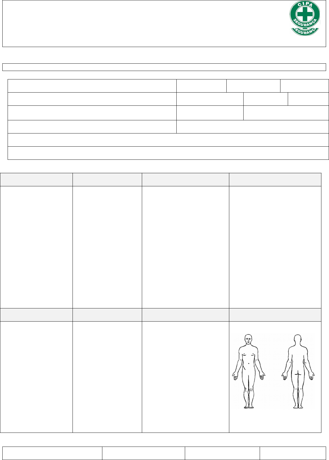 ATÓRIO DE ACIDENTE DE TRABALHO (RAT) Com afastamento ☐ Sem afastamento ☐ Departamento/Setor/Seç Divisão : Setor Acidente nº Nome do Acidenta Registro Sexo Idade Data: Horas: Após horas de trabalho Função Tempo na empresas: Nome do Supervisor Local da ocorrência. ELEMENTOS BÁSICOS DO ACIDENTE – ASSINALAR TIPO DE ACIDENTE AGENTE/FONTE DO ACIDENTE ATO INSEGURO CONDIÇÃO INSEGURA ☐Batida Contra ☐Batida de ☐Prensamento ☐Queda ☐Atrito ☐ Reação do Corpo ☐ Esforço Excessivo ☐ Exposição a eletricidade ☐Exposição à Radiação ☐Exposição a ruído ☐Exposição ao calor ☐Exposição ao frio ☐Exposição á pressão ☐Exposição a vibração ☐ Contato com Produto Químico ☐ Ataque de ser vivo ☐Contato com objeto quente ☐ Outros ☐Portas, janelas, paredes. ☐Pisos ☐Móveis ☐Escadas ☐Equipamentos de transportes ☐ Máquinas ☐ Tubulações ☐ Equipamentos Elétricos ☐Ferramentas ☐Veículo ☐Produtos Químicos ☐Via Pública ☐Outros ☐Andaime ☐ Piso Concretado ☐ Objeto quente ☐Deixar de usar EPI ☐Usar EPI inadequado ☐Usar vestimenta inadequada ☐Usar ferramenta Insegura ☐Usar ferramenta de forma incorreta ☐Manusear objetos pesados ☐Operar em Posição Insegura ☐ Trabalhar a velocidade insegura ☐Correr ☐ Consertar equipamento em movimento ☐Reparar equipamento sem permissão ☐Remover dispositivo de segurança ☐Empilhar de maneira Insegura ☐Não obedecer a aviso ☐Distrair, Brincar, assustar. ☐Ato inseguro de terceiros ☐Outros ☐Arranjo físico inadequado ☐Defeito de edificação ☐Defeito de Instalação ☐Arrumação ou limpeza deficiente ☐Defeito de projeto ou construção ☐Equipamento inadequado ou defeituoso ☐Proteção Coletiva inadequada ou insuficiente ☐ Desconforto Acústico ☐Iluminação Inadequada ☐ Instalação Elétrica defeituosa ☐Método Inseguro de trabalho ☐Falta de EPI ☐EPI impróprio ☐Falta de sinalização ☐Risco de terceiros ☐Risco de transporte público ☐Outros NATUREZA DA LESÃO FATOR PESSOAL LOCALIZAÇÃO DA LESÃO I LOCALIZAÇÃO DA LESÃO II ☐Escoriação ☐Corte ☐Contusão ☐ Distinção ☐Luxação ☐Fratura ☐Queimadura ☐ Congelamento ☐Asfixia ☐ Isolação ☐Choque elétrico ☐Amputação ☐Envenenamento ☐Lesões Múltiplas ☐Outras ☐Picada de Aranha ☐Prensamento ☐ Desajustamento Físico ☐Desajustamento emocional ☐Desajustamento Mental ☐Falta de conhecimento ☐ Falta de experiência ☐Outros ☐Cabeça ☐Face ☐Tórax ☐Região Dorsal ☐Olhos.............................D___E___ ☐Mãos.............................D___E___ ☐Punho...........................D___E___ ☐Antebraço.....................D___E___ ☐Braço.............................D___E___ ☐Pé..................................D___E___ ☐Tornozelo......................D___E___ ☐Perna.............................D___E___ ☐Joelho............................D___E___ ☐Coxa...............................D___E___ ☐Múltiplas partes Visto: Gerência Departamento Gerência Administrativa CIPA-Butilamil Presidente CIPA-Butilamil Vice-Presidente Segurança do Trabalho / CIPA: Visto: Gerência Departamento Gerência Administrativa Segurança do Trabalho Acompanhamento das Medidas Preventivas: Data Histórico Responsável Observações: Página de