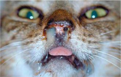 DOENÇAS DO SISTEMA RESPIRTÓRIO DE FELINOS -RINOTRAQUEÍTE- É uma doença viral do trato respiratório superior de felinos causada pelo herpevírus felino, acomete tanto espécies domésticas quanto selvagens. Sua transmissão se dá pelo contato direto com as secreções oral, nasal e ocular, seu período de incubação é curto podendo durar de 1 a 3 semanas. SINAIS CLÍNICOS Os sintomas da rinotraqueíte felina são bastante semelhantes aos da gripe em humanos: secreção ou corrimento nasal e ocular, inflamação dos olhos, espirros, tosse, além de febre, depressão e anorexia ou pouco apetite. O aparecimento de infecções bacterianas secundárias é comum e, nesse caso, as secreções purulentas se tornam achados freqüentes. Em alguns filhotes mais susceptíveis, a doença poderá ser mais grave. Nesses casos, a infecção por HVF-1 freqüentemente está associada com pneumonia primária e estado de viremia, que por sua vez produzirão sinais generalizados e, eventualmente a morte. PATOGENIA O virus é eliminado com as secreções nasais e lacrimais, assim como pela saliva, especialmente na forma de aerossol, pelos animais doentes . O agente penetra por via nasal, oral ou conjuntival, causando infecção primária do epitélio nasal com subseqüente. As lesões do vírus inicialmente causam necrose e inflamação nas áreas da boca, nariz, garganta e olhos, em seguida o vírus ganha a circulação do animal e começa a se replicar tanto nas células epiteliais da conjuntiva e do trato respiratório superior como também em neurônios. DIAGNÓSTICO O diagnóstico é realizado através dos sinais clínicos, pelo isolamento do FeHV-1, por imunoflorescência (IFA) e através da detecção do DNA viral pela reação em cadeia da polimerase (polymerase chain reaction – PCR) PCR. TRATAMENTO O tratamento se dá pela amenização dos sintomas, com a utilização de analgesicos, anibióticos, antiinflamatórios não esteroidais, estimulador de apetite, e reposição de fluídos com a fluídoterapia.