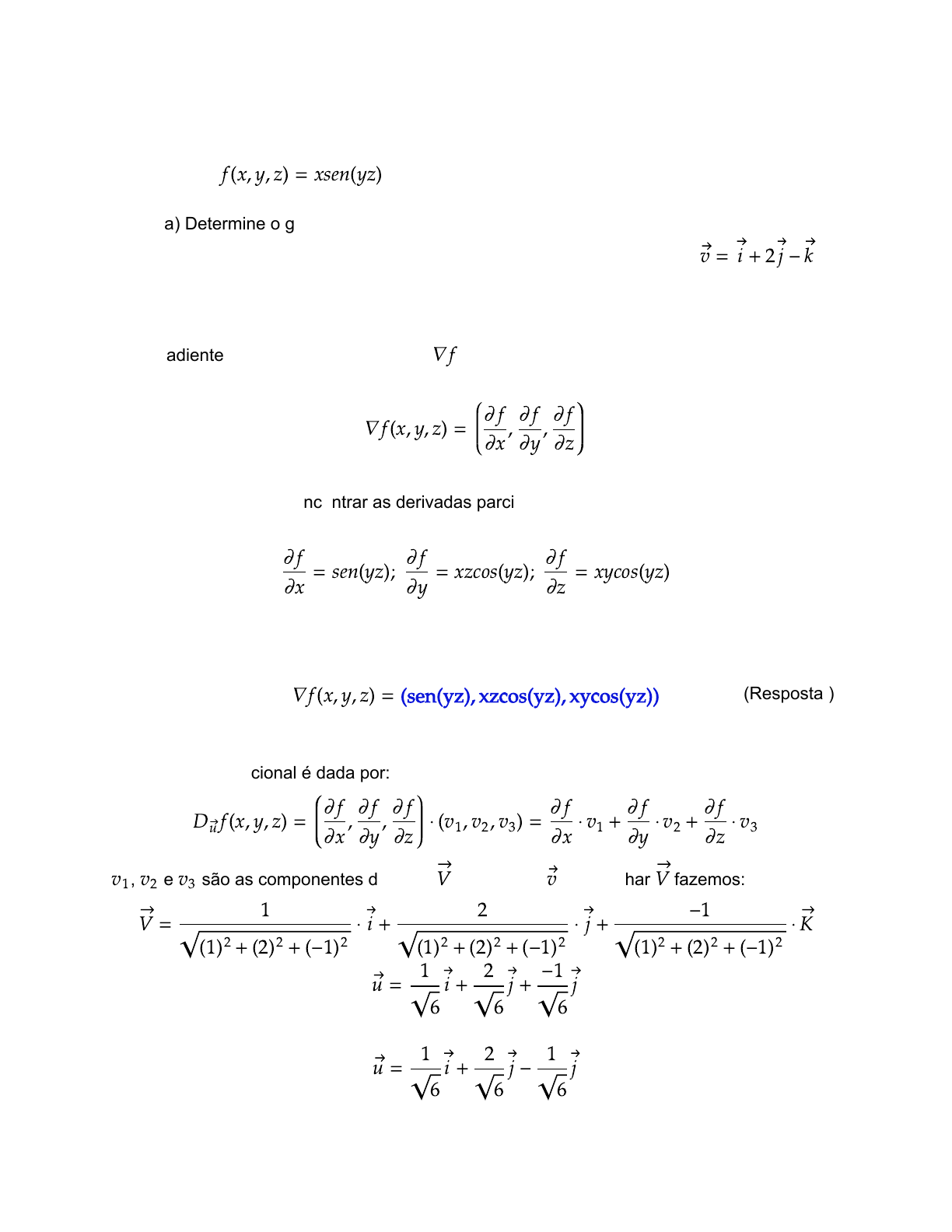 Tiago Lima - Instagram: @professor_disciplinas_exatas • Sendo ; f x, y, z = xsen yz( ) ( ) a) Determine o gradiente de f; b) Determine a derivada direcional de f no ponto (4,2,0) e na direção .= + 2 -v i j k Solução: a) O gradiente da função f, denotado por , é uma função vetorial dada por;𝛻f 𝛻f x, y, z = , ,( ) 𝜕f 𝜕x 𝜕f 𝜕y 𝜕f 𝜕z Assim, primeiro vamos encontrar as derivadas parciais de f; = sen yz ; = xzcos yz ; = xycos yz 𝜕f 𝜕x ( ) 𝜕f 𝜕y ( ) 𝜕f 𝜕z ( ) Com isso, o gradiente de f é; 𝛻f x, y, z = sen yz , xzcos yz , xycos yz( ) ( ( ) ( ) ( )) b) A derivada direcional é dada por: D f x, y, z = , , ⋅ v , v , v = ⋅ v + ⋅ v + ⋅ vu ( ) 𝜕f 𝜕x 𝜕f 𝜕y 𝜕f 𝜕z ( 1 2 3) 𝜕f 𝜕x 1 𝜕f 𝜕y 2 𝜕f 𝜕z 3 , e são as componentes do vetor , unitário de , para achar fazemos:v1 v2 v3 V v V = ⋅ + ⋅ + ⋅V 1 1 + 2 + -1( )2 ( )2 ( )2 i 2 1 + 2 + -1( )2 ( )2 ( )2 j -1 1 + 2 + -1( )2 ( )2 ( )2 K = + +u 1 6 i 2 6 j -1 6 j = + -u 1 6 i 2 6 j 1 6 j (Resposta ) Com isso, ; e v =1 1 6 v =2 2 6 v = -3 1 6 e 4, 2, 0 = sen 2 ⋅ 0 4, 2, 0 = sen 0 4, 2, 0 = 0 𝜕f 𝜕x ( ) ( ) → 𝜕f 𝜕x ( ) ( ) → 𝜕f 𝜕x ( ) 4, 2, 0 = 4 ⋅ 0 ⋅ cos 2 ⋅ 0 4, 2, 0 = 0 ⋅ cos 0 4, 2, 0 = 0 ⋅ 1 4, 2, 0 = 0 𝜕f 𝜕y ( ) ( ) → 𝜕f 𝜕y ( ) ( ) → 𝜕f 𝜕y ( ) → 𝜕f 𝜕y ( ) 4, 2, 0 = 4 ⋅ 2 ⋅ cos 2 ⋅ 0 4, 2, 0 = 8 ⋅ cos 0 4, 2, 0 = 8 ⋅ 1 4, 2, 0 = 8 𝜕f 𝜕z ( ) ( ) → 𝜕f 𝜕z ( ) ( ) → 𝜕f 𝜕z ( ) → 𝜕f 𝜕z ( ) O derivada direcional de f no ponto (4,2,0) e na direção do vetor é:v D f 4, 2, 0 = 0 ⋅ + 0 ⋅ + 8 ⋅-v ( ) 1 6 2 6 1 6 D f 4, 2, 0 = 0 - 0 -v ( ) 8 6 D f 4, 2, 0 = - ⋅ D f 4, 2, 0 = - D f 4, 2, 0 = -v ( ) 8 6 6 6 → v ( ) 8 6 6 2 → v ( ) 8 6 6 D f 4, 2, 0 = -v ( ) 4 3 6 (Resposta )