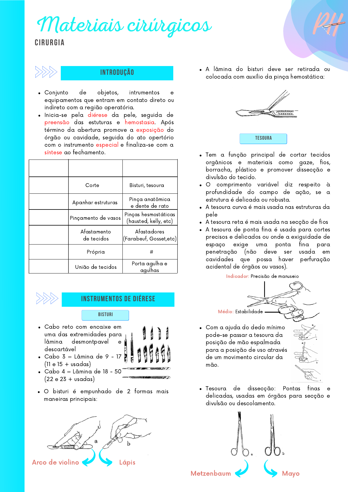 T I P O F U N Ç Ã O E X E M P L O D I É R E S E P R E E N S Ã O H E M O S T A S I A E X P O S I Ç Ã O E S P E C I A I S S Í N T E S E Corte Bisturi, tesoura Apanhar estruturas Pinça anatômica e dente de rato Pinçamento de vasos Pinças hesmostáticas (hausted, kelly, etc) Afastamento de tecidos Afastadores (Farabeuf, Gosset,etc) Própria União de tecidos Porta agulha e agulhas # INTRODUÇÃO INSTRUMENTOS DE DIÉRESE BISTURI TESOURA Indicador: Precisão de manuseio Médio: Estabilidade Conjunto de objetos, intrumentos e equipamentos que entram em contato direto ou indireto com a região operatória. Inicia-se pela diérese da pele, seguida de preensão das estuturas e hemostasia. Após término da abertura promove a exposição do órgão ou cavidade, seguida do ato opertório com o instrumento especial e finaliza-se com a síntese ao fechamento. Cabo reto com encaixe em uma das extremidades para lâmina desmontpavel e descartável Cabo 3 = Lâmina de 9 - 17 (11 e 15 + usadas) Cabo 4 = Lâmina de 18 - 50 (22 e 23 + usadas) O bisturi é empunhado de 2 formas mais maneiras principais: Arco de violino Lápis A lâmina do bisturi deve ser retirada ou colocada com auxílio da pinça hemostática: Tem a função principal de cortar tecidos orgânicos e materiais como gaze, fios, borracha, plástico e promover dissecção e divulsão do tecido. O comprimento variável diz respeito à profundidade do campo de ação, se a estrutura é delicada ou robusta. A tesoura curva é mais usada nas estruturas da pele A tesoura reta é mais usada na secção de fios A tesoura de ponta fina é usada para cortes precisos e delicados ou onde a exiguidade de espaço exige uma ponta fina para penetração (não deve ser usada em cavidades que possa haver perfuração acidental de órgãos ou vasos). Com a ajuda do dedo mínimo pode-se passar a tesoura da posição de mão espalmada para a posição de uso através de um movimento circular da mão. Tesoura de dissecção: Pontas finas e delicadas, usadas em órgãos para secção e divulsão ou descolamento. MayoMetzenbaum Materiais cirúrgicos C I R U R G I A PH INSTRUMENTOS DE PREENSÃO DISSECÇÃO INSTRUMENTOS DE HEMOSTASIA DEFINITIVA Dedo médio: apoio Polegar: Apoio Indicador: Abre e fecha a pinça São destinadas ao pinçamento de pequenos vasos sangrantes para ligadura e também para pinçar fios de sutura e tecidos orgânicos como aponeurose e peritônio. São empuhados de forma semelhante a tesoura Pinça de preensão contínua pois permanecem presa ao tecido onde forem aplicadas por conta a cremalheira Kocher: Pontas mais longas e robustas e possui dente de rato.Mais usada para pinçamentos transversais em tecidos ou ppinçamento pela ponta para tração de aponeurose. Kelly Crile INSTRUMENTOS DE EXPOSIÇÃO AFASTADORES DINÂMICOS Tesoura de uso geral: Destinada para secção de fios ou outros materiais. Ela é mais robusta e resistente. Destinados a agarrar os tecidos chamados de pinça de dissecção Manipula tecidos, é um instrumento auxiliar É usado na mão esquerda e empunhado como se fosse um lápis. A pinça dente de rato deve ser usada somente na confecção de pontos na pele ou em putros materiais como campos, borrachas etc. Kelly e Crile: Pontas menores usadas para vasos, fios grossos e pinçamentos pela ponta de tecidos mais grosseiros. Halsted: Pequeno tama- nho e delicadeza Elementos mecânicos para afastar os tecidos seccionados ou separados, expondo os planos anatômicos ou órgãos subjacentes. O tipo de afastador depende da profundidade, espessura dos tecidos e da consistência e resistência oferecidos por eles. Exigem tração manual contínua As manobras de afastamento devem ser suaves para não traumatizar os tecidos Afastador de Farabeuf: Usado para afastamento da pele, subcutâneo e músculos em pano superficial Afastador de Lanenbeck: Mesmo uso do Farabeuf mas com o cabo de empubgadura mais longo, podenod atingir planos mais profundos Afastador de Doyen: Mesmo formato da anterior com superfície maior de afastamento usado na cavidade abdominal Afastador de Volkmann: Possui garras na parte curva, dando mais derência aos tecidos, usado somente em planos musculares. Espátula: Lâminas de várias larguras usadas na cavidade pleural ou abdominal. AFASTADORES AUTOESTÁTICOS Composto de peças acopladas entre si, de tal modo que uma vez colocados e abertos eles se mantém estáveis. São indispensáveis na cirurgia da cavidade abdominal e pleural. 2 bases paralelas munidas de lâminas afastadoras e que são articuladas entre si por uma barra transversal lisa ou com cremalheira. INSTRUMENTOS CIRURGIA GASTROINTESTINAL Pinças intestinais (Kocher e Stone): Pinçam estômago ou alças intestinais, promovem hemostasia, evitando saída de conteúdo intestinal e apresentando as bordas para sutura. Lane Abadie Babcock Collin Duval Afastador de Gosset: Usado para afastar a cavidade abdominal. Como as hastes são paralelas e apoiadas em uma barra lisa, as bordas da ferida fazem pressão convergente as lâminas, tirando o paralelismo das hastes, aumentando o atrito da parte deslizante, evitando que se feche Afastador de Balfour: Semelhante ao Gosset, mas mais robusto e com terceira lâmina curva , também apoia em um braço deslizante. Afastador de Finochietto: Usado em cirurgia de tórax para abertura dos espaços intercostais e medioesternal. A barra transversal deve ficar à direita do cirurgião nas incisões medianas e do lado do cirurgião nas incisões laterais. Stone Kocher Pinças gêmeas (Abadie e Lane): Pinças intestinais articuladas entre si para facilitar a exposição para secção e síntese nas anastomoses gastrointestinais. Pinças de preensão atraumática (Babcock, Duval e Collin): Preensão de tecidos/vísceras, superfície ampla de contato com ranhuras, Chaput Allis Pinças de preensão traumática (Chaput e Allis): Maior preensão de tecidos/vísceras por denteamento fino nas superfícies de contato. Rochester