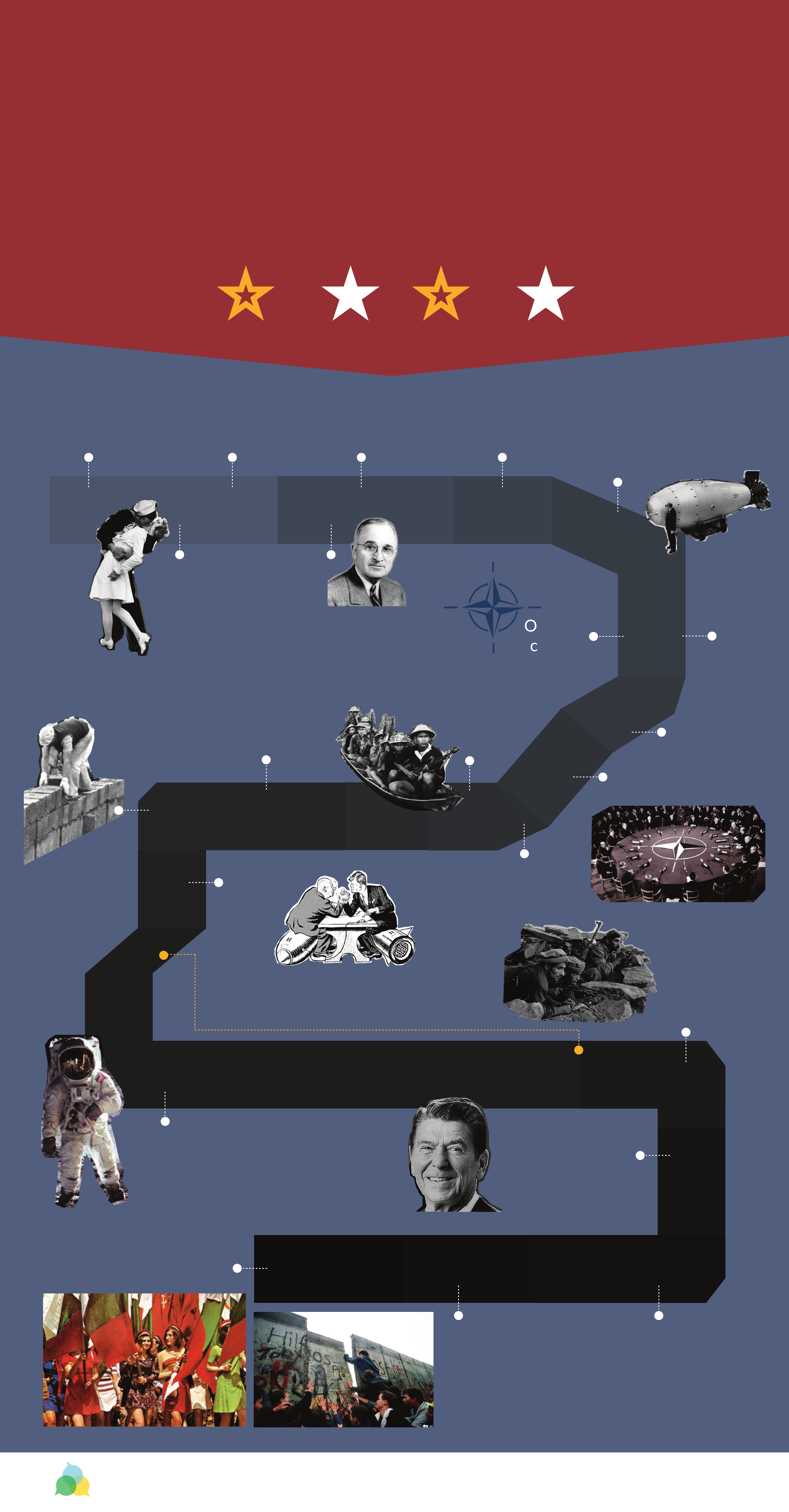 Politize! A Guerra Fria foi uma disputa que durou entre 1947 e 1989, entre as duas superpotências da época: Estados Unidos (EUA) e União Soviética (URSS). Apesar de não ter ocorrido um conflito armado direto entre as duas potências, o período contou com muitos momentos de tensão. Confira os eventos mais significativos deste embate entre países e ideologias! Politize! Conteúdos ricos, divertidos e gratuitos sobre política, formando cidadãos mais conscientes e capazes de mudar o Brasil. Acesse e contribua em: www.politize.com.br GUERRA FRIAGUERRA FRIA EUA cria sua primeira bomba atômica Crise dos mísseis Détente, afrouxamento das tensões Doutrina Truman é lançada URSS cria sua primeira bomba atômica OTAN é criada Partido Comunista chega ao poder na China Plano Marshall anunciado Reforma monetária na Alemanha e bloqueio de Berlim 1947 1948 1949 Invasão da Baía dos Porcos Gorbachev assume liderança na URSS e implanta Glasnost e Perestroika Reagan e Partido Republicano ascendem ao poder nos EUA Primeiro satélite artificial é lançado em órbita, pela URSS Início Guerra da Coreia Divisão da Alemanha 1950 1955 19571961 1962 Pacto de Varsóvia é criado Construção do Muro de Berlim chegada do homem à lua, pelos EUA 1963 1969 Início Guerra do Vietnã 1959 1945 Fim da II Guerra Mundial Dissolução da URSS Queda do Muro de Berlim 1979 1981 1985 19891991 Guerra do Afeganistão e intervenção soviética