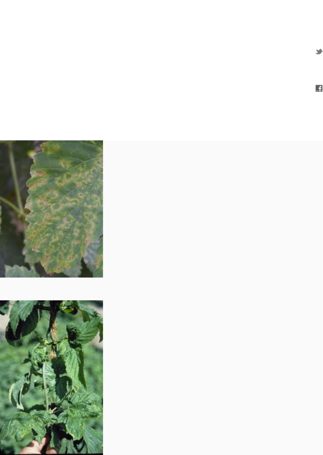 Doenças do lúpulo ( Humulus lupulus ) -Vírus · · · Outra planta de lúpulo infectada com ApMV. Observe os arcos e anéis amarelados-acastanhados. David H. Gent, 2006 Observe as áreas cloróticas (amareladas), bem como distorção e ondulação para cima das margens das folhas. Foto por CB Skotland Tiro de campo de planta de lúpulo infectada com ApMV. Observe os arcos e anéis amarelos. David H. Gent, 2006 Por K. Eastwell e CM Ocamb Causa Hop vírus latente(HpLV), vírus latente do lúpulo americano(AHLV), vírus do mosaico Hop(HpMV) e vírus do mosaico da Apple(ApMV) foram encontrados em pátios de lúpulo do Noroeste do Pacífico. Os dois primeiros não produzem sintomas e nenhuma perda de safra conhecida. O HpMV, um carlavírus, tradicionalmente não tem sido um problema, mesmo quando detectado em um plantio. Muitas variedades são tolerantes ao HpMV e são assintomáticas quando infectadas; alguns como Chinook e Golding podem ser muito sensíveis. O ApMV, um ilarvírus anteriormente conhecido no lúpulo como Prunus necrotic ringspot virus , pode causar até 30% de perda na produção de cones e também diminuir os níveis de ácido alfa, mas os efeitos do ApMV são dependentes da variedade. HpLV, AHLV e HpMV são transmitidos por contato planta a planta e pelo pulgão Damson-hop ( Phorodon humuli ); O HpMV também é transmitido pelo pulgão Myzus persicae . O ApMV se move por contato planta a planta. Sintomas As plantas infectadas com HpLV e AHLV não apresentam sintomas conhecidos em variedades cultivadas no noroeste do Pacífico. Os lúpulos sensíveis ao HpMV mostram uma faixa de nervuras clorótica e clara na folha, que é mosqueada e se enrola fortemente. Os morros doentes podem sobreviver por vários anos, mas são atrofiados com internódios encurtados e podem ser mortos pela infecção. Os sintomas de ApMV dependem da variedade de lúpulo e da cepa do vírus e, especialmente, das mudanças rápidas no clima. Os sintomas geralmente são suprimidos em climas quentes e aparecem durante climas frios. Conseqüentemente, os sintomas podem ocorrer nas folhas de uma certa idade, mas não nas folhas mais novas ou mais velhas. Isso também se aplica a outras partes da planta. Os sintomas foliares incluem arcos e anéis cloróticos ou necróticos ou padrões de linhas necróticas. As folhas geralmente têm uma textura crocante e semelhante a couro e pode haver ondulação nas margens das folhas. As plantas geralmente são atrofiadas com entrenós e braços laterais encurtados e podem ter dificuldade de escalar. Se o tempo frio ocorrer durante a floração, a formação e o tamanho do cone podem ser drasticamente reduzidos. Controle cultural A exclusão é um meio importante de controle de vírus. · Use ações testadas por vírus e certificadas como livres de vírus. · O porta-enxerto limpo está disponível na Clean Plant Network em http://healthyplants.wsu.edu/hop-program-at-cpcnw/ · Plante onde o lúpulo nunca foi cultivado ou em campos onde todas as plantas do lúpulo morreram. · Saneamento geral para controle de doenças. · Trabalho / colheita em jardas doentes por último. · Limpe o equipamento entre os pátios, principalmente durante as operações no início da temporada. Atualmente, é recomendado que o equipamento seja limpo primeiro com uma lavagem para remover os detritos da planta e, em seguida, com uma solução de alvejante de 5% a 10% por pelo menos alguns segundos a mais de 10 minutos. Quanto mais tempo o equipamento pode ficar em contato com a solução desinfetante, maior a probabilidade de que o equipamento seja higienizado. Como o alvejante é muito cáustico para os metais, pode ser uma boa ideia enxaguar o equipamento com água limpa após a higienização. · Destrua as plantas severamente atrofiadas ou amareladas. Referências Cerruti, N. 2010. Examinations of Fusarium sambucinum on Humulus lupulus and Co -infection with Hop Stunt Viroid in Commercial Hop Fields. Dissertação de mestrado, Oregon State University. Corvallis, Oregon Eastwell, KC e Nelson, ME 2007. Ocorrência de viróides em áreas de produção comercial de lúpulo ( Humulus lupulus L. ) do estado de Washington. Plant Health Progress doi: 10.1094 / PHP-2007-1127-01-RS. Pethybridge, SJ, et al. 2008. Vírus e viróides infectando lúpulo: importância, epidemiologia e gerenciamento. Plant Disease 92 (3): 324-338.