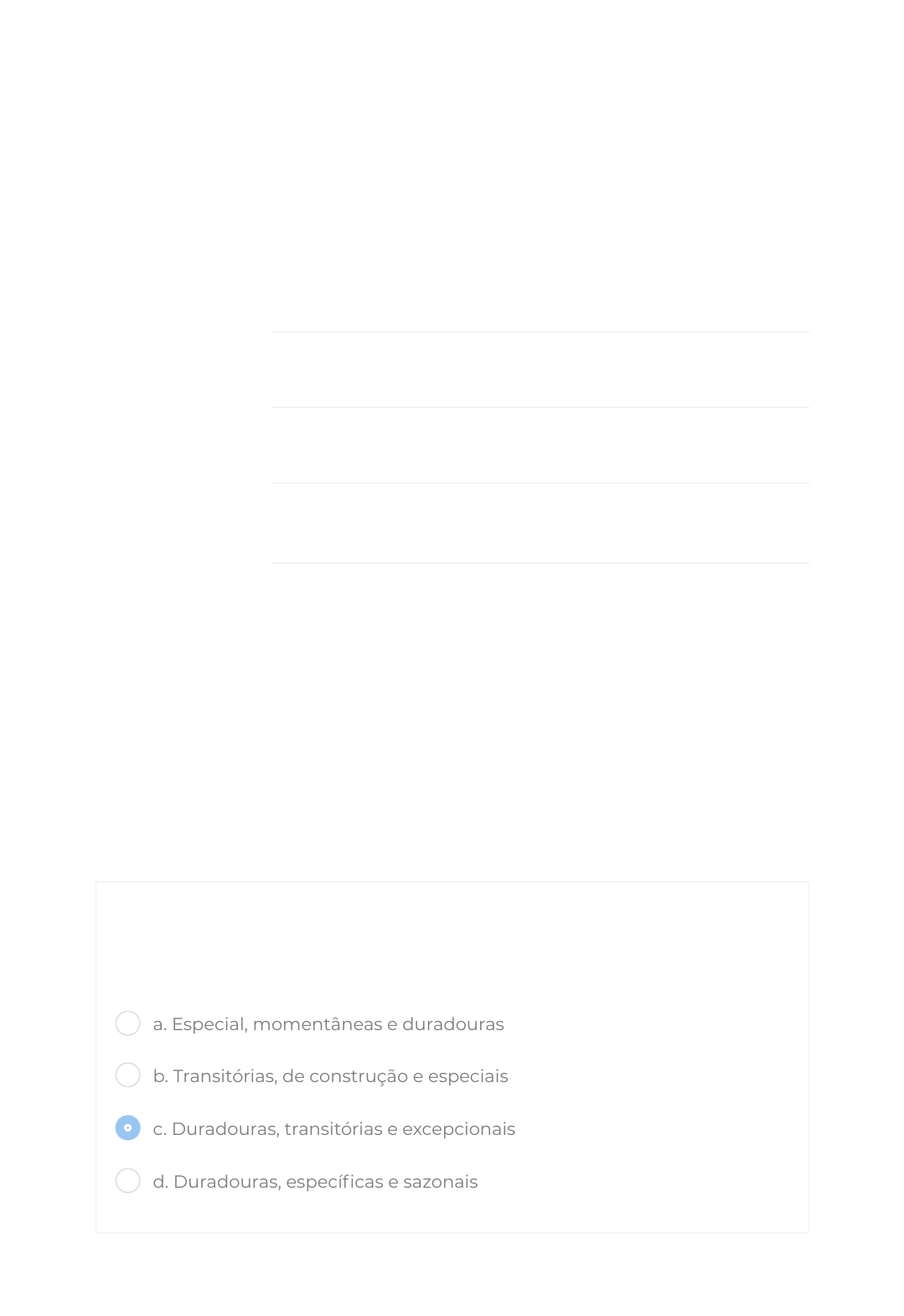 Painel / Minhas Disciplinas / 45A106 / Leitura Obrigatória 01 - Introdução / Atividade Obrigatória 01 Estruturas Iniciado em segunda, 18 Out 2021, 19:09 Estado Finalizada Concluída em segunda, 18 Out 2021, 19:12 Tempo empregado 2 minutos 56 segundos Avaliar 10,00 de um máximo de 10,00(100%) Questão 1 Correto Atingiu 2,00 de 2,00 Quais as três possíveis situações de projeto? Escolha uma opção: a. Especial, momentâneas e duradouras b. Transitórias, de construção e especiais c. Duradouras, transitórias e excepcionais d. Duradouras, especí�cas e sazonais https://ava.politecnicabr.com.br/my/ https://ava.politecnicabr.com.br/course/view.php?id=1063 https://ava.politecnicabr.com.br/course/view.php?id=1063#section-2 https://ava.politecnicabr.com.br/mod/quiz/view.php?id=33237 https://ava.politecnicabr.com.br/ Questão 2 Correto Atingiu 2,00 de 2,00 Julgue verdadeiro ou falso: Situações duradouras são aquelas que podem ter duração igual ao período de referência da estrutura Escolha uma opção: Verdadeiro Falso https://ava.politecnicabr.com.br/ Questão 3 Correto Atingiu 2,00 de 2,00 Um carregamento é dito normal quando: Escolha uma opção: a. É transitório e deve ser de�nido em cada caso particular em que haja risco de ocorrência de estados limites últimos já durante a construção b. Corresponde à classe de carregamento de�nida pela duração acumulada prevista para a ação variável especial considerada c. Inclui apenas ações decorrentes do uso previsto para a construção d. Não inclui apenas ações decorrentes do uso previsto para a construção https://ava.politecnicabr.com.br/ Questão 4 Correto Atingiu 2,00 de 2,00 Um exemplo de situação de projeto duradoura é: Escolha uma opção: Questão 5 Correto Atingiu 2,00 de 2,00 O acumulo de neve sobre uma estrutura é considerado um carregamento de que tipo? Escolha uma opção: a. Içamento de uma tesoura por um guindaste b. Conserto de um telhado c. Neve no teto d. Uma placa de propaganda sobre um beiral a. Carregamento normal b. Carregamento de construção c. Carregamento especial d. Carregamento excepcional https://ava.politecnicabr.com.br/