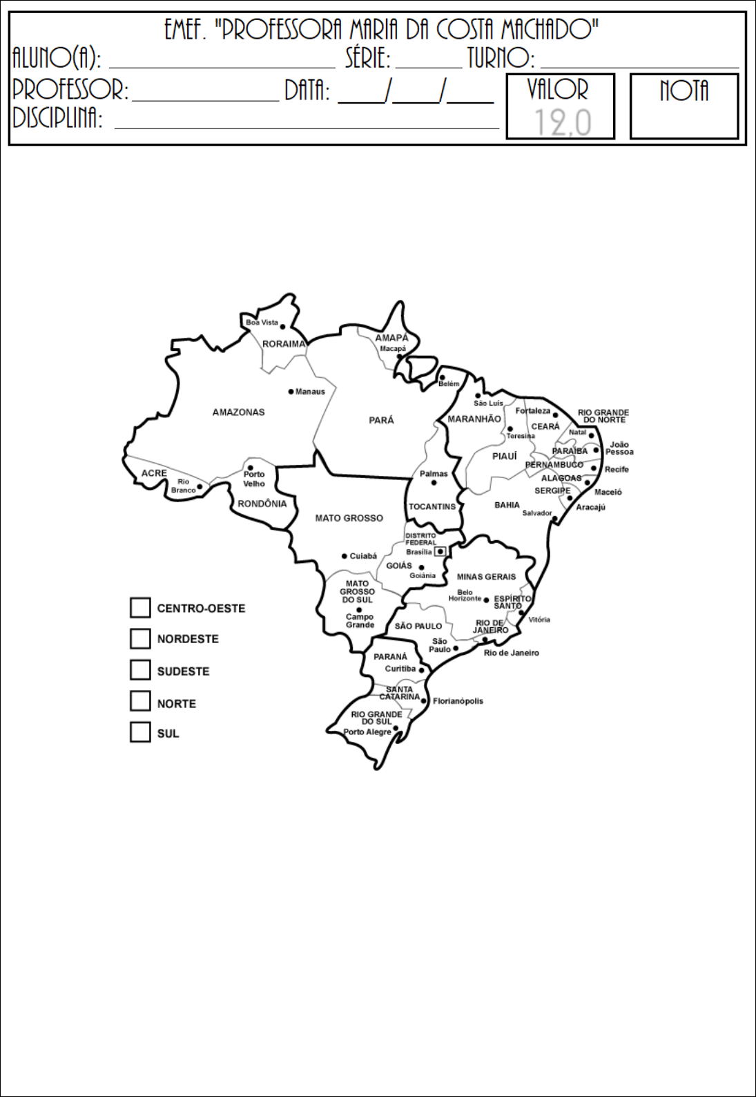 ATIVIDADE AVALIATIVA DE GEOGRAFIA 1 - Pinte as regiões do Brasil e faça a legenda conforme as cores de cada região. 2 - Marque a alternativa que corresponde à quantidade correta de estados do Brasil. a) ( ) 26 estados e 1 Distrito Federal b) ( ) 25 estados c) ( ) 25 estados e 1 Distrito Federal d) ( ) 27 estados. 12,0 3 - Marque a alternativa que corresponde, respectivamente, os estados brasileiros que apresentam a maior e a menor extensão territorial. a) ( ) Amazonas e Acre b) ( ) Pará e Alagoas c) ( ) São Paulo e Amapá d) ( ) Amazonas e Sergipe e) ( ) Mato Grosso e Roraima 4 - Das cinco regiões brasileiras, a que ocupa a maior área do Brasil é a: a) ( ) Nordeste b) ( ) Norte c) ( ) Centro-Oeste d) ( ) Sudeste e) ( ) Sul 5 - Observe, acima, o mapa de divisão regional do Brasil e em seguida assinale a alternativa INCORRETA: a) ( ) o número 3 assinala a região Centro-Oeste, onde se localiza a capital do país: Brasília. b) ( ) o número 2 identifica a região Sudeste que apresenta maior índice de industrialização. c) ( ) o número 4 assinala a região Sul, onde se concentram um grande número de europeus. d) ( ) o número 5 corresponde a região Norte, onde está localizada a floresta amazônica. 6 - O IBGE divide o Brasil em cinco regiões administrativas a) ( ) Norte, Sul, Centro Norte, Sudoeste e Nordeste. b) ( ) Norte, Sudeste, Centro Sul, Noroeste e Oeste. c) ( ) Norte, Nordeste, Sudeste, Centro Oeste e Sul. d) ( ) Norte, Centro Leste, Sul, Nordeste e Leste. 7 - Todos os Estados abaixo fazem parte da região Nordeste, exceto: a) ( ) Alagoas b) ( ) Rio Grande do Norte c) ( ) Paraíba d) ( ) Roraima e) ( ) Sergipe 8 - A Região Sul é: a) ( ) a de maior em tamanho b) ( ) a região que abrange mais estados c) ( ) a região que tem a menor área d) ( ) onde se localiza a capital do Brasil 9 - Região brasileira que possui o maior número de estados: a) ( ) Norte b) ( ) Nordeste c) ( ) Sul d) ( ) Sudeste e) ( ) Centro-Oeste 10 - A Região Sudeste é: a) ( ) a maior em tamanho b) ( ) a região que abrange mais estados c) ( ) a região que tem a menor área d) ( ) Nenhuma alternativa correta