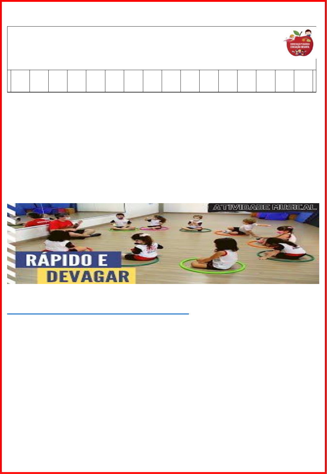 CAMPO DE EXPERIÊNCIA: CORPO, GESTOS E MOVIMENTOS- TRAÇOS,SONS,CORES E FORMAS. PROFESSOR(A): PAULA BEATRIZ BRITO DOS SANTOS TURMA : P1 ALUNO(A): ATIVIDADES PARTICIPATIVAS AMIGUINHO(A),OBSERVE A FIGURA ABAIXO. ESSA ATIVIDADE VAI TRABALHAR RITMOS RÁPIDOS E LENTOS. ASSISTAM O VÍDEO DO PROFSSESSOR GABRIEL SILVA QUE ESTÁ DISPONÍVEL NO PORTAL EDUCACIONAL.VAI SER BEM LEGAL. https://i.ytimg.com/vi/KpHd6SAQsOQ/mqdefault.jpg OBJETIVO: ESTIMULAR A CRIANÇA A TRABALHAR RITMOS RÁPIDOS E LENTOS ASSOCIADOS AO MOVIMENTO. MATERIAIS NECESSÁRIOS: *UM APARELHO DE SOM, CELULAR, ETC; *A CRIANÇA ,FAMILIARES E UM RESPONSÁVEL PARA DIRECIONAR A BRINCADEIRA; * GARRAFAS PLÁSTICAS (COM ALGUNS GRÃOS DENTRO),CHOCALHOS,TAMBOR,ETC... DESENVOLVIMENTO: USAR OS INTRUMENTOS FEITOS COM MATERIAIS RECICLÁVEIS OU TAMBOR DE BRINQUEDO,ENTRE OUTROS DE ACORDO COM CADA RITMOS. https://i.ytimg.com/vi/KpHd6SAQsOQ/mqdefault.jpg AMIGUINHO(A),A PRÓXIMA ATIVIDADE VAMOS TRABALHAR PERCEPÇÃO DE SONS E MÚSICAS. http://2.bp.blogspot.com/_W9avbxkJydM/TTOVVVpfXgI/AAAAAAAAADc/F_VS2ujMO_Q /s1600/A-musica-e-o-desenvolvimento-cognitivo-da-crianca.jpg MEU ANJINHO,COM AJUDA DE UM RESPONSÁVEL E DE UM APARELHO DE CELULAR , RÁDIO,ETC,PARA AUXILIÁ-LO NA BRINCADEIRA. ESSA BRINCADEIRA SERÁ PARA CONHECER E IDENTIFICAR ALGUMAS CARACTERÍSTICAS SONORAS NAS MÚSICAS,ISTO É, O REPONSÁVEL COLOCA UMA MÚSICA E VOCÊ IDENTIFICARÁ O SONS DOS INSTRUMENTOS MUSICAIS CONHECIDOS OU PARECIDOS COM SONS DO SEU DIA A DIA. http://2.bp.blogspot.com/_W9avbxkJydM/TTOVVVpfXgI/AAAAAAAAADc/F_VS2ujMO_Q/s1600/A-musica-e-o-desenvolvimento-cognitivo-da-crianca.jpg http://2.bp.blogspot.com/_W9avbxkJydM/TTOVVVpfXgI/AAAAAAAAADc/F_VS2ujMO_Q/s1600/A-musica-e-o-desenvolvimento-cognitivo-da-crianca.jpg