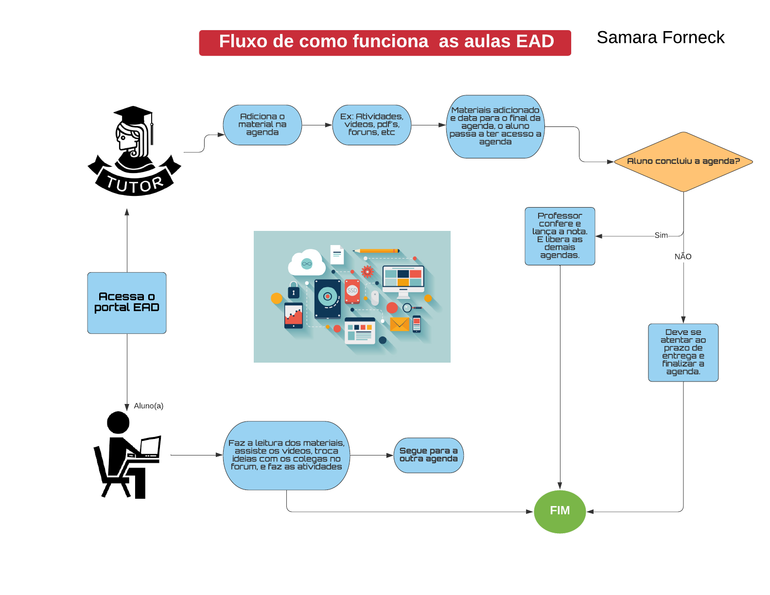 Aluno(a) Fluxo de como funciona as aulas EAD Samara Forneck A c es s a o por t a l EA D A dic ion a o ma ter ia l n a agen da Ex : A t iv idades , v ideos , pdf 's , f o r u n s , e t c Ma ter ia is ad ic ion ado e da ta par a o f in a l da agen da , o a luno pas s a a ter ac es s o a agen da A luno c onc lu iu a agen da? Sim Pr o fes s or c on fer e e lan ç a a nota . E l iber a as dema is agen das . NÃO Dev e s e a ten tar ao pr az o de en t r ega e f in a l iz ar a agen da . FIM Faz a le it u r a dos ma ter ia is , as s is te os v ideos , t r oc a ide ias c om os c o legas no for um , e faz as a t iv idades S egue par a a out r a agen da