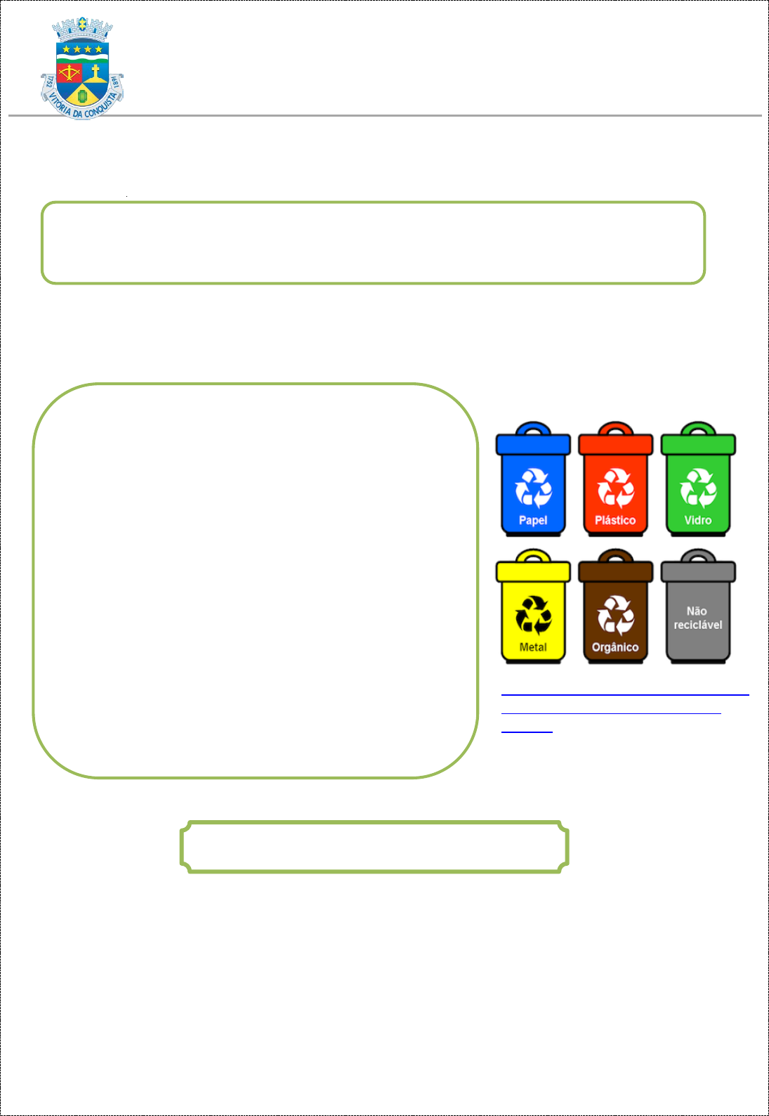 PREFEITURA MUNICIPAL DE VITÓRIA DA CONQUISTA Secretaria da Educação - Núcleo Pedagógico www.pmvc.ba.gov.br ESCOLA:________________________________________________DATA:___/___/__ NOME:_____________________________________________________TURMA:_____ _ 3º ANO – SEMANA 33 – ATIVIDADE 3 – GEOGRAFIA/LÍNGUA PORTUGUESA Coleta Seletiva 1. Em sua casa você e sua família costumam fazer a coleta seletiva do lixo? Conte aqui como é a experiência da coleta de lixo em sua casa. ____________________________________________________________________ ____________________________________________________________________ 2. E o lixo não reciclável, onde as pessoas da sua família costumam descartar? ____________________________________________________________________ ____________________________________________________________________ ATENÇÃO! AS ATIVIDADES PODEM SER RESPONDIDAS NO CADERNO. A coleta seletiva consiste em separar os materiais recicláveis, os não recicláveis e o lixo orgânico. Os materiais recicláveis são: papel, vidro, plástico e metal. Os materiais não recicláveis são: adesivos, fotografias, papel sujo ou engordurado, lâmpadas, espelhos, entre outros. O lixo orgânico é formado de restos de comida em geral, por folhas, flores e demais partes de plantas mortas, por cinzas e por aparas de madeira. Existem lixeiras próprias para depositar cada tipo de material. Elas têm cores diferentes. Texto adaptado. Buriti Mais. Geografia, 3º ano. Exercitando o conhecimento! https://atividadespedagogicas.net/2017/ 10/atividades-sobre-reciclagem-do- lixo.html https://atividadespedagogicas.net/2017/10/atividades-sobre-reciclagem-do-lixo.html https://atividadespedagogicas.net/2017/10/atividades-sobre-reciclagem-do-lixo.html https://atividadespedagogicas.net/2017/10/atividades-sobre-reciclagem-do-lixo.html 3. Leia as palavras e distribua no quadro de acordo ao número de sílabas: Palavras de duas sílabas Palavras de três sílabas Palavras de quatro sílabas 4. Relacione cada tipo de lixo na lata correspondente: Sucesso!! Orgânico Comida Plástico Vidro Lâmpada Adesivo Metal Papel Reciclável 1 2 3 4 5 6 Casca de banana Lâmpada queimada Caixa de creme dental Lata de refrigerante Garrafa de vidro Copo descartável
