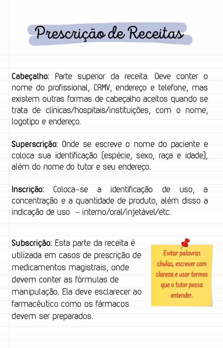 Cabeçalho: Parte superior da receita. Deve conter o nome do profissional, CRMV, endereço e telefone, mas existem outras formas de cabeçalho aceitos quando se trata de clínicas/hospitais/instituições, com o nome, logotipo e endereço. Superscrição: Onde se escreve o nome do paciente e coloca sua identificação (espécie, sexo, raça e idade), além do nome do tutor e seu endereço. Inscrição: Coloca-se a identificação de uso, a concentração e a quantidade de produto, além disso a indicação de uso - interno/oral/injetável/etc. Prescrição de Receitas Subscrição: Esta parte da receita é utilizada em casos de prescrição de medicamentos magistrais, onde devem conter as fórmulas de manipulação. Ela deve esclarecer ao farmacêutico como os fármacos devem ser preparados. Doxiciclina (100 mg) Dra Ana Souza Brito CRMV- SP: 5632 Indicação/Instrução: Indica o modo como o medicamento deve ser administrado, sua via de administração intervalo entre doses e tempo de tratamento. Assinatura/Rúbrica: Deve-se colocar o local, data e a assinatura do profissional inscrito no Conselho. Clinica VetLove Rua Bela Vista, 600 São Paulo - SP Tel.: 878-8766 Para: Bob, felino, macho, 4 anos Tutor: Mariana Lopes da Silva Endereço: Rua José da Silva, apt. 4 São Paulo - SP Uso oral 1 caixa Administrar 1 comprimido, por via oral, de 24/24 horas, durante 21 dias. São Paulo, 14 de março de 2020 Cabeçalho Superscrição Inscrição Indicação Assinatura RECEITUARIO COMUM