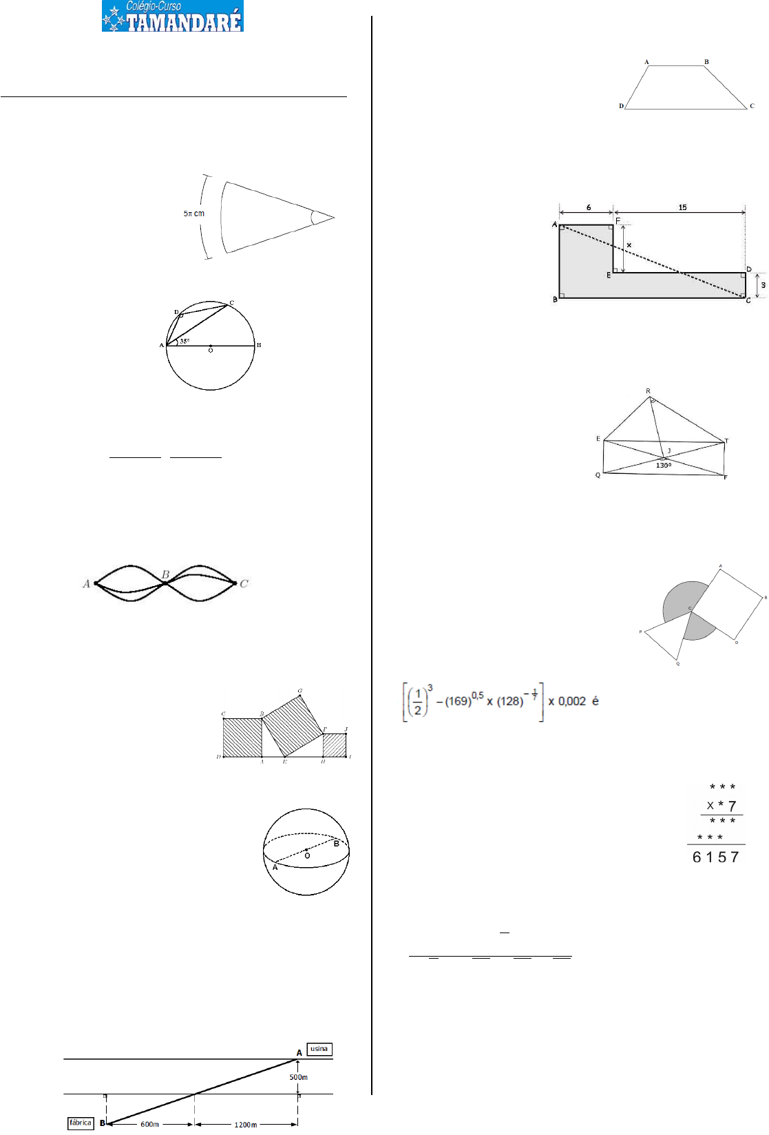 Professor: Deivid Matemática – Pré-Técnico 1. (Epcar)Uma franquia de Fast Food vende fatias de pizza e uma de suas opções tem o formato abaixo representado. Sabendo que esta fatia é uma das oito fatias recortadas da pizza inteira (todas com o mesmo tamanho e formato), qual é o diâmetro da forma da pizza? a) 38 cm c) 42 cm b) 40 cm d) 20π cm 2. Medida do ângulo ADC inscrito na circunferência de centro O é: a) 125° b) 110° c) 120° d) 100° e) 135° 3. O valor da soma é: a)1/3 b)2/3 c) 1 d)4/3 e)2 4. Uma formiguinha vai caminhar de A até C passando por B, podendo passar apenas uma vez por esses pontos e pelos caminhos indicados na figura. Qual o número de maneiras diferentes que ela pode escolher para ir de A até C ? a) 3 b) 5 c) 7 d) 8 e) 9 5.(OBM) No desenho ao lado, o quadrado ABCD tem área de 64 cm2 e o quadrado FHIJ tem área de 36 cm2. Os vértices A, D, E, H e I dos três quadrados pertencem a uma mesma reta. Calcule a área do quadrado BEFG. 6. Um inseto vai se deslocar sobre uma superfície esférica de raio 50 cm, desde um ponto A até um ponto B, diametralmente opostos, conforme a figura. O menor trajeto possível que o inseto pode percorrer tem comprimento igual a: a) π/2 m. b) π m. c) 3π/2 m. d) 2π m. e) 3π m. 7. (Cefeteq)Às margens do rio Cotovia, construiu-se a usina hidrelétrica Luz do Mundo, conectada a uma fábrica junto à margem oposta. Essa conexão foi realizada por intermédio de um cabo elétrico representado, na figura abaixo, pelo segmento AB. Calcule o comprimento do cabo elétrico , de acordo com os dados desta figura: 8. (Cefeteq)As bases AB e DC do trapézio representado na figura abaixo medem 30 cm e 80 cm. Sabendo que o ângulo ABC é o dobro do ângulo CDA, calcular a medida do lado BC em cm. 9. (Cefeteq)A equação 10x2 + mx + p = 0 tem raízes ½ e -1/3. Determine o valor numérico de T= m – p. 10.(PII) Na figura abaixo estão representados um polígono ABCDEF e um triângulo ABC. Com base nas dimensões dadas, em centímetros, faça o que se pede: (a) Usando x, escreva uma fórmula que expresse a área do polígono ABCDEF. (b) Usando x, escreva uma fórmula que expresse a área do triângulo ABC. (c) Calcule o valor de x para que a medida da área do polígono ABCDEF seja igual à medida da área do triângulo ABC. 11.(Cefeteq) Na figura, ETFQ é um retângulo e ERJ é um triângulo equilátero. Determine a medida do ângulo JRT, sabendo que a medida do ângulo QJF é 130º. 12.(Cefet) A senha do e-mail de um usuário é formada por quatro algarismos em ordem crescente. Sabendo que o produto desses algarismos é 360 e o produto dos dois primeiros é igual a 12, qual o valor da soma dos algarismos dessa senha? 13.(Cefet)Nesta figura, o círculo C tem raio 12m. Sabe-se que CABD é um quadrado e CPQ é um triângulo eqüilátero. Calcule, em m² e em função de π, a área do círculo que está sombreada. 14.(Epcar) O valor da expressão Obs.: Considere x o sinal de multiplicação. a) −12,750 x10-3 c) 12,750 x10-6 b) −12,750 x10-6 d) 12,750 x10-1 15.(OBM) Na multiplicação ao lado, alguns algarismos, não necessariamente iguais, foram substituídos pelo sinal *. Qual é a soma dos valores desses algarismos? A) 17 B) 27 C) 37 D) 47 E) 57 16. O algarismo das unidades do número 1 3 5 … 97 99 é A) 1 B) 3 C) 5 D) 7 E) 9 17. (EEAR) A forma mais simples de se escrever a expressão é: 18. (CFS) Com vinho de qualidade A, de R$ 3,00 o litro, e o vinho de qualidade B, de R$ 2,00 o litro, encheu-se uma vasilha de 23 litros .Se a mistura de vinho vale R$ 55,00, então a diferença entre as quantidades de litros de vinho B e A é : 50 32 12 2 3 5 6 3 + - - + 2003 1001 1001 2002 2003 1001 1001 2003 3 . 4 9 . 2 3 . 4 9 . 2 +