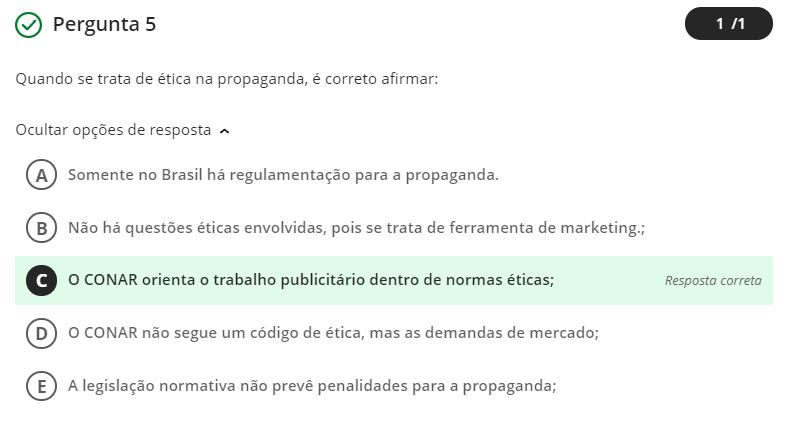 Quando se trata de ética na propaganda, é correto afirmar: A Somente no Brasil há regulamentação para a propaganda. B Não há questões éticas envolvidas, pois se trata de ferramenta de marketing. C o CONAR orienta o trabalho publicitário dentro de normas éticas; D CONAR não segue um código de ética, mas as demandas de mercado; E A legislação normativa não prevê penalidades para a propaganda;