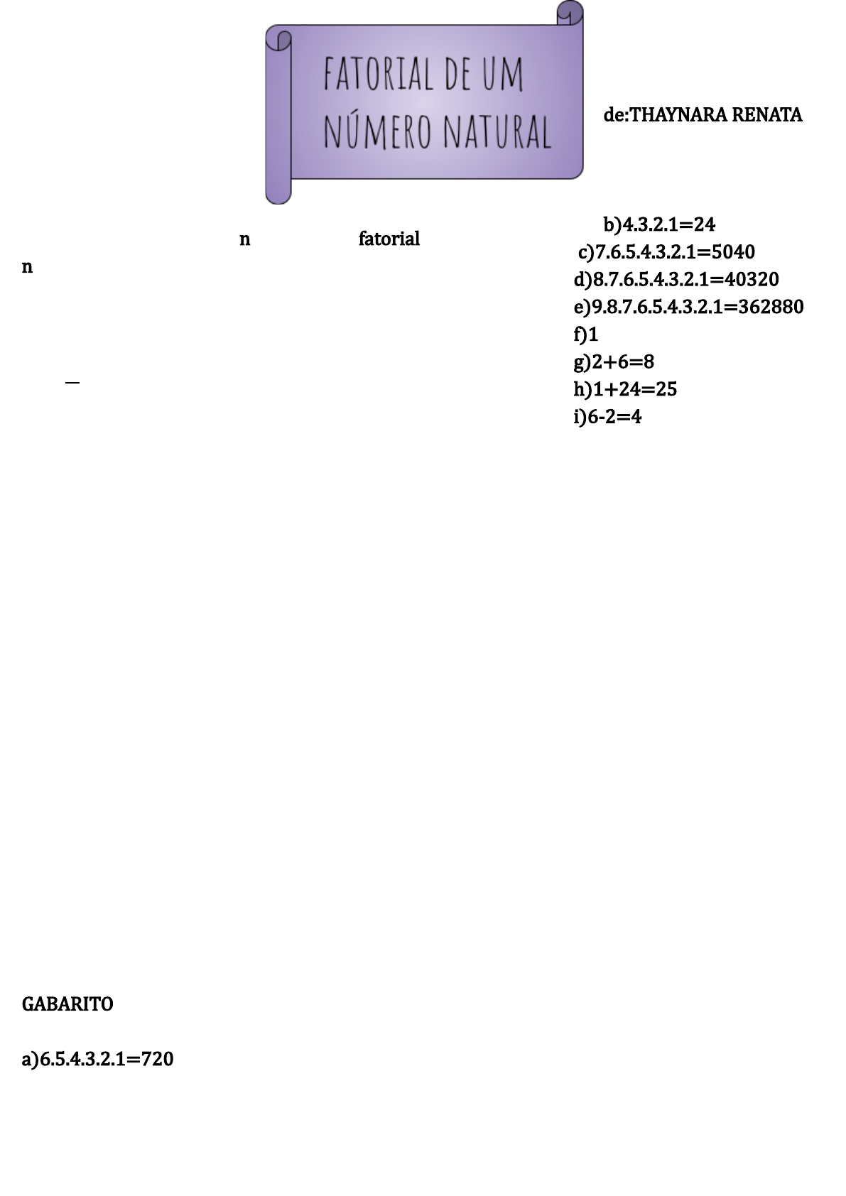 Dado um número natural n de�inimos o fatorial n (indicado por n!)por meio das relações: *Se n=0,então 0!=1. *Se n=1,então 1!=1. *Se n>2,então n!=n(n-1).(n-2). Assim,temos,por exemplo: 2!=2.1=2 3!=3.2.1=6 4!=4.3.2.1=24 5!=5.4.3.2.1=120 exemplos para treinar: 1-Calcule: a)6! b)4! c)7! d)8! e)9! f)0! g)2!+3! h)1!+4! i)3!-2! GABARITO a)6.5.4.3.2.1=720 de:THAYNARA RENATA b)4.3.2.1=24 c)7.6.5.4.3.2.1=5040 d)8.7.6.5.4.3.2.1=40320 e)9.8.7.6.5.4.3.2.1=362880 f)1 g)2+6=8 h)1+24=25 i)6-2=4