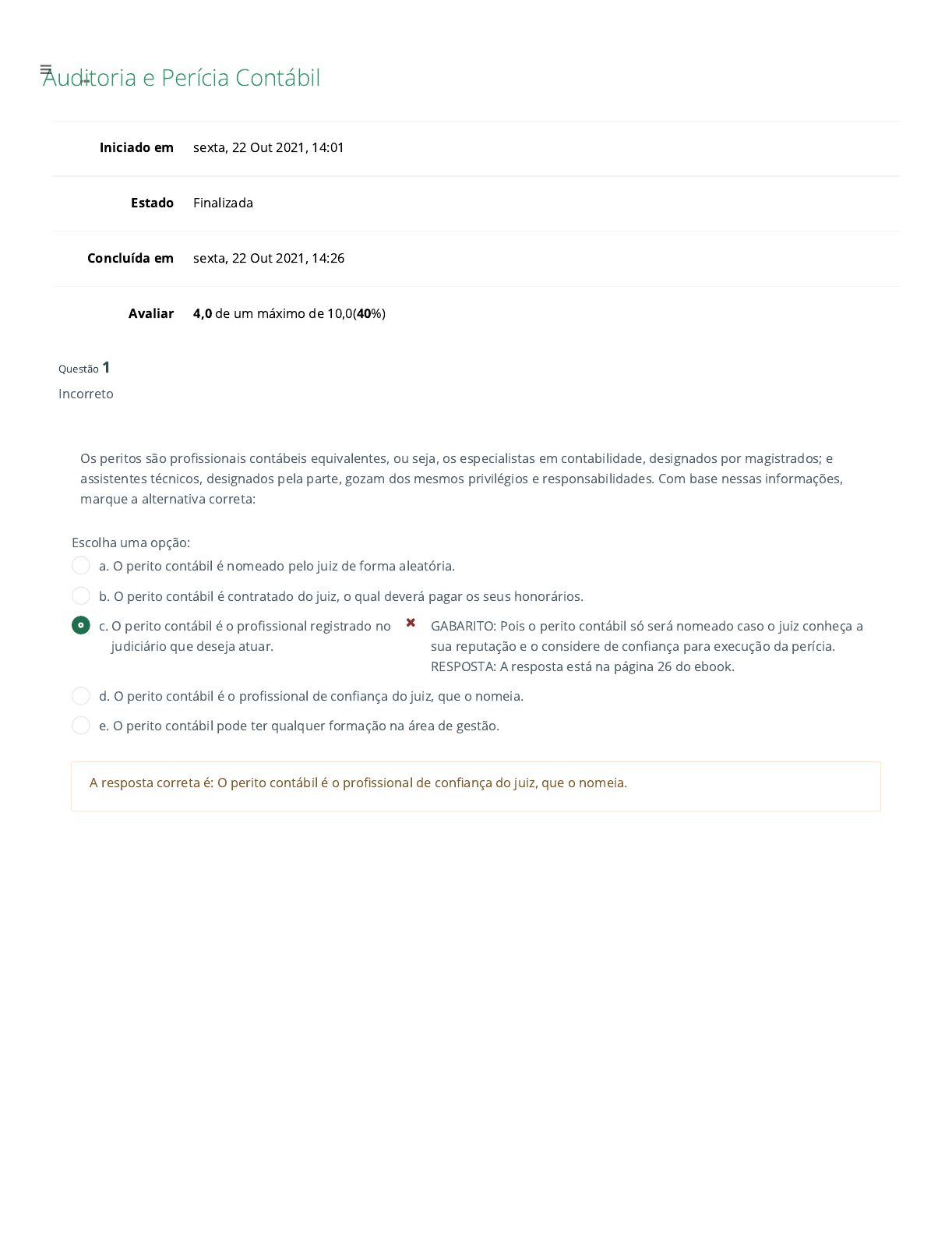 Auditoria e Perícia Contábil Iniciado em sexta, 22 Out 2021, 14:01 Estado Finalizada Concluída em sexta, 22 Out 2021, 14:26 Avaliar 4,0 de um máximo de 10,0(40%) Questão 1 Incorreto Os peritos são pro�ssionais contábeis equivalentes, ou seja, os especialistas em contabilidade, designados por magistrados; e assistentes técnicos, designados pela parte, gozam dos mesmos privilégios e responsabilidades. Com base nessas informações, marque a alternativa correta: Escolha uma opção: a. O perito contábil é nomeado pelo juiz de forma aleatória. b. O perito contábil é contratado do juiz, o qual deverá pagar os seus honorários. c. O perito contábil é o pro�ssional registrado no judiciário que deseja atuar. GABARITO: Pois o perito contábil só será nomeado caso o juiz conheça a sua reputação e o considere de con�ança para execução da perícia. RESPOSTA: A resposta está na página 26 do ebook. d. O perito contábil é o pro�ssional de con�ança do juiz, que o nomeia. e. O perito contábil pode ter qualquer formação na área de gestão. A resposta correta é: O perito contábil é o pro�ssional de con�ança do juiz, que o nomeia. https://aula.fael.edu.br/ Questão 2 Correto Questão 3 Correto O _____________________________ independente é o resumo de um trabalho prestado à empresa auditada, mas também aos investidores e, até mesmo, à sociedade. Marque a alternativa que preencheria esta lacuna: Escolha uma opção: a. Relatório de Auditoria. GABARITO: Pois é no relatório de auditoria que o pro�ssional expressa sua opinião. RESPOSTA: A resposta está na página 20 do ebook. b. Risco. c. Documento de Auditoria. d. Procedimento. e. Auditor. A resposta correta é: Relatório de Auditoria. Do perito contábil é exigido profundos conhecimentos técnico-cientí�cos para o exercício de sua função. Diante da atuação do perito contador, deve-se classi�car como: Escolha uma opção: a. Assistente técnico e perito adjunto. b. Perito judicial e assistente pericial. c. Assistente pericial e perito adjunto. d. Perito judicial e assistente técnico. GABARITO: Pois o perito nomeado pelo juiz é denominado de perito judicial, enquanto o perito contratado pelas partes é o assistente técnico. RESPOSTA: A resposta está na página 23 do ebook. e. Perito adjunto e assistente técnico. A resposta correta é: Perito judicial e assistente técnico. https://aula.fael.edu.br/ Questão 4 Incorreto Questão 5 Correto O laudo pericial contábil e o parecer pericial contábil são documentos elaborados pelo perito contador e assistente técnico. Em relação à expressa opinião do perito contador, assinale a alternativa correta: Escolha uma opção: a. Os termos técnicos utilizados devem ser inseridos nos documentos, pois eles caracterizam uma redação quali�cável ao trabalho pericial. b. Não é permitida a utilização de termos técnicos nos documentos elaborados pelos peritos contábeis, visto que o juiz não entende de contabilidade. c. Não são necessárias explicações sobre os termos técnicos relacionados à ciência contábil, pois a perícia está envolvida no âmbito judicial. d. Em relação à linguagem adotada pelo perito, deve-se atentar a uma descrição técnica robusta. e. Nesses documentos, devem ser evidenciados todos os processos utilizados para obtenção das provas, de forma técnica e concisa. GABARITO: Pois o perito poderá utilizar termos técnicos, desde que eles sejam descritos e quali�cáveis para informação. RESPOSTA: A resposta está na página XX do ebook. A resposta correta é: Os termos técnicos utilizados devem ser inseridos nos documentos, pois eles caracterizam uma redação quali�cável ao trabalho pericial. Compreende-se que o ______________ e ________________ são orientados e executados por peritos nomeados e assistentes técnicos, respectivamente, os quais devem adotar os seus próprios padrões e respeitar as leis, regulamentos administrativos e a estrutura especi�cada nessa norma. Marque a alternativa que preenche, respectivamente, as lacunas: Escolha uma opção: a. Laudo e relatório. b. Parecer e laudo. c. Relatório e laudo. d. Laudo e parecer. GABARITO: Pois as lacunas referem-se ao laudo e ao parecer, respectivamente. RESPOSTA: A resposta está na página 30 do ebook. e. Parecer e relatório. A resposta correta é: Laudo e parecer. https://aula.fael.edu.br/ Questão 6 Correto Questão 7 Incorreto Segundo Perez Júnior (2018), o relatório ____________________ é um parecer limpo, que após aplicar todos os procedimentos cabíveis ao auditor e não forem encontrados acontecimentos que possam in�uenciar na opinião emitida, torna-se um relatório sem modi�cação. Marque a alternativa que preencheria esta lacuna: Escolha uma opção: a. Com ressalva. b. Sem ressalva. GABARITO: Pois a opinião sem ressalva é o tipo de relatório em que o auditor sugere nenhum tipo de modi�cação e que as informações foram elaboradas de acordo com as normas aceitas. RESPOSTA: A resposta está na página 21 do ebook. c. Com parágrafo de ênfase. d. Com opinião adversa. e. Com abstenção de opinião. A resposta correta é: Sem ressalva. Zanna (2017) defende que o ___________________________ é apresentar a veracidade dos fatos econômicos, comerciais, tributários, de seguros, previdenciários, �nanceiros, trabalhistas, tributários e administrativos, de acordo com cada caso e conforme o que foi reivindicado na Inicial. Marque a alternativa que preencheria esta lacuna: Escolha uma opção: a. Exame da Perícia Contábil. b. Objeto da Perícia Contábil. GABARITO: Pois o objetivo da Perícia Contábil está na apresentação dos fatos contábeis e na sua veri�cação da verdade. RESPOSTA: A resposta está na página 29 do ebook. c. Procedimento da Perícia Contábil. d. Objetivo da Perícia Contábil. e. Evidência da Perícia Contábil. A resposta correta é: Objetivo da Perícia Contábil. https://au