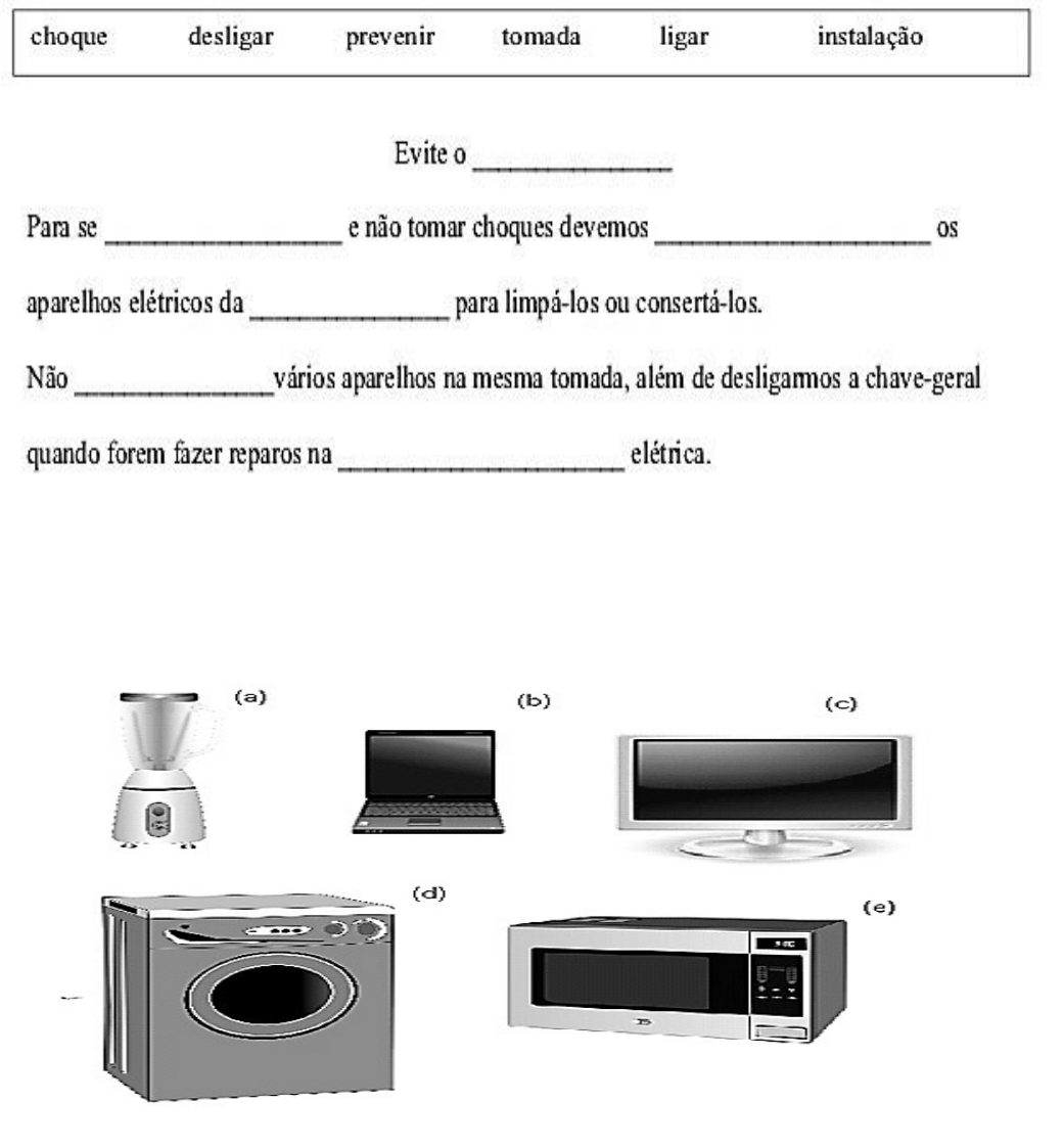Avaliação de História 1. . Leia o texto e complete escrevendo o que é mais adequado com a palavra escolhida no quadro abaixo: (0,6) 2. A eletricidade foi uma grande invenção que permitiu que as pessoas mudassem seus costumes. Faça a cruzadinha com o nome de objetos que necessitam de energia elétrica para funcionar. (0,5) 3. Aprendemos que a energia elétrica é utilizada para o funcionamento de algumas invenções, porém, algumas coisas não precisam de energia. Escolha na lista abaixo, as invenções que funcionam com energia elétrica e as invenções que não funcionam separando-as em colunas: (0,5) 4. Observe os objetos escreva seu nome e sua função: (0,3) 5. Pinte os erros: (0,5) 6. Escreva um cuidado que devemos ter ao utilizar objetos elétricos: (0,3) _________________________________________________________________________ 7. Antigamente era utilizado para conservar os alimentos. Marque a resposta correta: (0,3) ( ) Sal ( ) Pimenta ( ) Açúcar 8. Escreva o nome de 4 aparelhos elétricos utilizados em sua casa: (0,3) __________________________________________________________________________ __________________________________________________________________________ 9. Vamos lembrar sobre o natal: O Natal é uma festa cristã celebrada em 25 de dezembro para comemorar o nascimento de Jesus Cristo. É celebrada em várias partes do mundo. Nessa época, no Brasil e em outros países onde grande parte da população é cristã, é comum a troca de presentes e os votos de paz e de fraternidade entre as pessoas. a) Em que data é celebrado o nata? (0,4) __________________________________________________________________________ b) O que comemoramos no natal? (0,4) __________________________________________________________________________ c) Pinte as gravuras que lembram o natal: (0,4) d) Complete a cruzadinha com os nomes de alguns símbolos do natal: (0,5) Professora Cleide 2° Ano