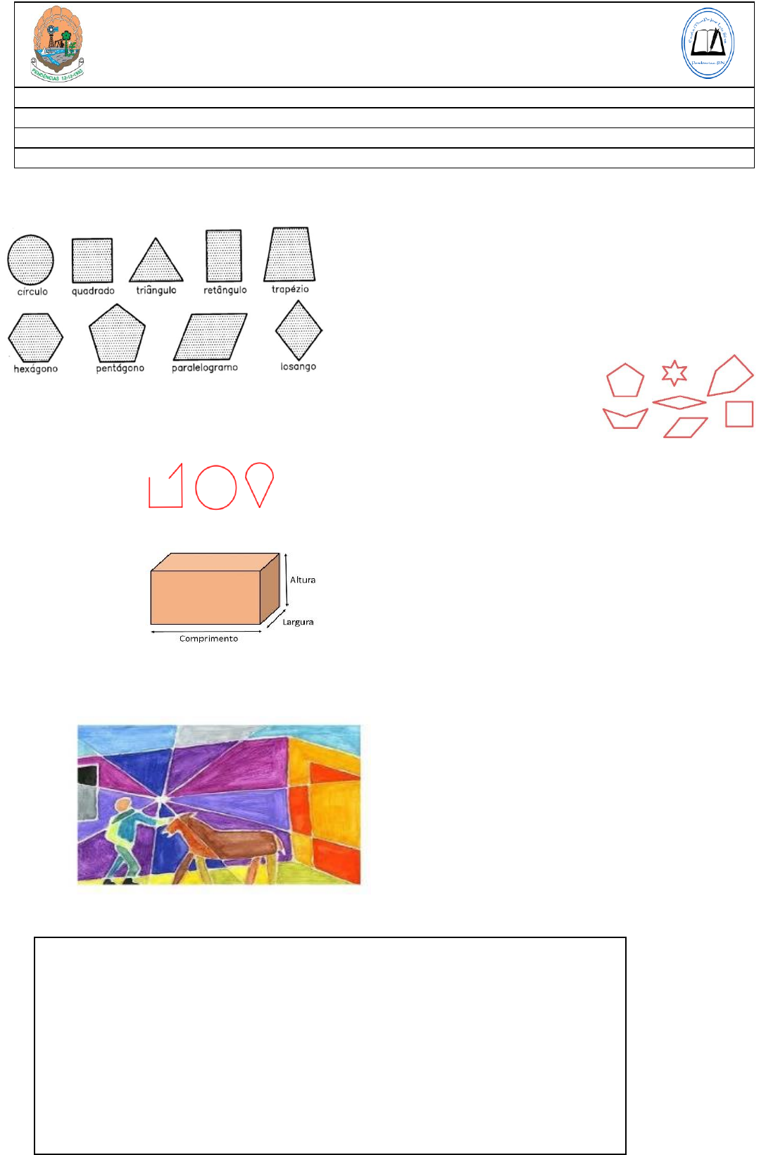 SECRETARIA MUNICIPAL DE EDUCAÇÃO ESCOLA MUNICIPAL PADRE JOSÉ LUIZ SILVA ENSINO FUNDAMENTAL DE ANOS INICIAIS E FINAIS Aluno (a): Professor(a): Elizabete Contato: (84) 9 9690-2001 Série/Ano: 6º ano Turma: A ( ) B ( ) Turno: Vespertino Componente Curricular: ARTES ATIVIDADE SÁBADO LETIVO 23/10/2021 ASSUNTO: Formas Geométricas Formas geométricas são as formas das coisas que existem. Podem ser planas ou espaciais. 1) Planas: são aquelas que possuem apenas duas dimensões, comprimento e largura. Essas são classificadas em Polígonos e não polígonos. a) Polígonos: são formas geométricas planas formadas por uma linha fechada e cujos lados são apenas segmentos de reta, ou seja, não são arredondados. Ex: b) Não Polígonos: são aquelas formadas por uma linha aberta ou as que possuem partes arredondadas. Ex: 2) Espaciais: também conhecidas como sólidos geométricos, são aquelas que possuem três dimensões: comprimento, largura e altura. Ex: ATIVIDADE 1) Na obra de Paul Klee, foram usadas várias formas. Qual foi usado mais vezes? a) círculo b) quadrado c) retângulo d) triângulo 2) Faça sua obra de Arte usando formas geométricas. Use a Criatividade. Pinte! https://escolaeducacao.com.br/solidos-geometricos/