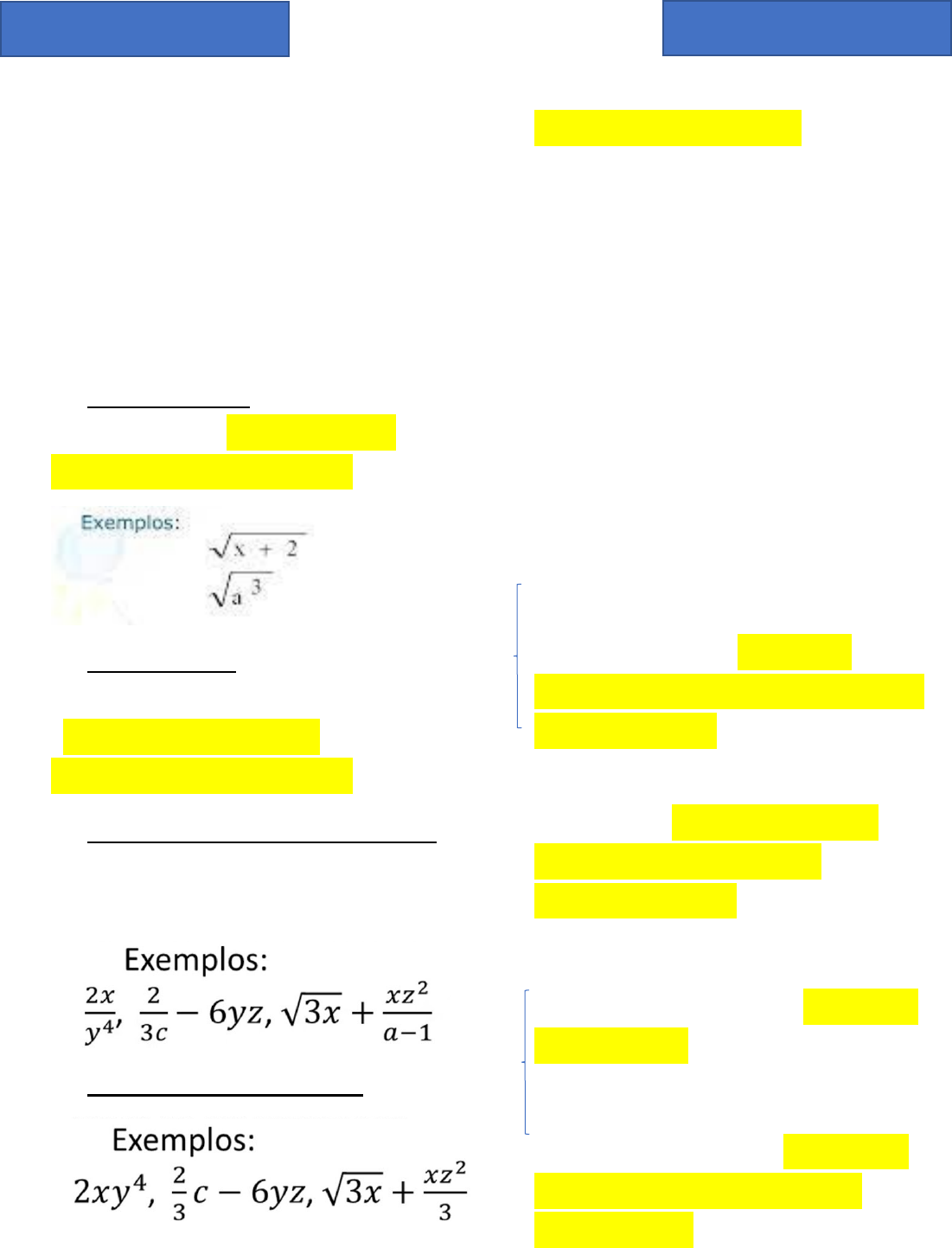 Polinômios Expressões Algébricas > Compostas por letras (variáveis) e números ou apenas letras. · Classificação: > Irracionais - variável no radical (uma letra dentro do radical) > Racionais - não tem variável no radical (nenhuma letra dentro do radical) > Racionais Fracionárias - têm variável no denominador > Racionais Inteiras Monômio > Expressão algébrica racional inteira (não tem letra dentro do radical e nem no dominador) formada por um número real ou apenas uma variável real (uma letra) ou produtos de números e variáveis. Exemplos: 1) x Coeficiente: 1 Parte literal (a letra acompanhada de seus expoentes, caso houver): x Grau: 1 (quando não tem expoente, é elevado a 1) 2) -13x2y2 Coeficiente: -13 (o sinal vai junto!) Parte Literal: x2y2 Grau: 2+2 = 4 (a soma dos expoentes das variáveis) 3) Coeficiente: 1/2 Parte Literal: Grau: 4+1 = 5 4) 16 Coeficiente: 16 Parte Literal: NÃO TEM Grau: Zero (toda vez que tivermos um monômio sem parte literal, ele terá grau zero!) Polinômio > Adição algébrica de monômios (quando eu somo ou subtraio vários monômios) > Todo monômio é um polinômio, mas nem todo polinômio será um monômio. Exemplos: 1) 2y2 + x y z (binômio - polinômio formado por 2 monômios) - grau: 3 (sempre vence o maior - variáveis diferentes) 2) y2 - 7y +10 (trinômio - 3 monômios) - grau: 2 (o maior expoente que essa variável possui - variáveis iguais) Adição e Subtração de polinômios (Devemos inverter os sinais do polinômio que estiver após o sinal de negativo) Multiplicação de polinômios 1) Aplicar a propriedade distributiva (am . an = am+n) 2) Juntar os termos semelhantes (caso existam) * Polinômio completo e ordenado - Ordenado: expoentes de forma decrescente - Completo; não tem nenhuma lacuna Divisão de polinômios * É importante que o dividendo e o divisor estejam na sua forma ordenada (do maior expoente para o menor) 1) Dividir primeiro o termo de maior expoente do dividendo pelo primeiro termo de maior expoente do divisor 2) Só posso parar de dividir quando o grau do resto for menor que o grau do divisor