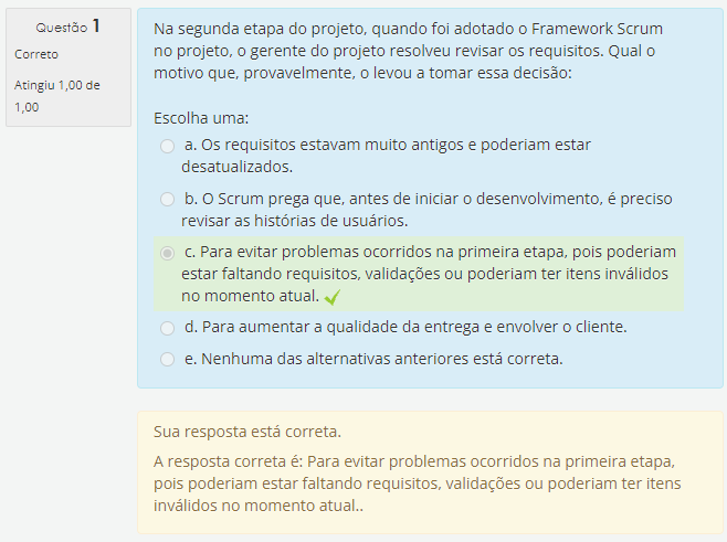 Na segunda etapa do projeto, quando foi adotado o Framework Scrum Correto no projeto, o gerente do projeto resolveu revisar os requisitos. Qual o motivo que, provavelmente, o levou a tomar essa decisão: a. Os requisitos estavam muito antigos e poderiam estar desatualizados. b. Scrum prega que, antes de iniciar o desenvolvimento, é preciso revisar as histórias de usuários. Para evitar problemas ocorridos na primeira etapa, pois poderiam estar faltando requisitos, validações ou poderiam ter itens inválidos no momento atual. d. Para aumentar a qualidade da entrega e envolver O cliente. e. Nenhuma das alternativas anteriores está correta.