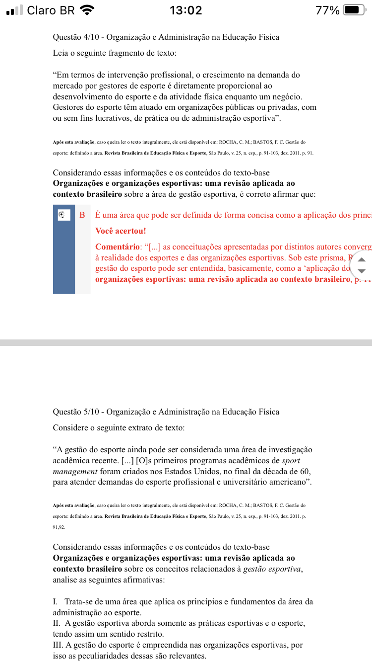 Considere o seguinte extrato de texto: "A gestão do esporte ainda pode ser considerada uma área de investigação acadêmica recente. [...] [O]s primeiros programas acadêmicos de sport management foram criados nos Estados Unidos, no final da década de 60, para atender demandas do esporte profissional e universitário americano". Após esta avaliação, caso queira o texto integralmente, ele está disponível em: ROCHA, C. M.; BASTOS, F.C. Gestão do esporte: definindo a área. Revista Brasileira de Educação Física e Esporte, São Paulo, v. 25, n. esp., p. 91-103, 2011. p. 91,92. Considerando essas informações e os do texto-base Organizações e organizações esportivas: uma revisão aplicada ao contexto brasileiro sobre os conceitos relacionados à gestão esportiva, analise as seguintes afirmativas: I. Trata-se de uma área que aplica os princípios e fundamentos da área da administração ao esporte. II. A gestão esportiva aborda somente as práticas esportivas e o esporte, tendo assim um sentido restrito. III. A gestão do esporte é empreendida nas organizações esportivas, por isso as peculiaridades dessas são relevantes.