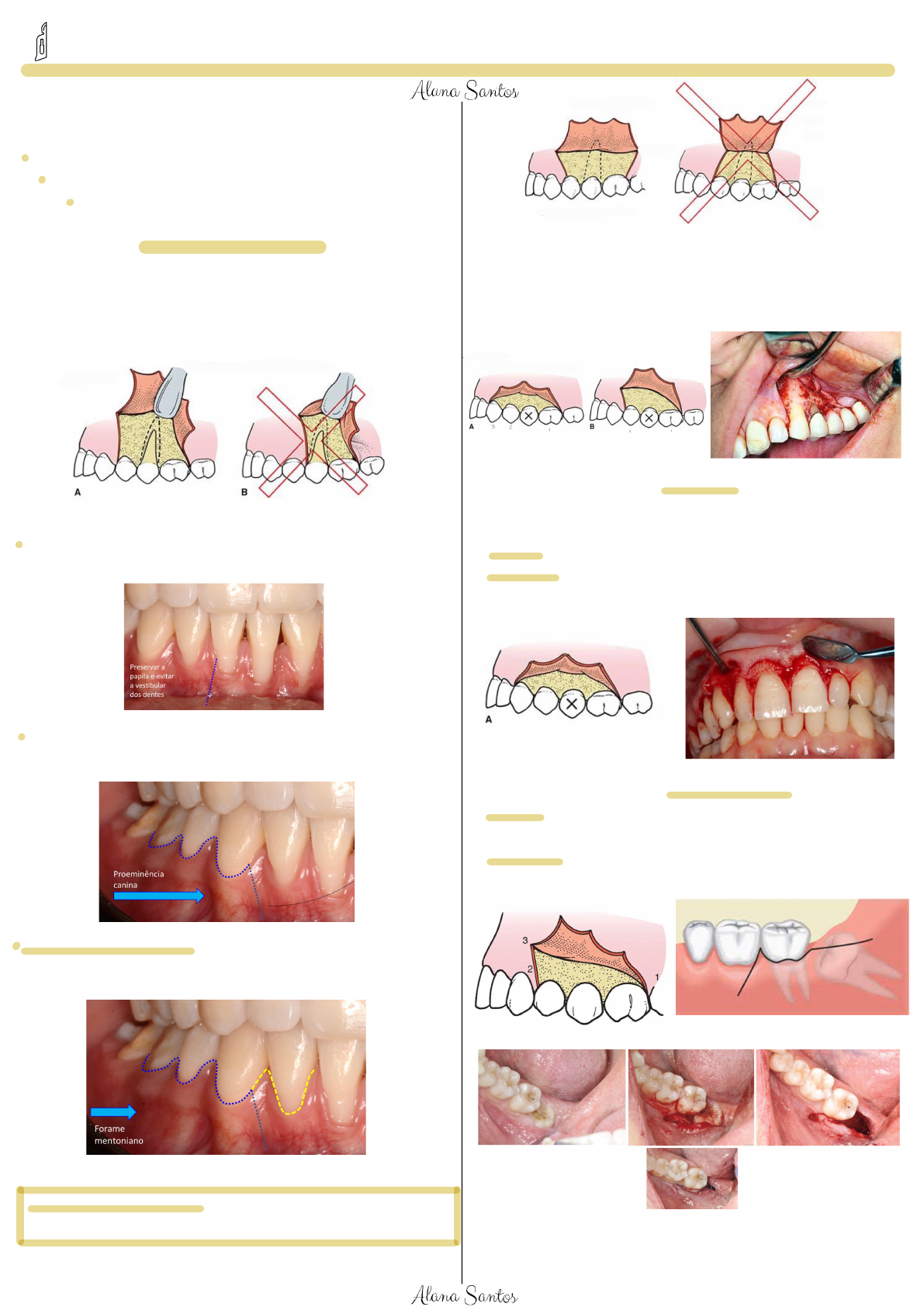 Tipos de Retalhos/Incisões em Cirurgia Oral O retalho de tecido mole deve ser delineado para expor o campo cirúrgico e promover cicatrização adequada: - delimitado por uma incisão cirúrgica que permitem seu bom suprimento sanguíneo; - possibilitar o acesso cirúrgico aos tecidos profundos, como o tecido ósseo; - pode ser recolocado na posição original e mantido com suturas. Retalhos Cirúrgicos Incisão Relaxante Vertical - devem ser feitas sobre o osso que permanecerá intacto após o termino do procedimento cirúrgico, pelo menos 6 a 8mm distante do defeito ósseo criado pela cirurgia. Antecipar o quanto de osso será removido. - Devem atravessar a margem gengival livre na borda de um dente, mas não são diretamente na região vestibular do dente, nem diretamente na papila. - Devem evitar proeminências ósseas como a eminências canina onde há maior probalidade de tensão na linha de sutura, o que pode resultar em deiscência na ferida. - Evitar lesão ao nervo mentoniano. Convém incisões do tipo envelope, se possível, as incisões relaxantes devem ser ou bem anteriores ou posteriores ao local ao forame mentoniano. Suprimento Sanguíneo do Retalho: A base do retalho deve ser normalmente mais larga que a margem livre ~> Sem suprimento sanguíneo, pode causar necrose. Acesso Cirúrgico - deve gerar excelente visualização do local cirúrgico e facilitar a inserção de instrumentais usados na cirurgia. Além disso, as incisões agudas cicatrizam mais rapidamente que o tecido dilacerado. Retalho Envelope - É indicado para dentes inclusos localizados próximos à região cervical dos dentes adjacentes erupcionados e isolados, através de incisão linear no rebordo alveolar. - Vantagens: menos sangramento e facilidade de reposicionamento. - Desvantagens: reduzido acesso e visualização, dificuldades de relaxamento e rebatimento, podendo ocorrer dilacerações. Retalho Triangular - É indicado para todos os dentes inclusos de uma forma geral. - Vantagens: bom acesso e visualização, possibilidade de ampliação, facilidade de reposicionamento (inicio da sutura no ângulo entre as incisões horizontal e relaxante). - Desvantagens: cicatriz em áreas estéticas devem ser evitadas. = : - g- → 1- Retalho Quadrangular (trapezoidal) - É indicado para todos os dentes inclusos de uma forma geral, preferencialmente para aqueles localizados muito distante da região cervical de dentes vizinhos erupcionados. - Vantagens: ótimo acesso e visualização, facilidade de reposicionamento. - Desvantagens: impossibilidade de ampliação. - Preservação das papilas; - Incisão cervical realizada em área de gengiva inserida com incisão reta ou seguindo a anatomia do contorno da região cervical dos dentes. - Gengiva inserida não descolada deve ter no mínimo 5mm. Retalho/Incisão Semilunar - É indicado para acesso ao ápice radicular (cirurgias parendodônticas) e dentes inclusos localizados distantes da região cervical dos dentes erupcionados vizinhos (geralmente na região apical) - Vantagens: preserva a margem gengival, facilidade de reposicionamento (iniciar a sutura no centro da incisão). - Desvantagens: acesso reduzido as regiões cervicais da raiz. - Deve ser realizado em gengiva inserida e não em mucosa alveolar, mínimo 5mm para não ocorrer necrose. Retalho/Incisão em “Y” - É indicada para remoção de Tórus Palatino. Referências e Imagens - Aula da Prof. Cristiane Salmon e Cirurgia Oral e Maxilofacial Contemporânea. James R. Hupp, Edward Ellis III e Myron R. Capítulo 9 e 10 - Ed. 6 l