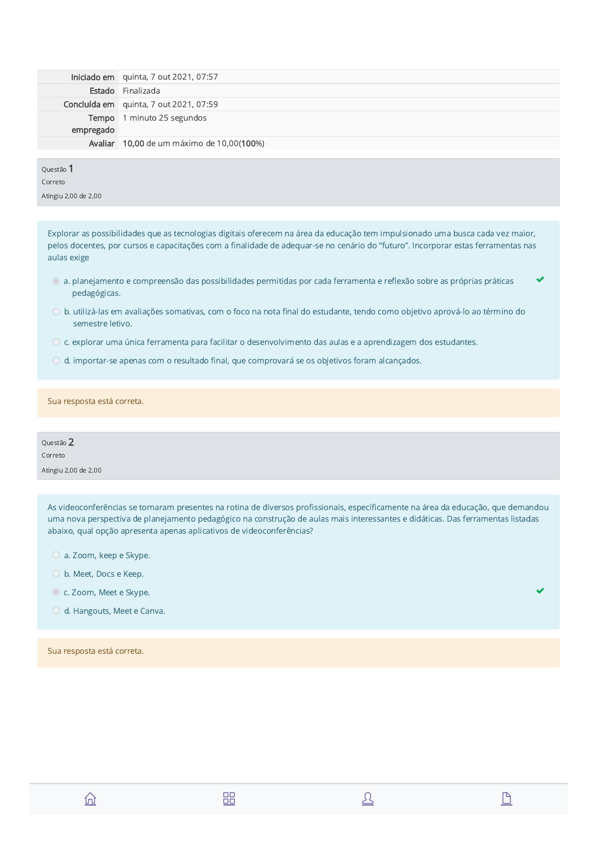 07/10/21, 07:59 Atividade: Revisão da tentativa https://eskadauema.com/mod/quiz/review.php?attempt=2701909&cmid=2498 1/3 Iniciado em quinta, 7 out 2021, 07:57 Estado Finalizada Concluída em quinta, 7 out 2021, 07:59 Tempo empregado 1 minuto 25 segundos Avaliar 10,00 de um máximo de 10,00(100%) Questão 1 Correto Atingiu 2,00 de 2,00 Questão 2 Correto Atingiu 2,00 de 2,00 Explorar as possibilidades que as tecnologias digitais oferecem na área da educação tem impulsionado uma busca cada vez maior, pelos docentes, por cursos e capacitações com a �nalidade de adequar-se no cenário do “futuro”. Incorporar estas ferramentas nas aulas exige a. planejamento e compreensão das possibilidades permitidas por cada ferramenta e re�exão sobre as próprias práticas pedagógicas. b. utilizá-las em avaliações somativas, com o foco na nota �nal do estudante, tendo como objetivo aprová-lo ao término do semestre letivo. c. explorar uma única ferramenta para facilitar o desenvolvimento das aulas e a aprendizagem dos estudantes. d. importar-se apenas com o resultado �nal, que comprovará se os objetivos foram alcançados. Sua resposta está correta. As videoconferências se tornaram presentes na rotina de diversos pro�ssionais, especi�camente na área da educação, que demandou uma nova perspectiva de planejamento pedagógico na construção de aulas mais interessantes e didáticas. Das ferramentas listadas abaixo, qual opção apresenta apenas aplicativos de videoconferências? a. Zoom, keep e Skype. b. Meet, Docs e Keep. c. Zoom, Meet e Skype. d. Hangouts, Meet e Canva. Sua resposta está correta. https://eskadauema.com/my https://eskadauema.com/index.php?redirect=0 https://eskadauema.com/user/edit.php?id= https://eskadauema.com/theme/olm/certificates.php 07/10/21, 07:59 Atividade: Revisão da tentativa https://eskadauema.com/mod/quiz/review.php?attempt=2701909&cmid=2498 2/3 Questão 3 Correto Atingiu 2,00 de 2,00 Questão 4 Correto Atingiu 2,00 de 2,00 Questão 5 Correto Atingiu 2,00 de 2,00 As autoras Glaucia Brito e Ivonélia da Puri�cação (2012, p. 40) a�rmam que “se as tecnologias educacionais não forem bem utilizadas, garantem a novidade por algum tempo, mas não acontece, realmente, uma melhoria signi�cativa na educação”. Sendo assim é necessário a. escolher os recursos que atenderão os anseios docentes, levando em consideração que toda situação de aprendizagem se resume em um mesmo método independentemente da realidade vivenciada por cada estudante. b. entender que não existe necessidade de estudar os recursos a serem utilizados nas aulas, uma vez que todos são intuitivos e de fácil acesso e são apenas mais um material didático nas aulas. c. analisar cada situação de aprendizagem na aplicação das tecnologias digitais em aulas. Os recursos tecnológicos utilizados não podem ser resumidos apenas em mais um material didático, sem uma �nalidade. d. que o estudante já tenha domínio de todas as ferramentas tecnológicas digitais, cabendo ao docente, apenas o papel de mediador da aprendizagem, lembrando que aprendizagem sempre se resume em um mesmo método. Sua resposta está correta. Complete a lacuna do texto abaixo: Com o você pode criar formulários personalizados, agregando a eles links, imagens e escolha de fonte, além de ter acesso ao seu formulário de onde estiver. Compartilhe o link de seu questionário em redes sociais, e-mails, sites etc. Você obtém a análise de seus dados de forma automática. Em tempo real terá acesso a grá�cos e, ainda, poderá visualizá-los em planilhas. Forms Sua resposta está correta. Segundo Ahmed El Khatib e Antonio Chizzotti (2020, p.29), “A tecnologia de videoconferência é um meio de comunicação que permite que usuários conectados compartilhem recursos visuais e de áudio em tempo real”. Assim a videoconferência como ferramenta síncrona de comunicação, aproxima-se da interação presencial (PESCE; HESSEL; BRUNO, 2010). Qual aplicativo abaixo é utilizado para videoconferência? a. Pocket b. MindMeister c. Zoom d. Forms Sua resposta está correta. https://eskadauema.com/my https://eskadauema.com/index.php?redirect=0 https://eskadauema.com/user/edit.php?id= https://eskadauema.com/theme/olm/certificates.php 07/10/21, 07:59 Atividade: Revisão da tentativa https://eskadauema.com/mod/quiz/review.php?attempt=2701909&cmid=2498 3/3 Termos de uso Política de privacidade https://eskadauema.com/admin/tool/policy/view.php?policyid=1&versionid=3 https://eskadauema.com/admin/tool/policy/view.php?policyid=2&versionid=2 https://eskadauema.com/my https://eskadauema.com/index.php?redirect=0 https://eskadauema.com/user/edit.php?id= https://eskadauema.com/theme/olm/certificates.php