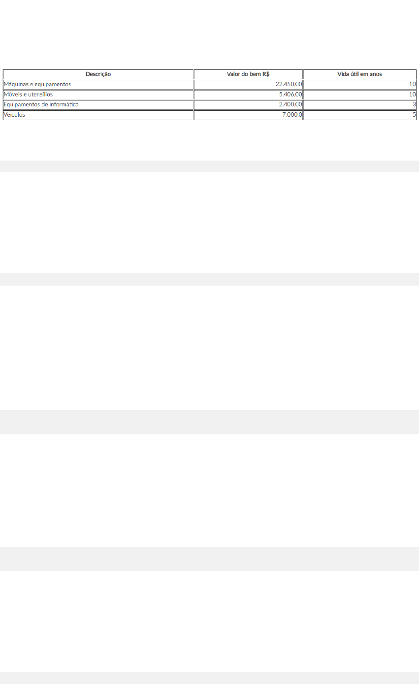 Cálculo da depreciação e amortização 1. Os bens do ativo não circulante (imobilizado) desgastam-se ao longo do tempo, dependendo da sua vida útil na operacionalização nas empresas. Esses desgastes são contabilizados como “despesas de depreciação” no exercício. Conforme quadro a seguir, podemos calcular a depreciação anual dos itens abaixo: R$4.985,00. Calculando as depreciações individuais, encontramos R$4.985,00. 2. Os itens constantes do ativo não circulante (imobilizado), utilizados para uso operacional da empresa, são depreciáveis conforme legislação do imposto de renda, exceto: Terrenos A conta Terrenos é do ativo não circulante, mas não é depreciável. 3. A empresa Só Exploração de Minério Ltda., líder nacional, adquiriu a concessão de explorar uma jazida de minério de ferro no Pará, no prazo de 30 anos, pelo valor de R$9.000.000,00. A Só Exploração de Minério Ltda. contabiliza o valor da amortização mensalmente no seu balanço patrimonial. Assinale a alternativa que apresenta o valor correto da amortização mensal. R$25.000,00. O valor da amortização é calculado pelo valor do investimento total dividido pelo prazo de exploração, e desse resultado dividimos por 12 meses, para acharmos o valor mensal. 4. Na contabilização da despesa de depreciação de R$5.000,00, mensalmente, de um veículo adquirido pela empresa RR Comercial Ltda., no valor R$60.000,00, a contabilidade registrou o seguinte lançamento: D = despesas de depreciação de veículos R$5.000,00 / C = depreciação acumulada de veículos R$5.000,00 O valor do débito de Despesas de Depreciação e Crédito de Depreciação Acumulada de Veículos são ambos R$5.000,00. 5. A depreciação é calculada de acordo com a vida útil do bem, considerada como “despesa”, ou seja, reduz-se o resultado final da empresa. Em relação à depreciação, assinale a alternativa correta. Ela não é obrigatória perante o imposto de renda. A depreciação não é obrigatória pelo Imposto de Renda.