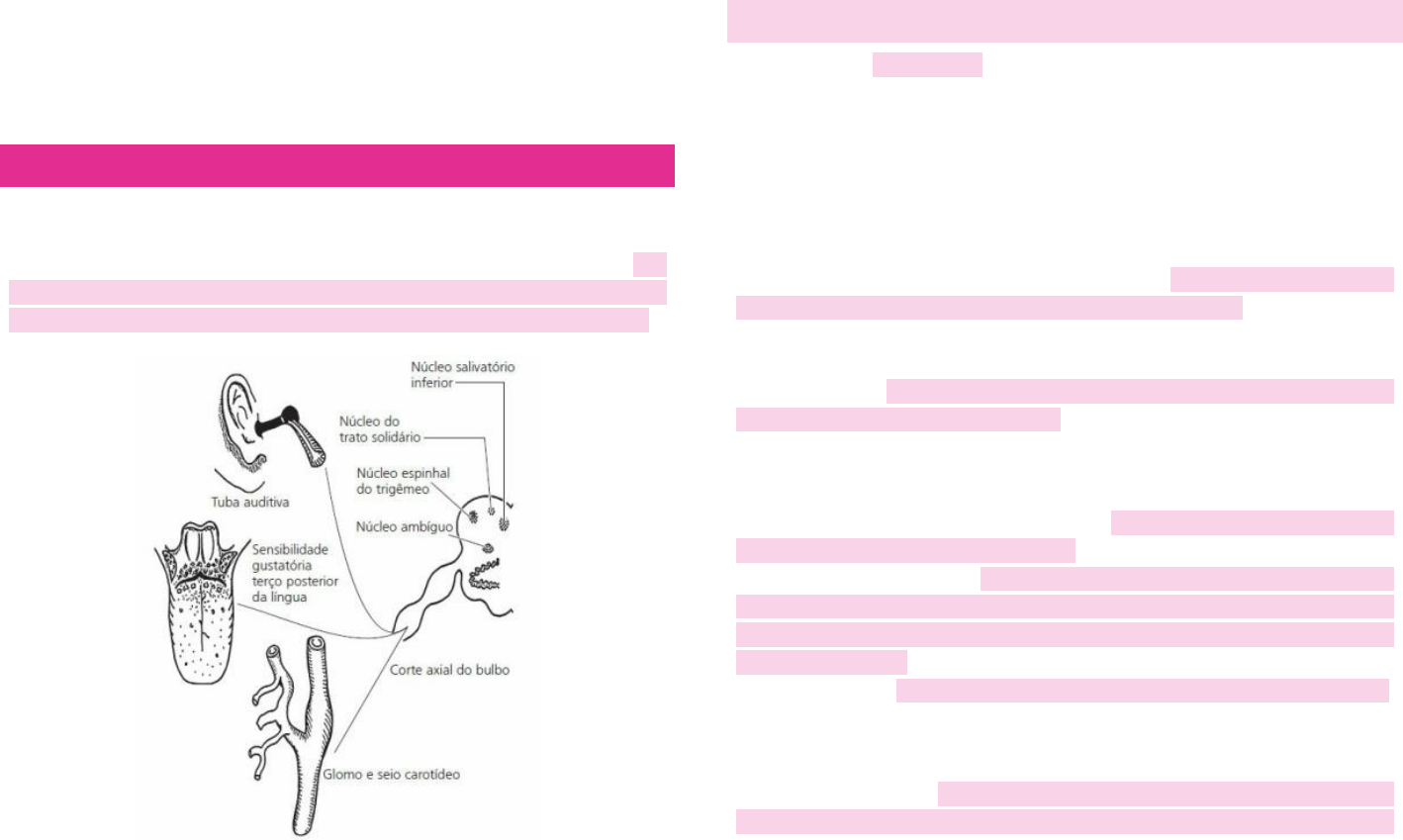 @resumosdamed_ 1 SEMIOLOGIA DOS NERVOS CRANIANOS IX, X, XI E XII NERVOS GLOSSOFARÍNGEO (IX) E VAGO (X): Os nervos glossofaríngeo (NC IX) e vago (NC X) são estudados em conjunto por serem raras as manifestações clínicas de um deles isoladamente. Eles estão relacionados anatomicamente: nos núcleos bulbares em comum, pelo trajeto de saída na base do crânio e na inervação de diversas estruturas de forma redundante. ANATOMIA E FISIOLOGIA DO GLOSSOFARÍNGEO (IX): O NC IX é um nervo misto, com fibras motoras e sensitivas (aferentes especiais para gustação, aferentes somáticas e aferentes viscerais gerais), além de fibras autonômicas parassimpáticas. Os núcleos motores, que recebem inervação bilateral dos tratos córticobulbares, estão localizados no bulbo dorsolateral, na porção rostral do núcleo ambíguo. Emitem fibras que emergem entre a oliva inferior e o pedúnculo cerebelar inferior, em um mesmo plano vertical entre os nervos cranianos VII e X. O trajeto de saída no forame jugular é compartilhado pelos NC IX, X e XI. Estes primeiros inervam de forma compartilhada os músculos faríngeos com menor contribuição do NC IX e maior do NC X, à medida que se aproxima do esôfago. O único músculo inervado isoladamente pelo glossofaríngeo é o estilofaríngeo (para elevação e dilatação da faringe). Os neurônios sensitivos estão localizados nos gânglios glossofaríngeos superior (jugular) e inferior (petroso). As fibras aferentes especiais conduzem sensibilidade gustatória (sobretudo para o amargo) do terço posterior da língua. As fibras aferentes viscerais gerais recebem informação das mucosas da faringe, palato mole, terço posterior da língua, corpo carotídeo (quimiorreceptores) e seio carotídeo (barorreceptores). Estes estão envolvidos no controle reflexo autonômico da frequência cardíaca, pressão arterial e respiração. Estas fibras sensitivas fazem sinapse com o núcleo do trato solitário. As aferentes somáticas gerais recebem a informação exteroceptiva de diversos ramos. Do plexo e do ramo timpânico recebem a sensação das mucosas da cavidade timpânica, das células @resumosdamed_ 2 mastoides e do canal auditivo. Dos ramos linguais, a sensação do terço posterior da língua, assim como os ramos faríngeos e os tonsilares que recebem das estruturas correlatas. Os axônios destes gânglios fazem sinapse com os núcleos trigeminais. O núcleo salivatório inferior no bulbo emite as fibras parassimpáticas para a glândula parótida. ANATOMIA E FISIOLOGIA DO NERVO VAGO (X): O NC X é um nervo misto com fibras motoras, sensitivas (aferentes somáticas e aferentes viscerais gerais) e autonômicas parassimpáticas. Possui um núcleo motor comum com o IX, XI, o núcleo ambíguo, que recebe conexões do trato córtico-bulbar originadas da porção inferior do giro pré-central. A inervação destes núcleos é bilateral, mas preferencialmente contralateral. Após a emergência do bulbo, entre a oliva inferior e o pedúnculo cerebelar inferior em um mesmo plano vertical e caudalmente ao IX, as fibras passam pelo forame jugular junto com o IX e XI e se dividem em três ramos motores na região cervical: • Ramo Faríngeo: inerva os músculos estriados esqueléticos correspondentes juntamente com o IX, exceto o estilofaríngeo. • Ramo Laríngeo Superior: inerva o cricotireoide. • Ramo Laríngeo Recorrente: inerva os demais músculos laríngeos. Na porção superior do forame jugular, localiza-se o gânglio vagal superior, que recebe aferências somáticas de dor, temperatura e tato da faringe, canal auditivo, superfície externa do tímpano (em territórios adjacentes e, às vezes, sobrepostos à inervação do V e IX), além da laringe e meninges da fossa posterior. As fibras do gânglio superior fazem sinapse com o núcleo do trato espinhal do trigêmeo. Logo abaixo do forame jugular localiza-se o gânglio vagal inferior, que recebe aferências viscerais gerais e especiais. As viscerais gerais têm origem na faringe, laringe, traqueia, brônquios, pulmões, coração, esôfago, vísceras abdominais, quimiorreceptores e barorreceptores da aorta. Já as aferências especiais (gustação) têm origem nas cartilagens epiglote e aritenoides. O núcleo dorsal do vago localiza-se dorsolateralmente ao núcleo do hipoglosso. Recebe sinapses de centros corticais superiores e do hipotálamo. Projeta fibras parassimpáticas pré-ganglionares craniossacrais para todos as vísceras inervadas pelo vago, com exceção do coração, que tem fibras parassimpáticas originadas no núcleo ambíguo. O estímulo vagal parassimpático produz bradicardia, hipotensão, broncoconstrição, broncorreia, aumento @resumosdamed_ 3 de peristaltismo, aumento de secreção gástrica e inibição de função adrenal. EXAME CLÍNICO: Deve-se sempre atentar a sintomas e sinais associados que possam indicar acometimento no tronco encefálico, cérebro ou demais estruturas fora do sistema nervoso central (como o trajeto cervical ou infracervical de ramos mais distais). A combinação e/ou presença de um ou mais achados define o diagnóstico topográfico e, até mesmo, pode restringir os diagnósticos etiológicos. Manifestações motoras e o reflexo de engasgo são os mais importantes. É possível testar o reflexo oculocardíaco (Reflexo de Aschner), que consiste na compressão da córnea do globo ocular, ocasionando bradicardia (redução de 5 a 10 batimentos por minuto). O reflexo de engasgo possui aferência sobretudo do NC IX e eferência pelo NC IX e X com centro no bulbo. Estimulam-se com abaixador de língua, em um dos lados, as seguintes estruturas: arco palatofaríngeo, faringe posterior, base da língua ou região úvulo- palatal. Ocorre uma contração reflexa com elevação do palato mole para fechar a nasofaringe, fechamento da glote e constrição da faringe. É importante lembrar que pouco mais de um terço dos indivíduos normais podem ter reflexo ausente