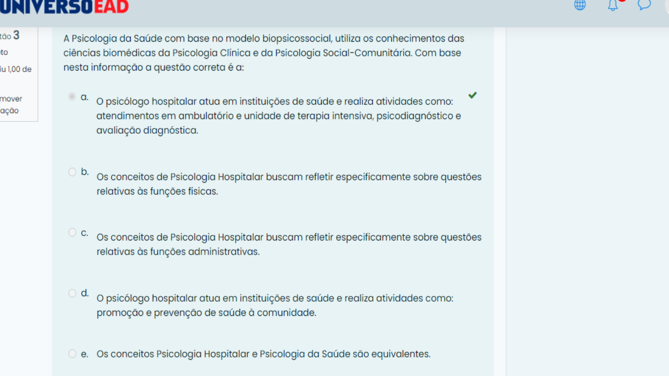 A Psicologia da Saúde com base no modelo biopsicossocial, utiliza os conhecimentos das ciências biomédicas da Psicologia Clínica e da Psicologia Social-Comunitária. Com base nesta informação a questão correta é a: a. psicólogo hospitalar atua em instituições de saúde e realiza atividades como: ação atendimentos em ambulatório e unidade de terapia intensiva, psicodiagnóstico e avaliação diagnóstica. b. Os conceitos de Psicologia Hospitalar buscam refletir especificamente sobre questões relativas às funções físicas. c. Os conceitos de Psicologia Hospitalar buscam refletir especificamente sobre questões relativas às funções administrativas. d. psicólogo hospitalar atua em instituições de saúde e realiza atividades como: promoção e prevenção de saúde à comunidade. e. Os conceitos Psicologia Hospitalar e Psicologia da Saúde são equivalentes.
