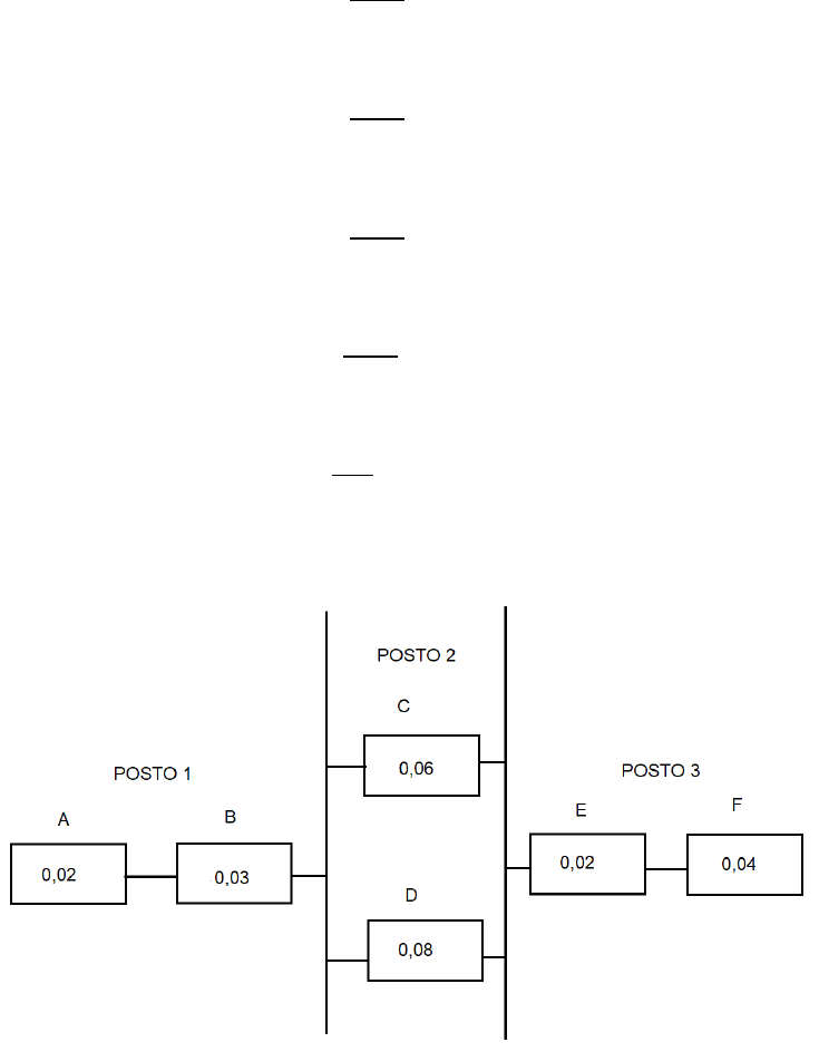 Professor Alexander Cascardo Carneiro UNIVERSIDADE SALGADO DE OLIVEIRA ENGENHARIA DE PRODUÇÃO CONFIABILIDADE INDUSTRIAL VT 2 – REVISÃO PARA V2 1) Um total de três lotes de um produto foram separados para inspeção. O lote 1 contém 600 peças, sendo 50 defeituosas; o lote 2 contém 1000 peças, sendo 150 defeituosas; e o lote 3 contém 400 peças, sendo 100 defeituosas. Nesse caso, ao selecionarmos uma peça ao acaso, determine a probabilidade de: a) a peça pertencer ao lote 1. 600 2000 = 0,3 b) a peça pertencer ao lote 2. 1000 2000 = 0,5 c) a peça pertencer ao lote 3. 400 2000 = 0,2 d) a peça estar defeituosa. 300 2000 = 0,15 e) a peça pertencer ao lote 3, dado que a peça é defeituosa. 100 300 = 0,333… 2) Um sistema produtivo é composto de 3 postos de trabalho contendo os recursos A, B, C, D, E e F, como mostrado na figura a seguir: Observe que a Figura especifica também as probabilidades de falha de cada recurso ao longo de um dia de operação. Nesse caso, determine: Professor Alexander Cascardo Carneiro a) a probabilidade de falha do posto 1. 𝐶 = 0,98 ∙ 0,97 = 0,9506 𝐹 = 1 − 𝐶 = 1 − 0,9506 = 0,0494 b) a probabilidade de falha do posto 2. 𝐹 = 0,06 ∙ 0,08 = 0,0048 c) a probabilidade de falha do posto 3. 𝐶 = 0,98 ∙ 0,96 = 0,9408 𝐹 = 1 − 𝐶 = 1 − 0,9408 = 0,0592 d) a probabilidade de falha do sistema. 𝐶 = (1 − 0,0494) ∙ (1 − 0,0048) ∙ (1 − 0,0592) = 0,9506 ∙ 0,9952 ∙ 0,9408 = 0,89 𝐹 = 1 − 𝐶 = 1 − 0,89 = 0,11 e) a confiabilidade do sistema. 𝐶 = 0,89 3) A árvore de falha a seguir especifica os eventos básicos e intermediários que resultam no evento topo “Falha no Sistema de Fornecimento de Água”: 0,0004 0,0009 0,0013 0,0213 0,001 Professor Alexander Cascardo Carneiro Observe que a Figura apresenta também as probabilidades de ocorrência de cada um desses eventos básicos (falhas básicas). Nesse caso, determine: a) a probabilidade de ocorrência do evento intermediário “Falha na Bomba”. 𝐹 = 0,02 ∙ 0,02 = 0,0004 b) a probabilidade de ocorrência do evento intermediário “Falha no Gerador”. 𝐹 = 0,03 ∙ 0,03 = 0,0009 c) a probabilidade de ocorrência do evento intermediário “Falha no Sistema Elétrico”. 𝐶 = 0,9996 ∙ 0,9991 = 0,9987 𝐹 = 1 − 𝐶 = 1 − 0,9987 = 0,0013 d) a probabilidade de ocorrência do evento intermediário “Falha no Bombeamento”. 𝐶 = 0,9987 ∙ 0,98 = 0,9787 𝐹 = 1 − 𝐶 = 1 − 0,9787 = 0,0213 e) a probabilidade de ocorrência do evento intermediário “Falha nos Tanques de Estocagem”. 𝐹 = 0,1 ∙ 0,1 ∙ 0,1 = 0,001 f) a probabilidade de ocorrência do evento topo “Falha no Sistema de Fornecimento de Água”. 𝐶 = 0,999 ∙ 0,9787 = 0,9777 𝐹 = 1 − 𝐶 = 1 − 0,9777 = 𝟎, 𝟎𝟐𝟐𝟑