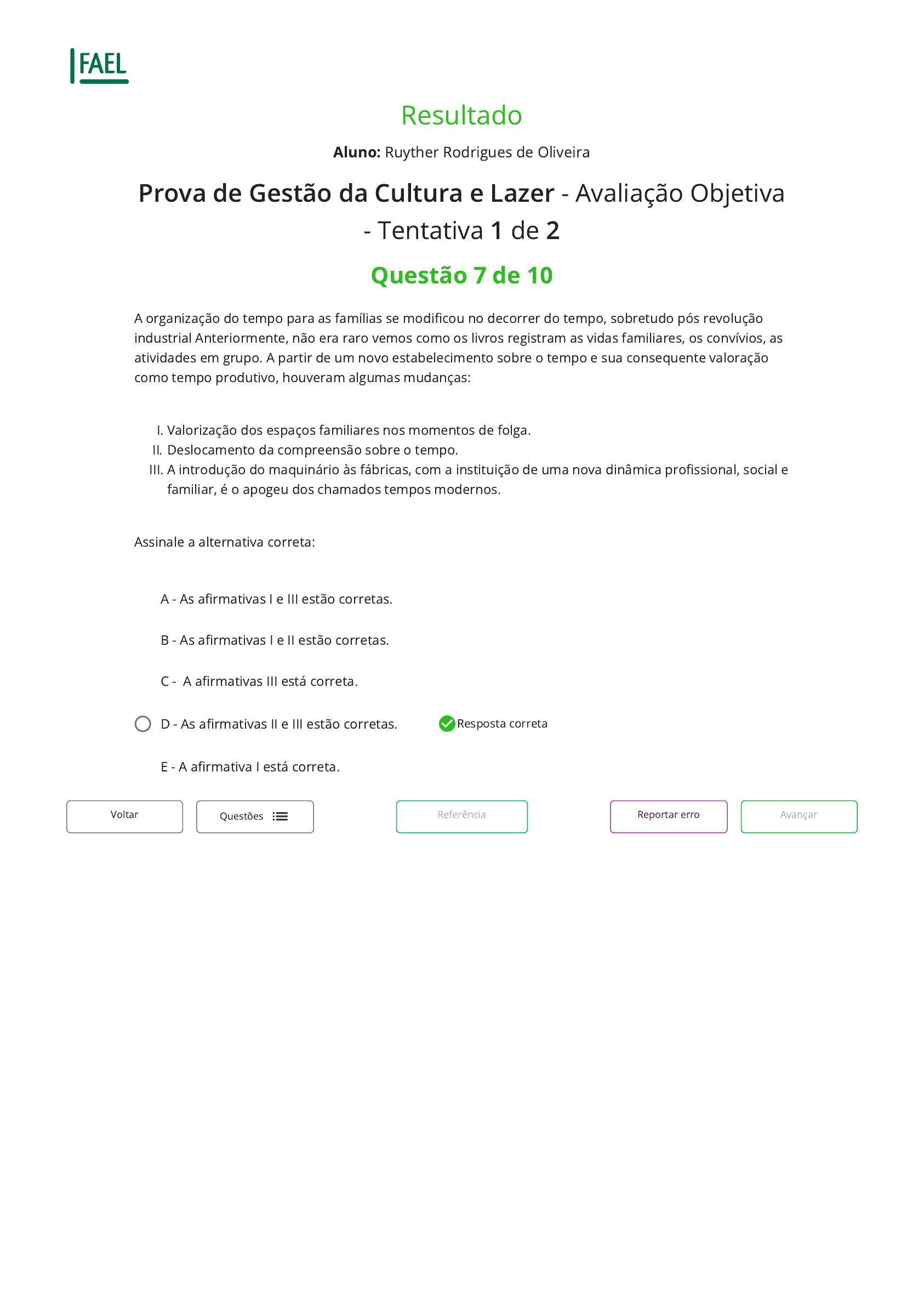30/09/2021 12:47 Firequiz https://firequiz.fael.edu.br/prova?question_number=7 1/2 Resultado Aluno: Ruyther Rodrigues de Oliveira Prova de Gestão da Cultura e Lazer - Avaliação Objetiva - Tentativa 1 de 2 Questão 7 de 10 A organização do tempo para as famílias se modi�cou no decorrer do tempo, sobretudo pós revolução industrial Anteriormente, não era raro vemos como os livros registram as vidas familiares, os convívios, as atividades em grupo. A partir de um novo estabelecimento sobre o tempo e sua consequente valoração como tempo produtivo, houveram algumas mudanças: I. Valorização dos espaços familiares nos momentos de folga. II. Deslocamento da compreensão sobre o tempo. III. A introdução do maquinário às fábricas, com a instituição de uma nova dinâmica pro�ssional, social e familiar, é o apogeu dos chamados tempos modernos. Assinale a alternativa correta: A - As a�rmativas I e III estão corretas. B - As a�rmativas I e II estão corretas. C - A a�rmativas III está correta. D - As a�rmativas II e III estão corretas. Resposta correta E - A a�rmativa I está correta. Voltar Questões Referência Reportar erro Avançar https://firequiz.fael.edu.br/prova?question_number=6 https://firequiz.fael.edu.br/prova/questoes 30/09/2021 12:47 Firequiz https://firequiz.fael.edu.br/prova?question_number=7 2/2