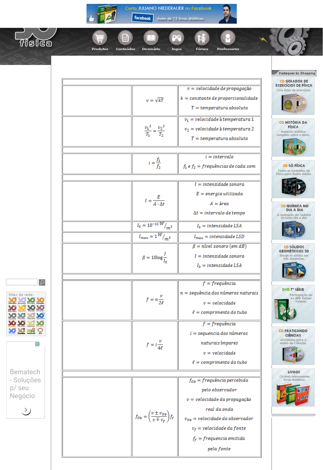 Material de Apoio Mecânica Cinemática Dinâmica Mais [+] Termologia Termometria Calorimetria Mais [+] Óptica Fundamentos Reflexão da luz Mais [+] Ondulatória MHS Ondas Mais [+] Eletromagnetismo Eletrostática Eletrodinâmica Mais [+] História da Física Biografias de Físicos Pratique Jogos Online Exercícios Resolvidos Provas de Vestibular Simulados Online Ajuda Laifis de Física Área dos Professores Fórum de Discussão Fórmulas e Dicas Softwares de Física Dicionário de Física Vídeos Simulações Diversos Física no Cotidiano Curiosidades O Que o Físico Faz? Indicação de Livros Fale Conosco Busca Geral Acústica Velocidade de propagação do som em meios gasosos Velocidade de propagação Velocidade de propagação em um mesmo gás com diferentes temperaturas Intervalo acústico Intervalo entre dois sons Intensidade sonora Intensidade sonora Limiar da sensação audível (LSA) Limiar da sensação dolorosa (LSD) Nível Sonoro Tubos sonoros Tubos abertos Tubos fechados Efeito Doppler Frequência sob efeito Doppler Mais produtos Bematech - Soluções p/ seu Negócio http://www.facebook.com/JulianoNiederauer http://www.sofisica.com.br/conteudos/indice.php http://www.sofisica.com.br/conteudos/Mecanica/Cinematica/velocidade.php http://www.sofisica.com.br/conteudos/Mecanica/Dinamica/leisdenewton.php http://www.sofisica.com.br/conteudos/indice.php http://www.sofisica.com.br/conteudos/indice.php http://www.sofisica.com.br/conteudos/Termologia/Termometria/temperatura.php http://www.sofisica.com.br/conteudos/Termologia/Calorimetria/calor.php http://www.sofisica.com.br/conteudos/indice.php http://www.sofisica.com.br/conteudos/indice2.php http://www.sofisica.com.br/conteudos/Otica/Fundamentos/luz.php http://www.sofisica.com.br/conteudos/Otica/Reflexaodaluz/reflexao.php http://www.sofisica.com.br/conteudos/indice2.php http://www.sofisica.com.br/conteudos/indice2.php http://www.sofisica.com.br/conteudos/Ondulatoria/MHS/movpereosc.php http://www.sofisica.com.br/conteudos/Ondulatoria/Ondas/classificacao.php http://www.sofisica.com.br/conteudos/indice2.php http://www.sofisica.com.br/conteudos/indice2.php http://www.sofisica.com.br/conteudos/Eletromagnetismo/Eletrostatica/cargas.php http://www.sofisica.com.br/conteudos/Eletromagnetismo/Eletrodinamica/corrente.php http://www.sofisica.com.br/conteudos/indice2.php http://www.sofisica.com.br/conteudos/HistoriaDaFisica/indice.php http://www.sofisica.com.br/conteudos/Biografias/indice.php http://www.sofisica.com.br/jogos.php http://www.sofisica.com.br/exercicios.php http://www.sofisica.com.br/provas.php http://www.sofisica.com.br/simulados.php http://www.sofisica.com.br/laifiFisica.php http://www.sofisica.com.br/professores.php http://www.soensino.com.br/foruns/viewforum.php?f=12 http://www.sofisica.com.br/conteudos/FormulasEDicas/indice_formulas.php http://www.sofisica.com.br/softwares.php http://www.sofisica.com.br/conteudos/dicionario/ http://www.sofisica.com.br/videos.php http://www.sofisica.com.br/simulacoes.php http://www.sofisica.com.br/cotidiano.php http://www.sofisica.com.br/curiosidades.php http://www.sofisica.com.br/profissao.php http://www.sofisica.com.br/livros.php http://www.sofisica.com.br/contato.php http://www.virtuous.com.br/produto.php?id=224 http://www.virtuous.com.br/produto.php?id=211 http://www.virtuous.com.br/produto.php?id=189 http://www.virtuous.com.br/produto.php?id=182 http://www.virtuous.com.br/produto.php?id=220 http://www.virtuous.com.br/produto.php?id=80 http://www.virtuous.com.br/produto.php?id=92 http://www.virtuous.com.br/busca.php?busca=livros http://www.virtuous.com.br/ https://www.googleadservices.com/pagead/aclk?sa=L&ai=CCJIdEJDeV6alNsuOxgSg14HoDbjst8lGtp7KxL0DwI23ARABIMOX7gZgzbDggOwCoAHb15XjA8gBCakCsYwOehGHlD6oAwHIAwqqBKkBT9AZVkNf_DjHo6I3i-JD_aFvR4MxmxvrFA6msrDbkDEZkFG7sv--_RZWfpSDkRmmh0RFNyw-NnZwnI8qyAGM6VCPuH4cuQb78Ystj9vQ0l4fVdpm82PoVyJaRCaqAklyBOAmslK9Zfr3GXrkx6nmXO6ZWA5kkjzfzqz3r-twbA0zqpRc1xnGzlIxgEsRjZxlDJfLNQxhLnCJ9iDK_dwC6rnIngL9qShTNYgGAaAGLoAHjajqHKgHgcYbqAemvhvYBwA&num=1&cid=CAASEuRojsq_MFVCRO_SJ-yKoyg_7w&sig=AOD64_386furd9gIaJHr8k9oyHPd3qYMZw&client=ca-pub-8501993473232048&adurl=http://www.bematech.com.br/ Curta nossa página nas redes sociais! Sobre nós | Política de privacidade | Contrato do Usuário | Anuncie | Fale conosco Copyright © 20082016 Só Física. Todos os direitos reservados. Desenvolvido por Grupo Virtuous. http://www.sofisica.com.br/conteudos/FormulasEDicas/formulas13.php http://www.sofisica.com.br/conteudos/FormulasEDicas/formulas15.php https://www.facebook.com/GrupoVirtuous https://twitter.com/GrupoVirtuous http://www.sofisica.com.br/sobrenos.php http://www.sofisica.com.br/privacidade.php http://www.sofisica.com.br/contrato.php http://www.sofisica.com.br/anuncie.php http://www.sofisica.com.br/contato.php http://www.sofisica.com.br/ http://www.grupovirtuous.com.br/