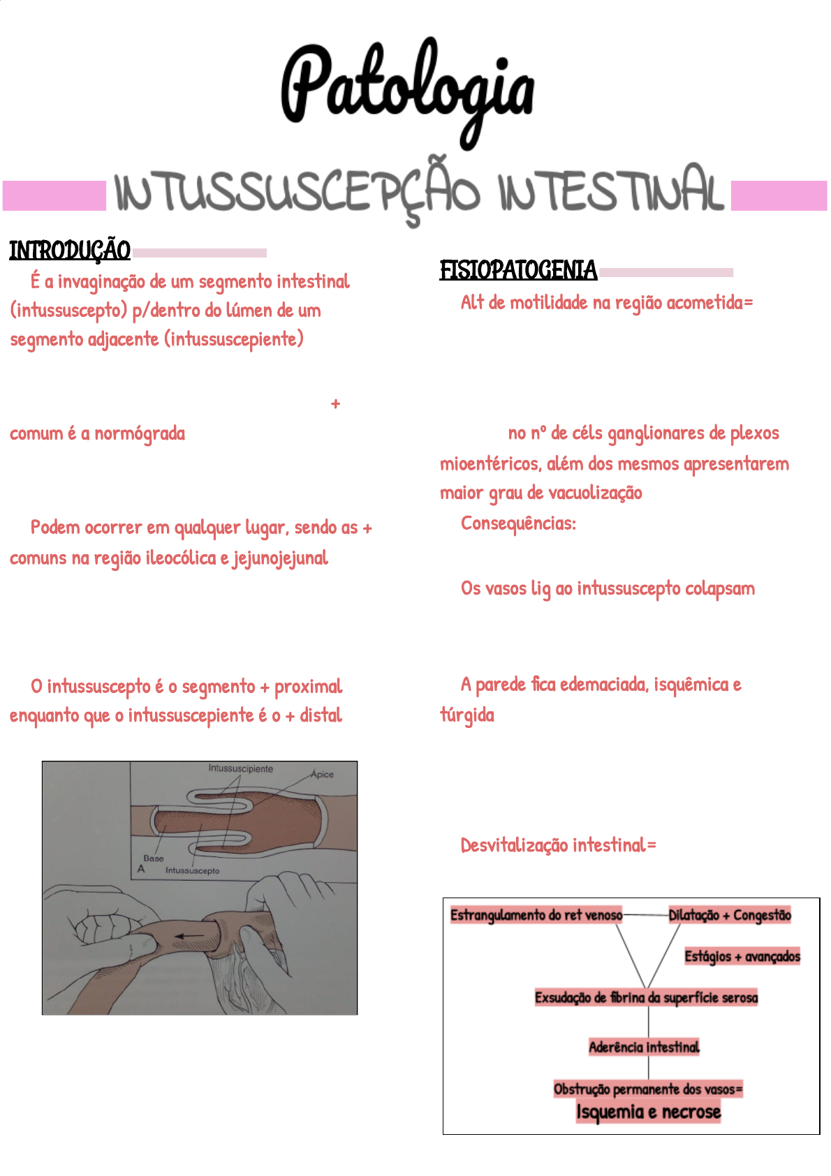 INTRODUÇÃO → É a invaginação de um segmento intestinal (intussuscepto) p/dentro do lúmen de um segmento adjacente (intussuscepiente) → Pode ocorrer de forma normógrada (no sentido peristáltico) ou na direção retrógrada → A + comum é a normógrada → Pode ser classi�cada quanto ao nº de intussuscepções → Únicas, múltiplas ou compostas → Podem ocorrer em qualquer lugar, sendo as + comuns na região ileocólica e jejunojejunal → Geralm causadas por enterites (parasitismo, infec bac/viral, alt da dieta, corpo estranho, massas) → ↑peristaltismo → O intussuscepto é o segmento + proximal enquanto que o intussuscepiente é o + distal FISIOPATOGENIA → Alt de motilidade na região acometida= Porções c/maior rigidez/�acidez em comparação c/as outras → Já foi relatado que nos segmentos acometidos há uma ↓no nº de céls ganglionares de plexos mioentéricos, além dos mesmos apresentarem maior grau de vacuolização → Consequências: Obstrução parcial/total, isquemia, necrose e ruptura intestinal → Os vasos lig ao intussuscepto colapsam (por causa do ↑pressão intraluminal) → Podem sofrer avulsão → A parede �ca edemaciada, isquêmica e túrgida → Sangue extravasa p/o lúmen e há �ssuras na serosa → A �brina faz com que as camadas do intestino permaneçam juntas → Desvitalização intestinal= Contaminação da cavidade abdominal SINAIS CLÍNICOS → Anorexia, disorexia, depressão, letargia, perda de peso, êmese, diarreia (pode ser hematoquezia), sensibilidade/distensão abdominal, isquemia, peritonite focal/difusa, etc DIAGNÓSTICO → Anamnese + Histórico + Ex físico + Ex complementares ➪ EX. FÍSICO → Palpação de uma alça intestinal alongada e engrossada (massa em forma de salsicha) → A intussuscepção jejunojejunal é + fácil de palpar se comparada c/a ileocólica → Algumas podem protruir do reto → Cuidado p/não confundir c/prolapso retal ➪ RX → Geralmente mostra obstrução → A do tipo jejunojejunal resulta em um padrão + obstrutivo → A realização de um RX contrastado (bário) do TGI superior ajuda a localizar a obstrução ➪ US → Exame de escolha → Plano transversal: Hiperecóica concêntrica, anéis hipoecóicos, acúmulo de líq proximal associado e ↓motilidade → Plano longitudinal: Aparência em camadas c/linha hiperecóicas e hipoecóicas alternantes → Identi�cação de camadas distintas é indicativo que a intussuscepção pode ser redutível ➪ EX. LABORATORIAIS → Leucograma de estresse, anemia e eletrólitos, anormalidades ácido-base → Se for crônica, há hipoalbuminemia TRATAMENTO ➪ CLÍNICO → Tentar reduzir manualmente (percutânea) → Maioria dos casos são cirúrgicos → Corrigir desequilíbrio de �uidos e eletrólitos → Diagnosticar e corrigir a causa base da intussuscepção ➪ CIRÚRGICO → Fazer ATB pro�lática → Cirurgia → Decúbito dorsal para uma celiotomia na linha média ventral, explorar abdome, reduzir intussuscepção manualmente (só é bem sucedido se a �brina não formou aderência na serosa), avaliar intestino (viabilidade/perfuração), ra�a → Considerar fazer uma enteroenteropexia para prevenção de recidivas