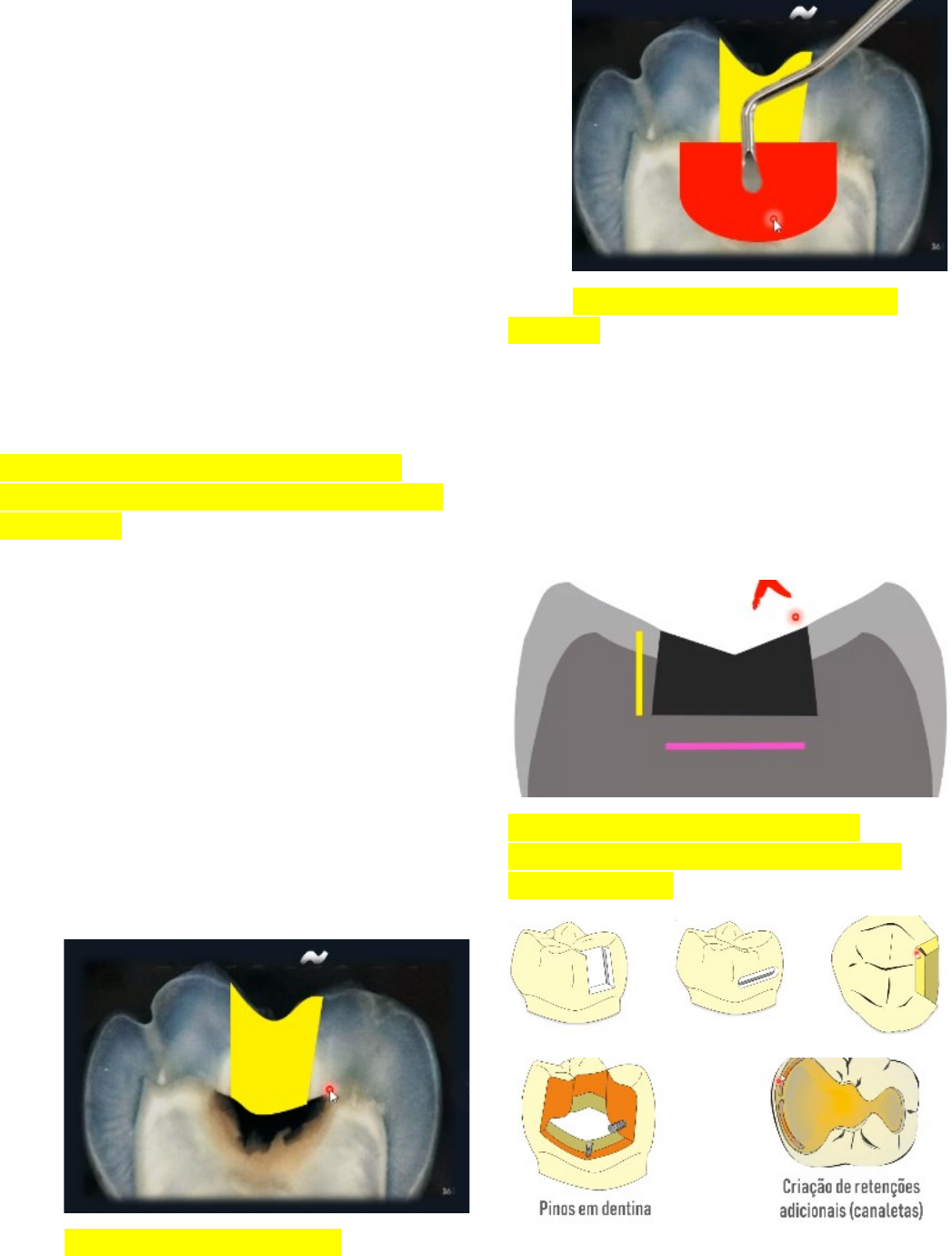 Princípios gerais do preparo cavitário Odontologia minimamente invasiva Black: extensão para prevenção – preparos desnecessariamente grandes para “prevenir” uma futura cárie Amálgama dental - liga metálica ( mercúrios, estanho, cobre) - não adere ao dente - Pode provocar fraturas marginais - Não fortalece as estruturas dentarias *importância do aconselhamento do bem-estar aos pacientes- higienização, ingestão de açúcar, etc* CONSERVAÇÃO + BOM SENSO - adaptadas a cada paciente - proporcionar o melhor tratamento possível de acordo com as particularidades do paciente Princípios clássicos de Black 1. Acesso à lesão Remoção do esmalte para acessar à lesão ->Remoção da parte amarela ->Remove o tecido cariado (parte vermelha) 2. Forma de retenção Formato da cavidade para que possa reter o amalgama (haja vista que não se adere ao dente) Profundidade maior que largura ou paredes convergentes para a oclusal ->Não precisa escavar o dente nesse formato, pois a própria broca já possui a forma necessária ->Métodos de retenção do amalgama ao dente Parede mesial e distal podem ser retas ou levemente divergentes para a oclusal 3. Forma de resistência Estratégia de resistência às forças mastigatórias - mínimo de 1,5mm de profundidade A parede pulpar deve ser reta – caso contrário, o paciente pode sentir sensibilidade pós operatória ->Parede pulpar irregular, formando “lanças” de metal para a polpa ->Ângulo cavo superficial deve estar entre 90 e 70 ° para evitar desgaste desnecessário ao dente, fratura das cúspides, e esmalte sem suporte dentinário Os ângulos internos da cavidade devem ser arredondados para auxiliar na dissipação das forças mastigatórias ->as brocas já arredondam a cavidade Curva reversa de hollenback ->Transformação do ângulo agudo (<1,5mm) das restaurações de faces proximais em ângulo reto (>1,,5mm) para facilitar a restauração e evitar fraturas) Forma de contorno Caixa proximal: parede vestibular e lingual convergindo para a oclusal -geralmente esse contorno é dado pela própria carie Forma de conveniência Ajustes antes do preparo para facilitar os procedimentos Ex: isolamento absoluto, fio afastador gengival, afastamento interdental Acabamento das paredes de esmalte - remoção de irregularidades dos prismas do esmalte - proporcionar melhor vedamento marginal - permite uma adaptação perfeita Remoção da dentina cariada remanescente Limpeza da cavidade - produtos desmineralizantes ( ácido fosfórico, EDTA e poliacrílico) e não desmineralizantes ( clorexidina, detergente, alcalinizantes) RESINA COMPOSTA - possui adesão - melhor dissipação de forças que o amalgama - quem dita o preparo é a lesão ->remoção do esmalte para acesso à lesão ->remoção da lesão com carbide em baixa rotação ou colher de dentina Remoção seletiva do tecido cariado ->remover dentina infectada e deixar dentina afetada para ela se revitalizar (em caso de lesões muito profundas) O ideal é que a restauração se insira ate 0,5mm no sulco gengival