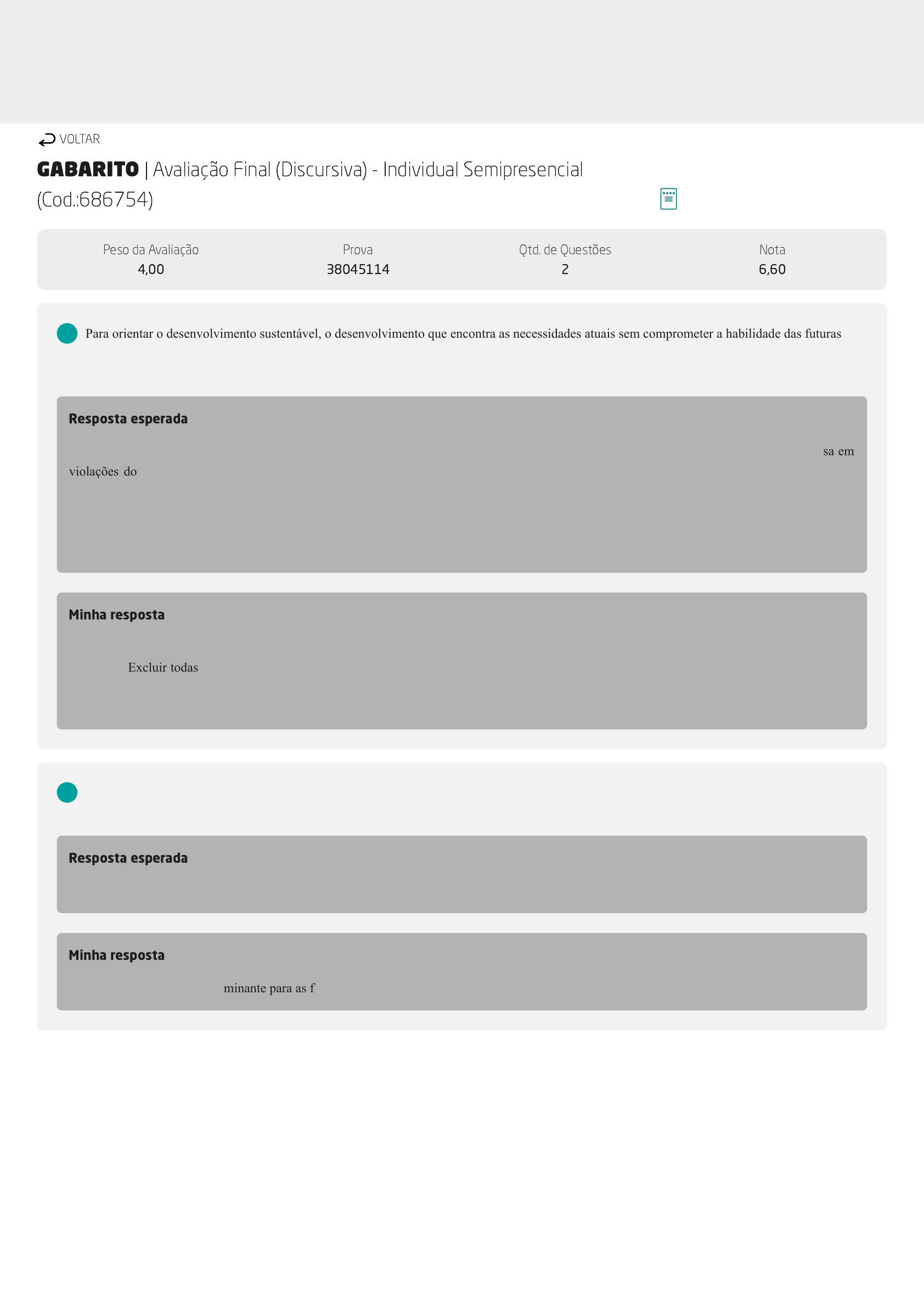 GABARITO | Avaliação Final (Discursiva) - Individual Semipresencial (Cod.:686754) Peso da Avaliação 4,00 Prova 38045114 Qtd. de Questões 2 Nota 6,60 Para orientar o desenvolvimento sustentável, o desenvolvimento que encontra as necessidades atuais sem comprometer a habilidade das futuras gerações de atender a suas próprias necessidades, algumas ferramentas e organismos foram criados, dentre estes organismos nós temos o Pacto Global. Partindo deste pressuposto, descreva cinco princípios do Pacto Global. Resposta esperada - Respeitar e apoiar os direitos humanos reconhecidos internacionalmente na sua área de influência. - Assegurar a não participação da empresa em violações dos direitos humanos. - Apoiar a liberdade de associação e reconhecer o direito à negociação coletiva. - Eliminar todas as formas de trabalho forçado ou compulsório. - Erradicar efetivamente todas as formas de trabalho infantil na sua cadeia produtiva. - Estimular práticas que eliminem qualquer tipo de discriminação no emprego. - Assumir uma abordagem preventiva, responsável e proativa para os desafios ambientais. - Desenvolver iniciativas e práticas para promover e disseminar a responsabilidade socioambiental. - Incentivar o desenvolvimento e a difusão de tecnologias ambientalmente responsáveis. - Combater a corrupção em todas as formas, incluindo extorsão e suborno. Minha resposta -Combater de todas as formas a corrupção incluindo atitudes de suborno e extorsão. -Garantir que a empresa não participe com violação dos direitos humanos. -Excluir todas as formas de trabalho forçado ou compulsório. -Despertar o ânimo ou interesse em práticas que eliminem qualquer tipo de discriminação no trabalho. -Arrancar pela raiz de forma efetiva todas as formas de trabalho infantil em todas as suas etapas de produção. -Dar apoio a liberdade de associação e reconhecer o direito a negociação coletiva. A sociedade de classes e as desigualdades são fenômenos que acompanham a humanidade desde longa data. Como se origina a classificação dos cidadãos? Resposta esperada *Com a posse, *que é um fator determinante para as funções sociais dignas de maior status, *como sacerdotes, chefes-guerreiros e mercadores. Minha resposta A posse, que é um fator determinante para as funções sociais dignas de maior status, como sacerdotes, chefes-guerreiros, mercadores. VOLTAR A+ Alterar modo de visualização 1 2