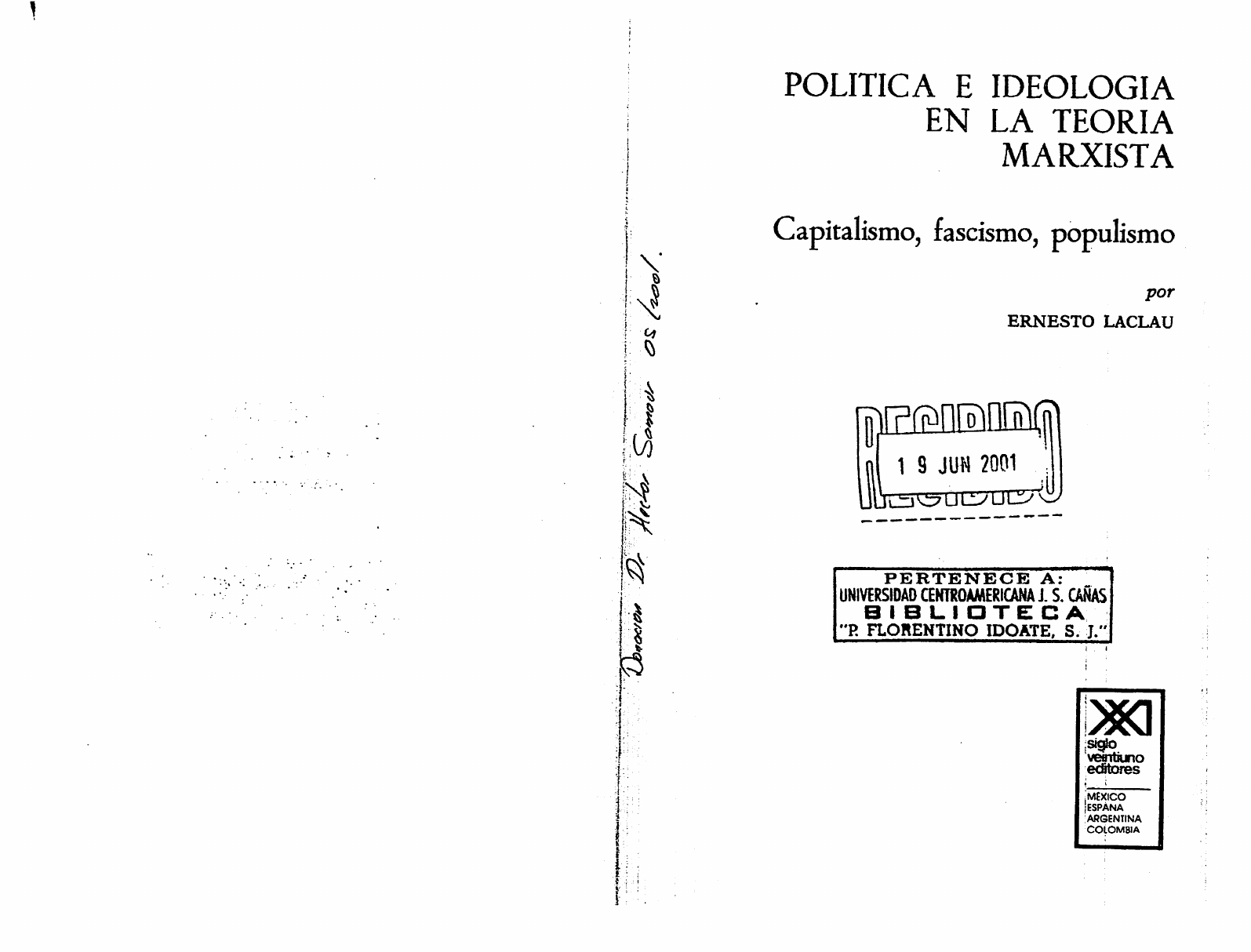 política e ideología en la teoría marxista Capitalismo, fascismo, populismo por ERNESTO LACLAU PERTENECE A: UNIVERSIDAD CENTROAMERICANA! S. CAÑAS BIBLIOTECA "P. FLORENTINO IDOATE, S. J." siglo veintiuno editores, sa CERRO OEL AGUA. 248. 04310 MEXtCO, D.F. siglo veintiuno de españa editores, sa rv Pt A7A c oanA1* UAnotn ccdama -PLAZA. 5. 28043 MADRID. ESPAÑA siglo Veintiuno argentina editores, sa siglo veintiuno de Colombia, Itda AV. 3a. 17-73.jPRtMER PISO. BOGOTÁ. D.£ COLOMBIA A Chantal Primera edición en castellano, mayo de 1978 Segunda edición en castellano, marzo de 1980 (México) Tercera edición en castellano, junio de 1986 © SIGLO XXI DE ESPAÑA EDITORES, S. A. Calle Plaza, 5. 28043 Madrid Primera edición en inglés, 1977 © New'Left Books Ltd., Londres © Ernesto Laclau Titulo de la edición inglesa: Politics and ideoiogy in Marxist theory. Capitalism-Fascism-Populism DERECHOS RESERVADOS CONFORME A LA LEY Impreso y hecho en España Printed and made in Spain ISBN: 84-323-0315-1 Depósito legal: M. 20.148-1986 Impreso en Closas-Orcoyen, S. L. Polígono Igarsa Paracuellos de Jarama (Madrid) r ÍNDICE INTRODUCCIÓN l FEUDALISMO Y CAPITALISMO EN AMÉRICA LATINA 10 El esquema teórico de Frank, 11.—La crítica de las concepciones dualistas, 15.—Los errores teóricos de la concepción de Frank, 18.—Modos de producción y sistemas económicos, 33.—Las etapas de la dependencia, 35.—Postscriptum, 42. LA ESPECIFICIDAD DE LO POLÍTICO 53 Cuestiones metodológicas y epistemológicas, 64.—El método de Poulantzas 67.—¿Superdeterminismo estructural?, 69.—Los apa ratos ideológicos del Estado, 72.—¿Abstraccionismo estructuraUs- ta?f 75.—El concepto de modo de producción, 78. FASCISMO E IDEOLOGÍA 89 La interpretación del fascismo en Poulantzas, 98.—Los «elemen tos» ideológicos y su pertenencia de clase, 103.—Interpelaciones de clase e interpelaciones popular-democráticas, 112.—La natura leza de clase de la pequeña burguesía, 126.—El surgimiento del fascismo: la crisis del bloque de poder, 130.—El surgimiento del fascismo: la crisis de la clase obrera, 142.—Las lecciones políticas del fascismo, 154. HACIA UNA TEORÍA DEL POPULISMO 165