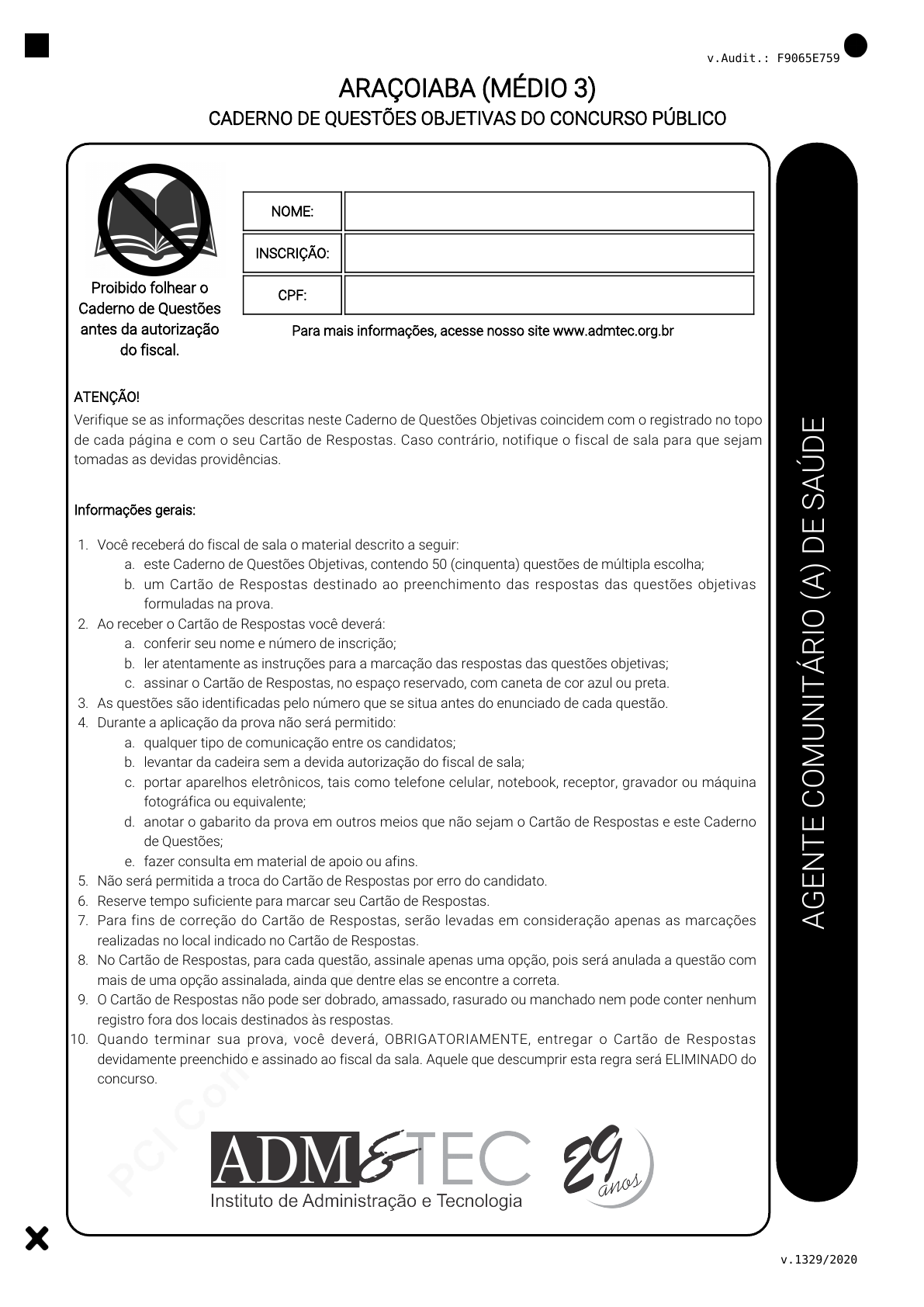 pcimarkpci MDAwMDowMDAwOjAwMDA6MDAwMDowMDAwOmZmZmY6OGFmZjo5ZTc4:TW9uLCAxMSBPY3QgMjAyMSAwOTozOTowMyAtMDMwMA== v.Audit.: F9065E759 v.1329/2020 ARAÇOIABA (MÉDIO 3) CADERNO DE QUESTÕES OBJETIVAS DO CONCURSO PÚBLICO AG EN TE C O M UN IT ÁR IO (A ) D E SA ÚD E NOME: INSCRIÇÃO: CPF: Para mais informações, acesse nosso site www.admtec.org.br Proibido folhear o Caderno de Questões antes da autorização do fiscal. ATENÇÃO! Verifique se as informações descritas neste Caderno de Questões Objetivas coincidem com o registrado no topo de cada página e com o seu Cartão de Respostas. Caso contrário, notifique o fiscal de sala para que sejam tomadas as devidas providências. Informações gerais: Você receberá do fiscal de sala o material descrito a seguir:1. este Caderno de Questões Objetivas, contendo 50 (cinquenta) questões de múltipla escolha;a. um Cartão de Respostas destinado ao preenchimento das respostas das questões objetivasb. formuladas na prova. Ao receber o Cartão de Respostas você deverá:2. conferir seu nome e número de inscrição;a. ler atentamente as instruções para a marcação das respostas das questões objetivas;b. assinar o Cartão de Respostas, no espaço reservado, com caneta de cor azul ou preta.c. As questões são identificadas pelo número que se situa antes do enunciado de cada questão.3. Durante a aplicação da prova não será permitido:4. qualquer tipo de comunicação entre os candidatos;a. levantar da cadeira sem a devida autorização do fiscal de sala;b. portar aparelhos eletrônicos, tais como telefone celular, notebook, receptor, gravador ou máquinac. fotográfica ou equivalente; anotar o gabarito da prova em outros meios que não sejam o Cartão de Respostas e este Cadernod. de Questões; fazer consulta em material de apoio ou afins.e. Não será permitida a troca do Cartão de Respostas por erro do candidato.5. Reserve tempo suficiente para marcar seu Cartão de Respostas.6. Para fins de correção do Cartão de Respostas, serão levadas em consideração apenas as marcações7. realizadas no local indicado no Cartão de Respostas. No Cartão de Respostas, para cada questão, assinale apenas uma opção, pois será anulada a questão com8. mais de uma opção assinalada, ainda que dentre elas se encontre a correta. O Cartão de Respostas não pode ser dobrado, amassado, rasurado ou manchado nem pode conter nenhum9. registro fora dos locais destinados às respostas. Quando terminar sua prova, você deverá, OBRIGATORIAMENTE, entregar o Cartão de Respostas10. devidamente preenchido e assinado ao fiscal da sala. Aquele que descumprir esta regra será ELIMINADO do concurso. pcimarkpci MDAwMDowMDAwOjAwMDA6MDAwMDowMDAwOmZmZmY6OGFmZjo5ZTc4:TW9uLCAxMSBPY3QgMjAyMSAwOTozOTowMyAtMDMwMA== INSTITUTO ADM&TEC | ARAÇOIABA (MÉDIO 3) v.Audit.: F9065E759 AGENTE COMUNITÁRIO (A) DE SAÚDE - Página 2 de 14 v.1329/2020 CONHECIMENTOS ESPECÍFICOS Questões de 1 a 30 1 Analise as afirmativas a seguir: I. O consumo elevado de gorduras saturadas e colesterol dietético reduz o risco de doença coronariana, isquemia e outras doenças cardiovasculares. II. Acolher os usuários dos serviços e humanizar a atenção é uma atribuição restrita ao Agente Comunitário de Saúde enquanto membro da equipe NASF. Marque a alternativa CORRETA: a) As duas afirmativas são verdadeiras. b) A afirmativa I é verdadeira, e a II é falsa. c) A afirmativa II é verdadeira, e a I é falsa. d) As duas afirmativas são falsas. 2 Analise as afirmativas a seguir: I. Os cuidados com as pessoas idosas podem contribuir ou agravar condições de saúde pré-existentes. Por exemplo, o abandono e os maus tratos são situações que reduzem o risco de desenvolvimento do quadro depressivo nesses indivíduos e, ao mesmo tempo, permitem a manutenção da integridade da estrutura óssea e muscular em pessoas com mais de 65 anos. II. É direito da pessoa, na rede de serviços de saúde, ser identificada pelo seu nome e sobrenome civil, devendo existir em todo documento do usuário e usuária um campo específico para se registrar o nome social, independente do registro civil , sendo assegurado o uso do nome de preferência, não podendo ser identificado por número, nome ou código da doença ou outras formas desrespeitosas ou preconceituosas. Marque a alternativa CORRETA: a) As duas afirmativas são verdadeiras. b) A afirmativa I é verdadeira, e a II é falsa. c) A afirmativa II é verdadeira, e a I é falsa. d) As duas afirmativas são falsas. 3 Analise as afirmativas a seguir: I. O Agente Comunitário de Saúde é um profissional dedicado exclusivamente ao levantamento de dados sobre as endemias de uma comunidade e, por isso, ele não deve realizar a identificação de situações de risco com famílias de sua área de atuação, nem mesmo encaminhar cidadãos com sintomas de enfermidades graves para os serviços municipais de saúde. II. Pelo princípio da equidade, o Sistema Único de Saúde deve disponibilizar serviços que promovam a justiça social, que canalizem maior atenção aos que mais necessitam, diferenciando as necessidades de cada um. A equidade traduz-se no tratamento desigual aos desiguais, devendo o sistema investir mais onde e para quem as necessidades forem maiores. Marque a alternativa CORRETA: a) As duas afirmativas são verdadeiras. b) A afirmativa I é verdadeira, e a II é falsa. c) A afirmativa II é verdadeira, e a I é falsa. d) As duas afirmativas são falsas. 4 Analise as afirmativas a seguir: I. O vírus da imunodeficiência humana (HIV) ataca as células nervosas com o objetivo de tornar pouco funcional o sistema imunológico humano. Em seguida, o HIV utiliza as células pituitárias para dividir-se e propagar-se pelo organismo, causando reações sintomáticas na epiderme, no sistema digestivo e nos rins. II. Todo serviço de saúde deve garantir à pessoa assistida por ele o consentimento livre, voluntário e esclarecido a quaisquer procedimentos d
