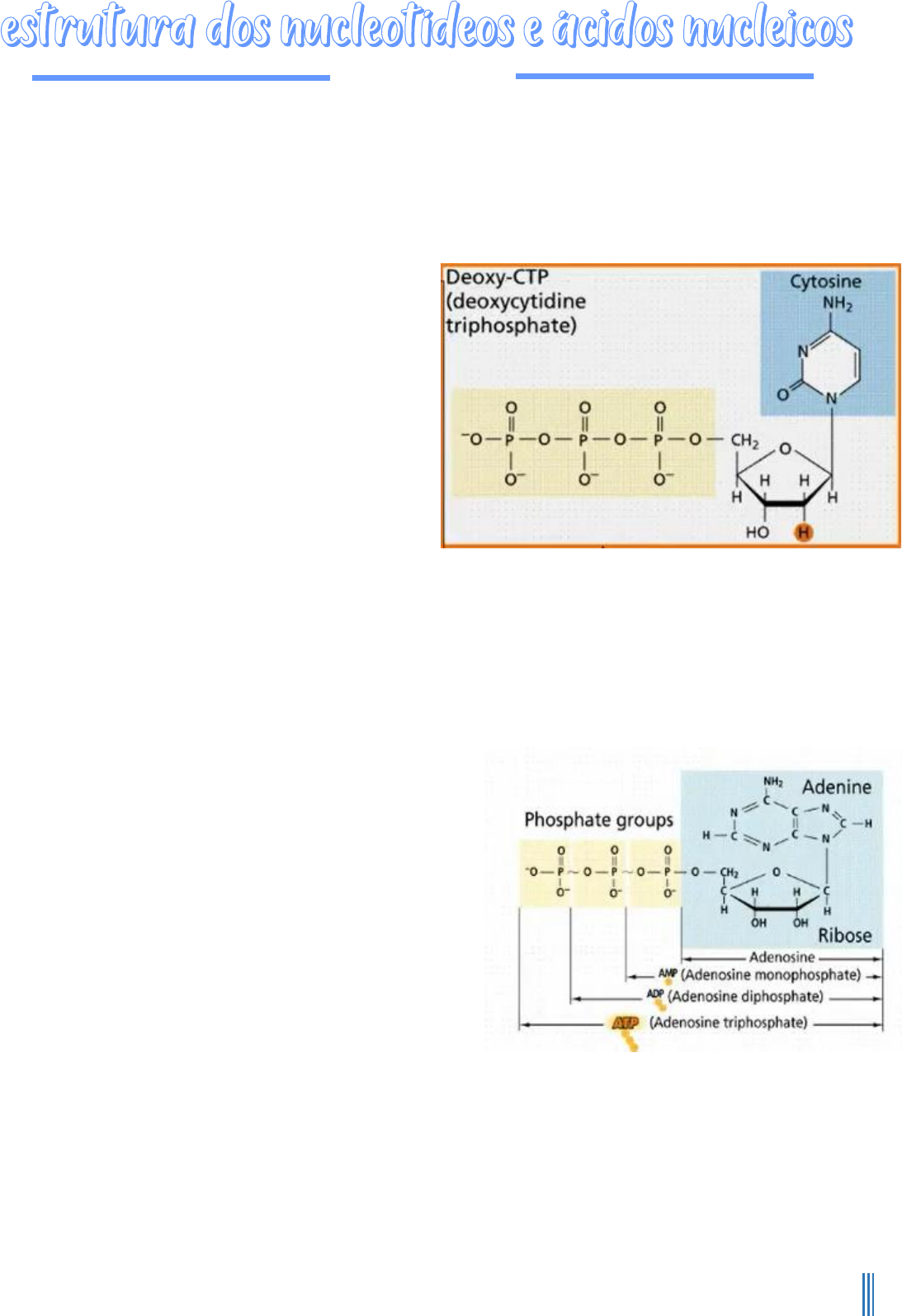 MARIA LAURA FARIA DE ANDRADE – BIOMEDICINA XLII BIOMED MARIA LAURA – TROLE BIOMEDICINA XLII UFTM • Os nucleotídeos são estruturas responsáveis por formar as moléculas de DNA e RNA FUNÇÃO DO DNA: armazenamento da informação genética. FUNÇÃO DO RNA: rRNA(ribossômico), mRNA(mensageiro), tRNA(transportador) e outros RNA de funções especiais (ribozimas - atividade catalítica-, estruturais e regulatórios) ESTRUTURA DO NUCLEOTÍDEO - açúcar de 5 carbonos (pentose) - grupo fosfato - base nitrogenada No exemplo é possível ver a estrutura básica de um DESOXIRIBONUCLEOTÍDEO, isto porque é possível observar que no segundo carbono está ligado uma molécula de hidrogênio. Ao que difere disto, se na segunda posição se encontrasse uma hidroxila (OH) o açúcar seria uma ribose. A base nitrogenada sempre se encontra ligada ao primeiro carbono da pentose, ao passo que o grupo fosfato está ligado ao 5º carbono deste grupo, podendo também ser encontrado fazendo ligação com o oxigênio do 3º átomo de carbono da pentose. Nucleotídeo na imagem é denominado Desoxi-CTP ou Desoxicitidinatrifosfato, porque: - pentose: desoxirribose - base nitrogenada: citosina - nº de fosfatos: três (trifosfato) Nesse segundo exemplo têm-se uma RIBOSE, ou seja um ribonucleotídeo que pode compor o RNA. Os grupos deste nucleotídeo em questão são: - pentose: ribose - base nitrogenada: adenina - nº de fosfatos: três (trifosfato) Ainda neste exemplo a porção destacada em azul (base nitrogenada e pentose) é um NUCLEOSÍDEO: - molécula formada pela ligação entre uma pentose e uma base nitrogenada. - nesse exemplo denomina-se ADENOSINA (adenina+ribose) NUCLEOTÍDEO - 1 a 3 grupos fosfatos ligados à um nucleosídeo - adenilato Para diferenciar os átomos da base nitrogenada dos átomos da pentose faz-se uma numeração T01 -aula 01 MARIA LAURA FARIA DE ANDRADE – BIOMEDICINA XLII BIOMED - base nitrogenada: 1 a 6 (para citosina) e 1 a 9 (para adenina) - pentose: 1’ a 5’ CONFORMAÇÕES DA RIBOSE Há duas formas para se encontra a ribose: - aldeídica - cetônica (mais estável) Quando se identifica-se a forma ALDEÍDICA está posto que o primeiro carbono possui como grupo funcional um Aldeído, sendo que os seguintes são álcoois. A forma cetônica se forma quando o Oxigênio ligado ao C4’ da forma aldeídica promove um ataque de nucleofílico ao C1’ do aldeído. Neste momento a ligação entre C1’ e O pré-existente é desfeita e forma-se um ciclo, a forma CETÔNICA, com um álccol na posição 1’. BASES NITROGENADAS Há sempre uma purina e uma pirimidina ligada ao C1’. - purina: adenina (DNA e RNA) e guanina (DNA e RNA) • 9 átomos de carbono - pirimidina: citosina (DNA e RNA), timina (DNA) e uracila (RNA) • 6 átomos de carbono DNA MARIA LAURA FARIA DE ANDRADE – BIOMEDICINA XLII BIOMED A ligação entre as bases nitrogenadas e as pentoses é denominada LIGAÇÃO N-GLICOSÍDICA, porque sempre haverá uma ligação entre um átomo de Nitrogênio e o Carbono 1’ da pentose. - Pirimidina: N 1 ligado ao C1’ - Purinas: N 9 ligado ao C1’ O C5’ e C3’ se destacam pois são à esses átomos de carbono que serão realizadas LIGAÇÕES FOSFODIÉSTER. - une dois nucleotídeos - liga um fósforo a um oxigênio, e este ao carbono da base e assim por diante. - o trio Fósforo, oxigênio e carbono denomina-se FOSFOÉSTER RELAÇÃO DE CHARGAFF Para todo DNA testado nota-se - mesma quantidade de Adenina e Timina ( A = T ) - mesma quantidade de Guanina e Citosina ( C ≡ G ) - Cada uma dessas bases poderia ser encontrada aos pares!!!! Chargaff notou que para cada espécie estudada havia uma composição de bases nitrogenadas diferentes. TIMINA ≠ URACILA - presença de um grupo metil presente na dupla ligação do anel da TIMINA MARIA LAURA FARIA DE ANDRADE – BIOMEDICINA XLII BIOMED MODELO DE WATSON & CRICK TÉCNINA DE ROSALIND FRANKLING - purificar a molécula de DNA e gerar cristais - incidir raios-X nos cristais - nota-se que cada molécula biológica gera um padrão de desvios de raios-x que irão refletir na estrutura da molécula CONCLUSÃO: DNA é formado por um grande eixo de simetria central que se organiza com ângulos diferentes, além de apresentarem duas regiões com grande quantidade de elétrons. CONSTRUÇÃO DO MODELO CONSIDERANDO: - composição química da molécula - capacidade de realizar ligações fósfodiester - Relação de Chargaff - Técnica de Rosalind Frankling Watson & Crick puderam construir um modelo para a molécula de DNA. - Envolve o pareamento de duas fitas de forma antiparalela, sendo que entre essas há a ligação entre duas bases nitrogenadas, seguindo então a regra de Chargaff uma Adenina liga-se à Timina ao passo que uma Guanina se liga à Citosina. - O pareamento antiparalelo se dá pelo sentido 5’---3’ da fita, formando um ASPECTO DE DUPLA HÉLICE com um SULCO PRINCIPAL e outro SULCO SECUNDÁRIO, sendo que o primeiro é notavelmente mais largo e o segundo um pouco mais estreito. OS NUCLEOTÍDEOS SÃO MAIS FACILMENTE RECONHECIDOS NA REGIÃO DO SULCO PRINCIPAL. A molécula de DNA apresenta uma parte externa HIDROFÍLICA e uma parte interna HIDROFÓBICA. - a hidrofilia da porção externa se deve à presença dos grupos fosfatos nessa região. As bases nitrogenadas ligam entre si por interações moleculares fracas de PONTES DE HIDROGÊNIO - A = T (ligação dupla) - C ≡ G (ligação tripla) No interior das células as cargas negativas dos grupos fostafos são neutralizados por outros compostos dessa região, nos eucariotos por exemplo há uma interação direta entre as proteínas Histonas e estes grupos. MARIA LAURA FARIA DE ANDRADE – BIOMEDICINA XLII BIOMED PLASTICIDADE DA DUPLA HÉLICE A forma mais estável do DNA é a forma B, com um interior hidrofóbico e exterior hidrofílico. GIRO DA MÃO DIREITA - ao posicionar a mão direita na frente da figura nota-se que os sulcos da molécula fazem o mesmo movimento que 